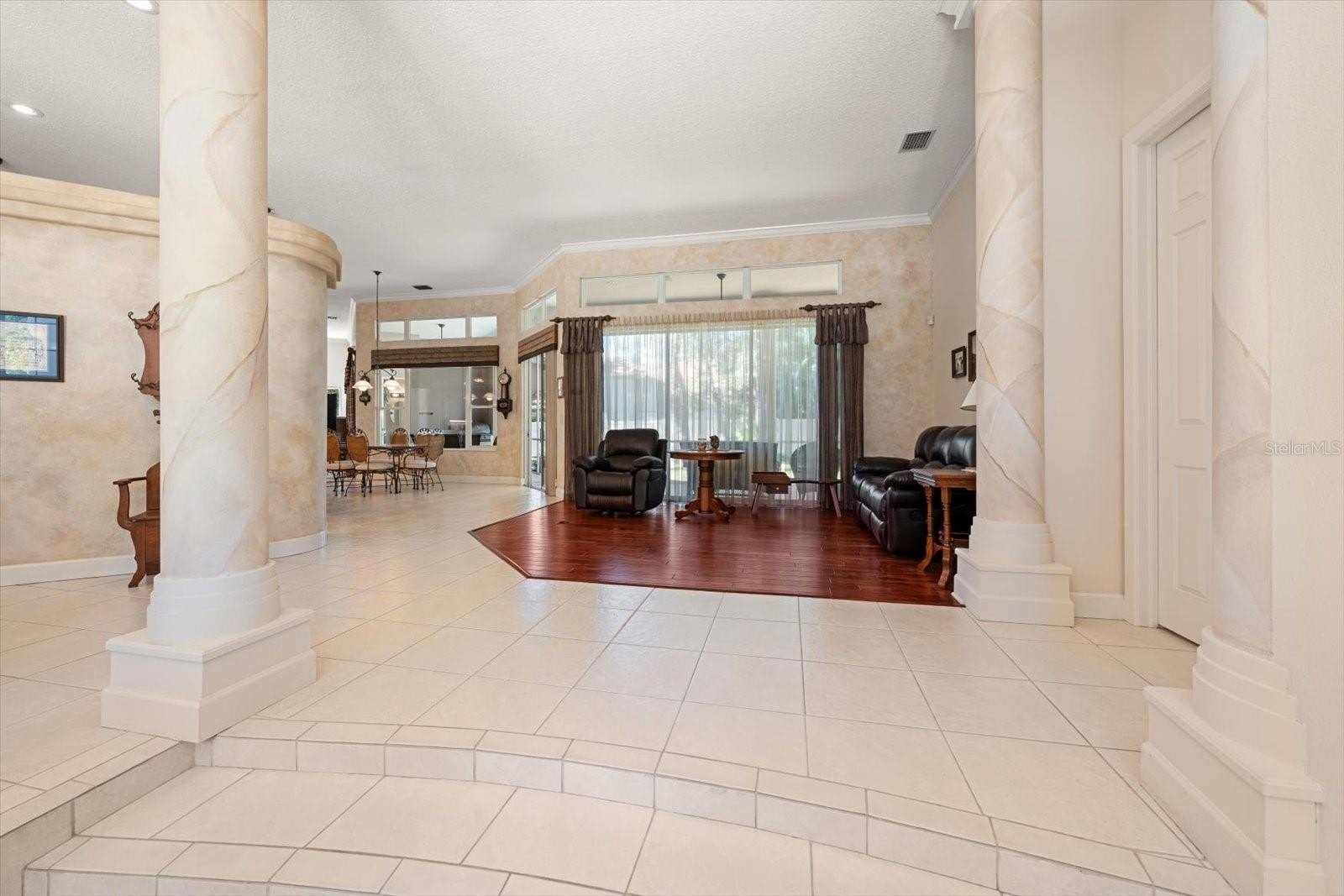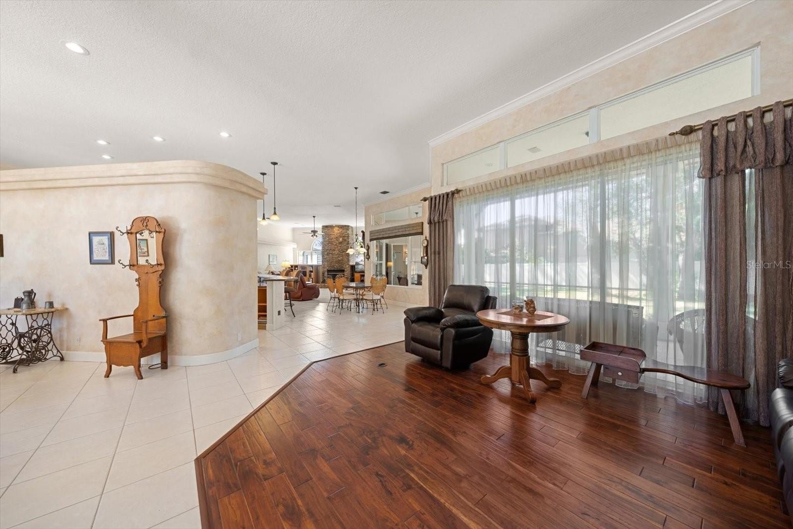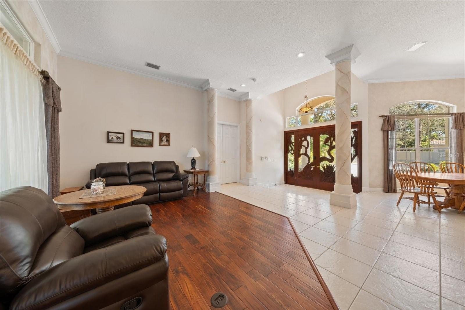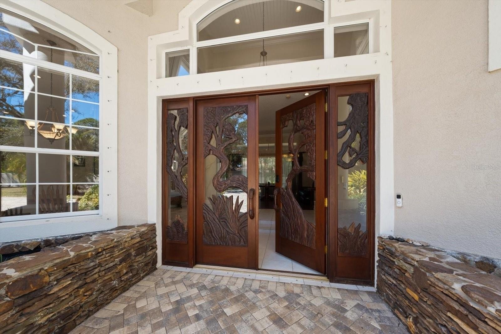 Step through hand-carved mahogany double doors into a light-filled interior with soaring 12-foot ceilings and an open, flowing layout. The home offers a formal dining area, formal living room with Acacia wood flooring, and a well-appointed kitchen with its own dining space, opening to a spacious great room highlighted by a stone fireplace.
