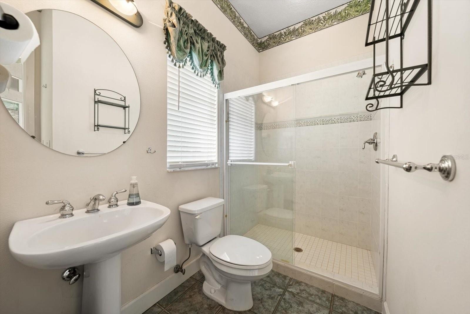 A split-bedroom design provides privacy with three additional spacious bedrooms and an updated hall bath featuring a glass walk-in shower. The generous laundry room includes granite countertops, extensive cabinetry, utility sink, and Whirlpool front-load washer and dryer.