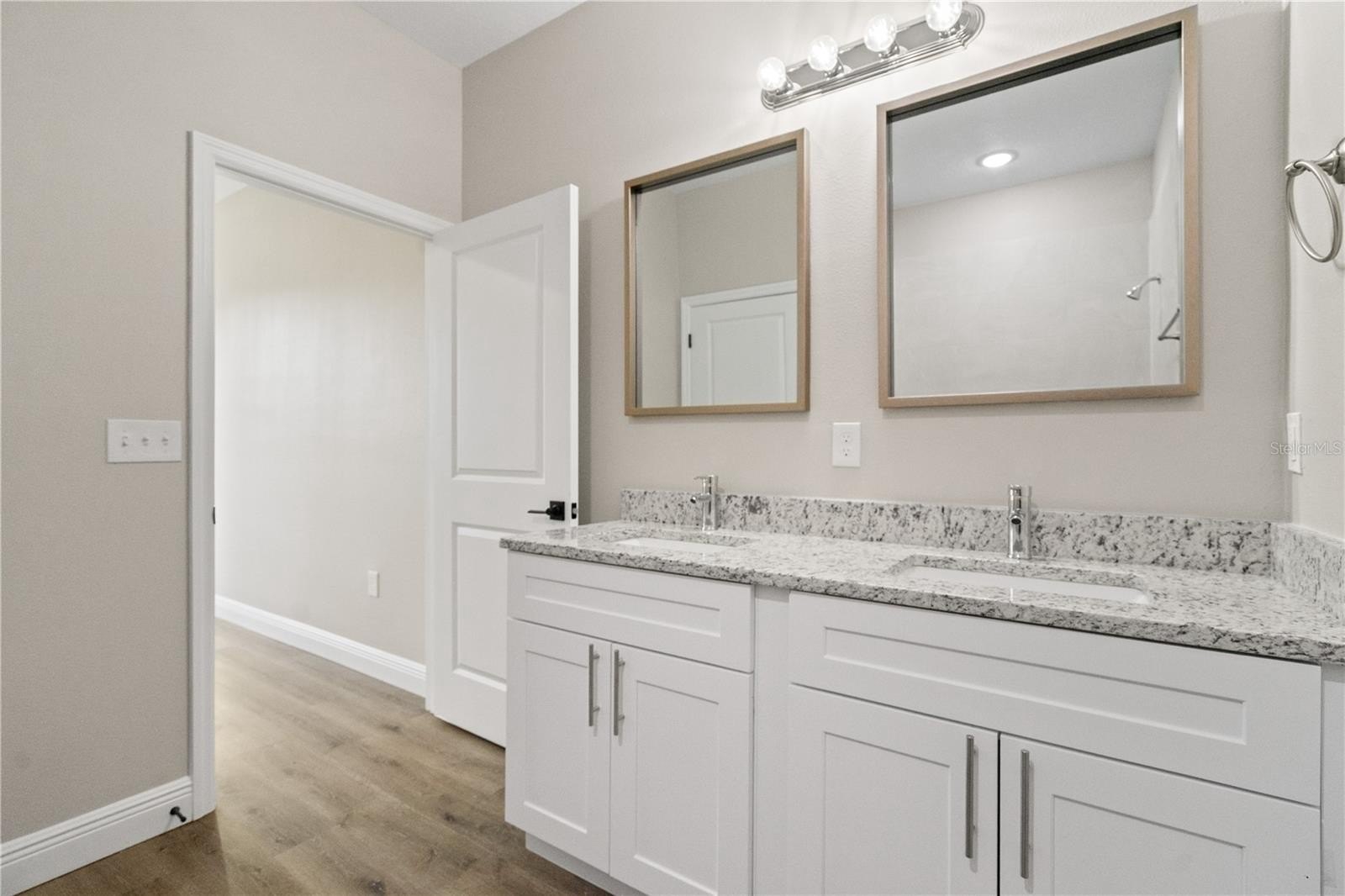 The spacious primary suite is thoughtfully placed on the opposite side of the home for extra privacy, complete with a sleek, modern bathroom and double vanities. On the other wing, you’ll find three additional bedrooms and another stylish bathroom — perfect for family, guests, or that home office you’ve been dreaming about.