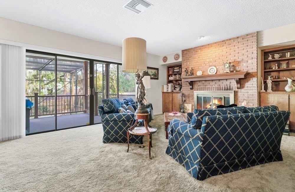 The bright eat-in kitchen offers crown molding, abundant cabinets and drawers, pantry, a built-in desk, newer appliances and blends seamlessly with the home’s neutral décor. A spacious great room showcases a wood-burning brick fireplace and double sliding doors that lead to the elevated covered back porch, where you can relax and enjoy serene lake views.