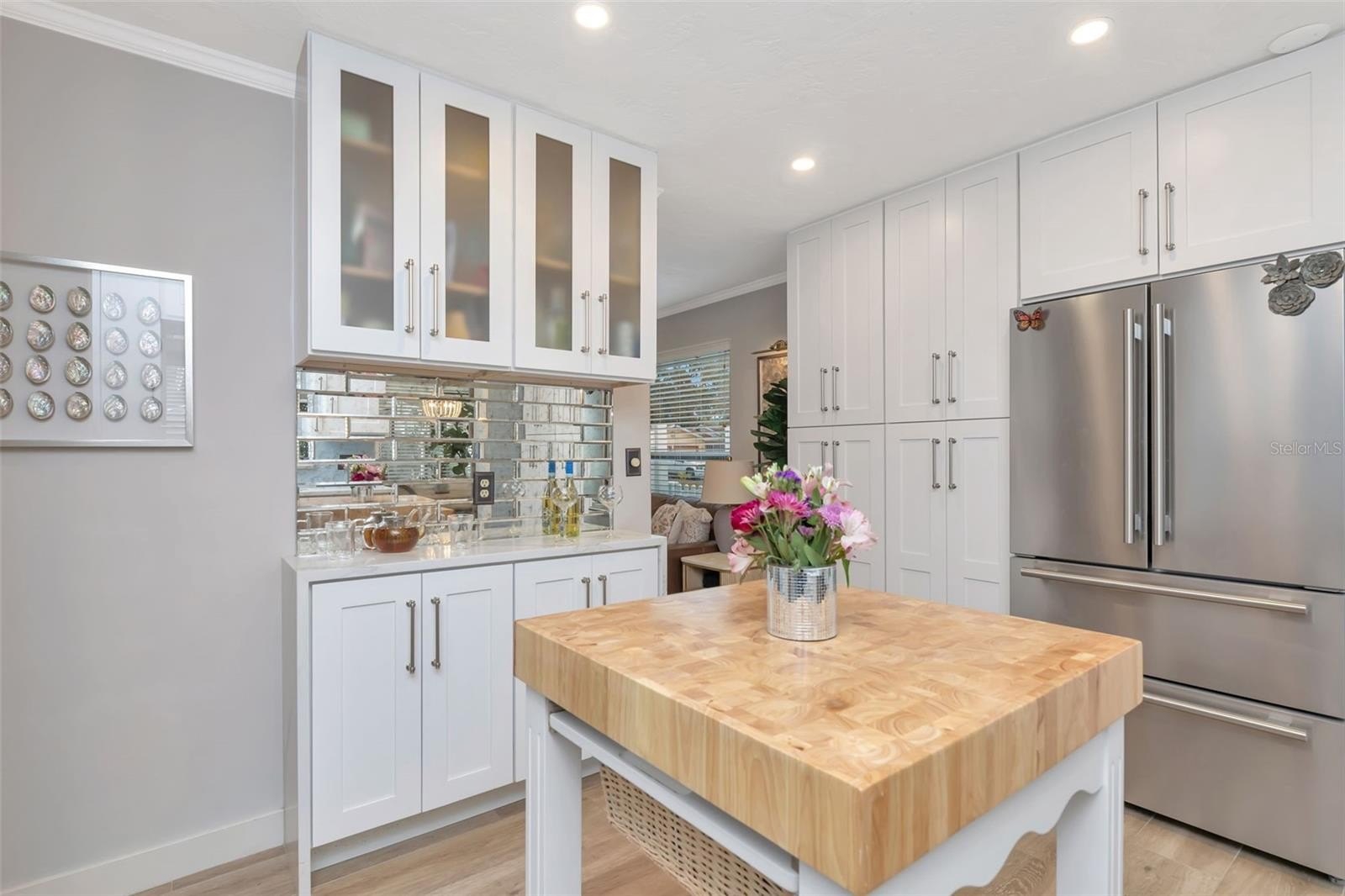 Luxury finish chef's kitchen with ample storage and high end appliances, imported hand crafted tile floor to ceiling back splash, waterfall "Gold Rush" quartz countertops, soft close floor to ceiling 24" deep custom cabinetry, coffee/ wine bar with custom antiqued mirror tile backsplash.