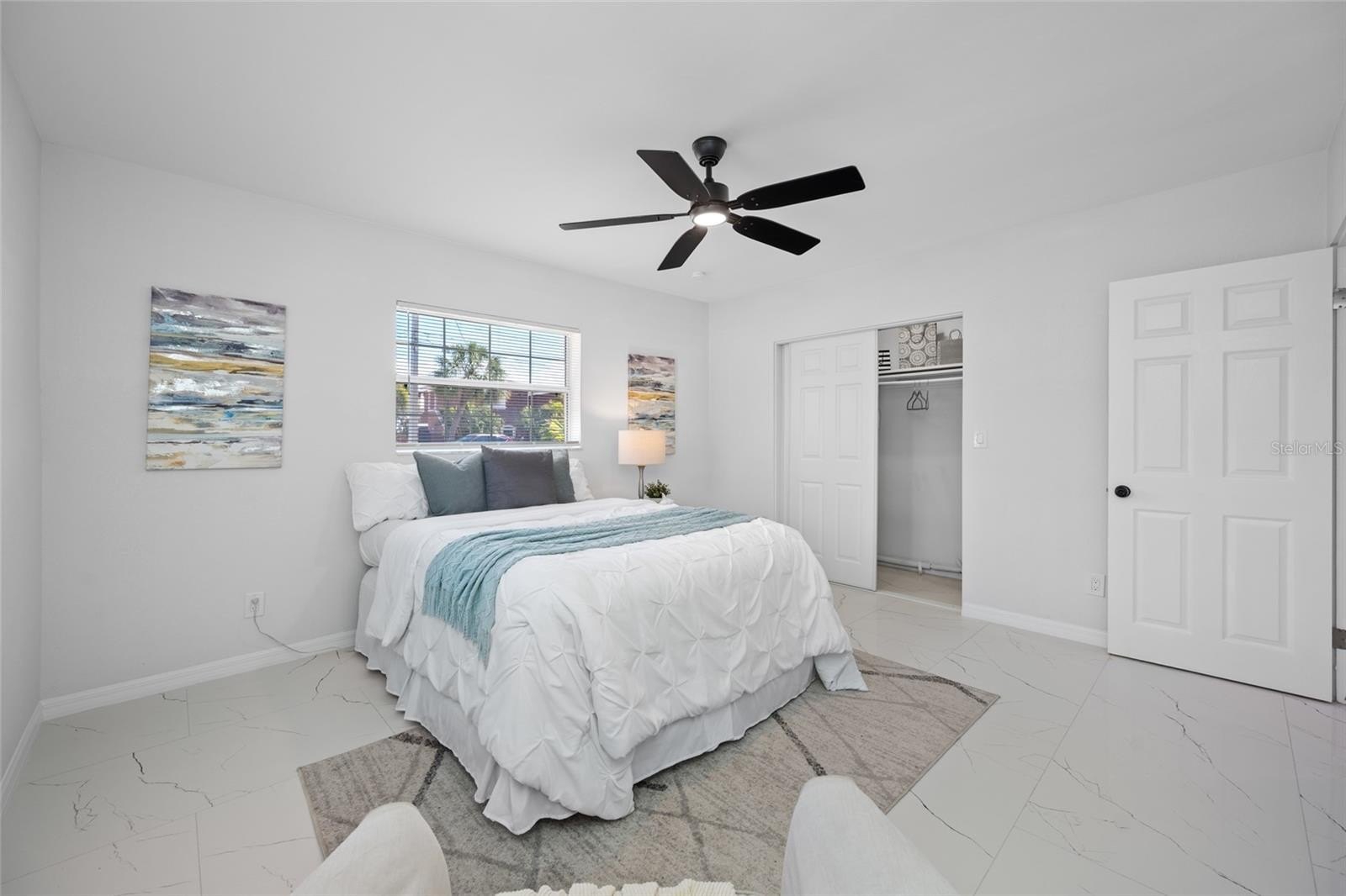 Step inside and be immediately impressed by the exquisite brand-new porcelain tile floors that run throughout the entire interior — a stunning, low-maintenance finish that perfectly complements the Florida lifestyle. The updated kitchen features soft-close cabinet doors and drawers and is outfitted with an all-new 2025 Frigidaire appliance suite, including a side-by-side refrigerator with in-door ice and water, a self-cleaning oven with 5-burner glass cooktop, a built-in dishwasher, and a built-in microwave. The home features extensive LED lighting throughout, including recessed lights in the kitchen, a 4-bulb fixture in the bathroom, LED-lit ceiling fans in every room, and LED fixtures in the dining and laundry rooms — plus LED lighting in both bedroom closets for added convenience. The bathroom itself offers a beautifully tiled open walk-in shower with a clean, airy, spa-like feel.