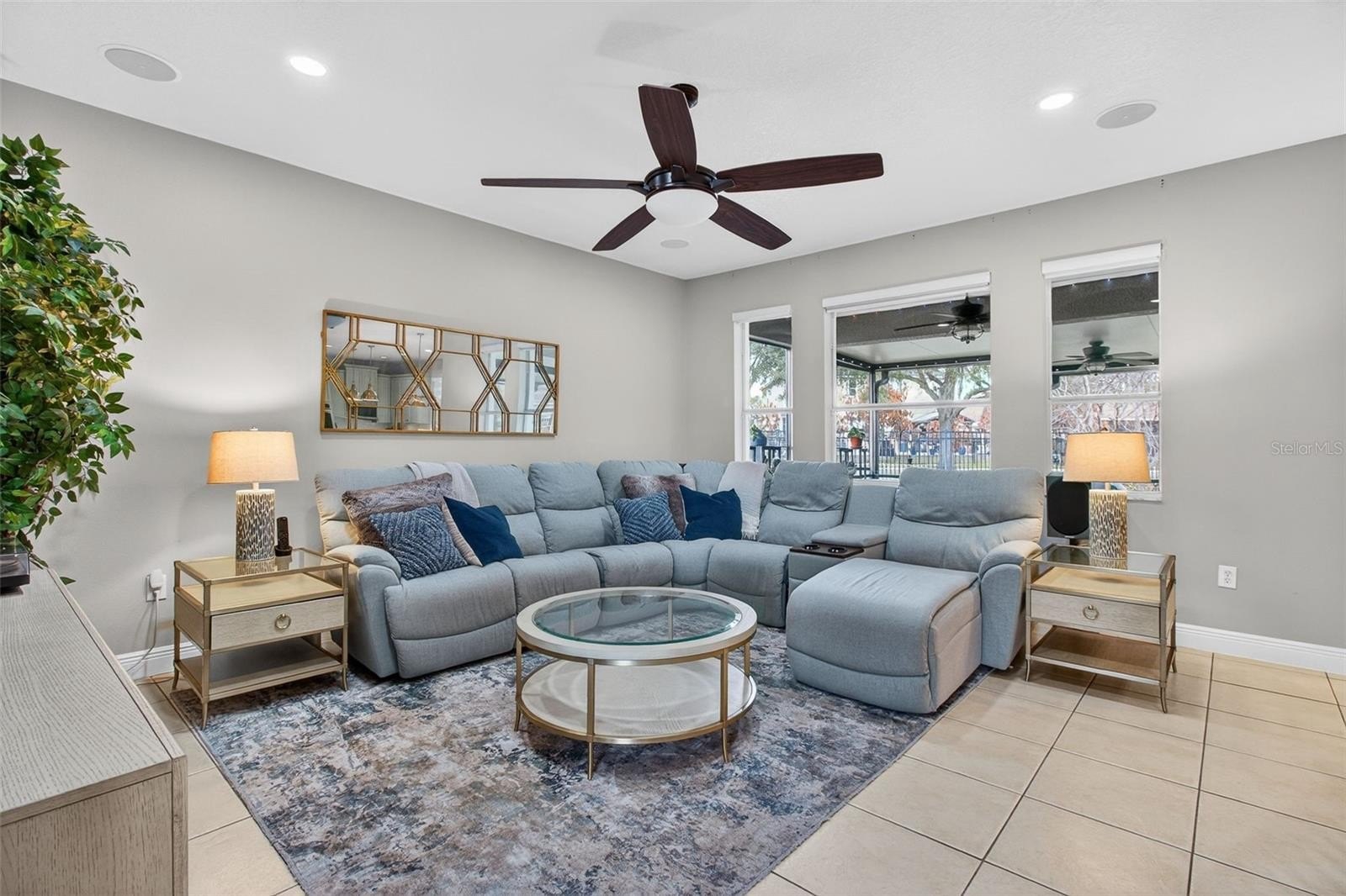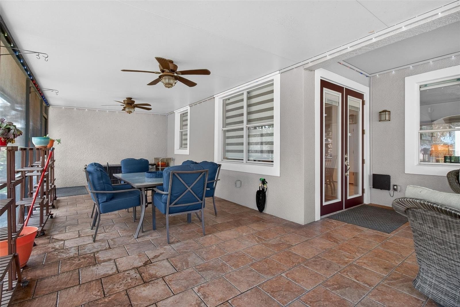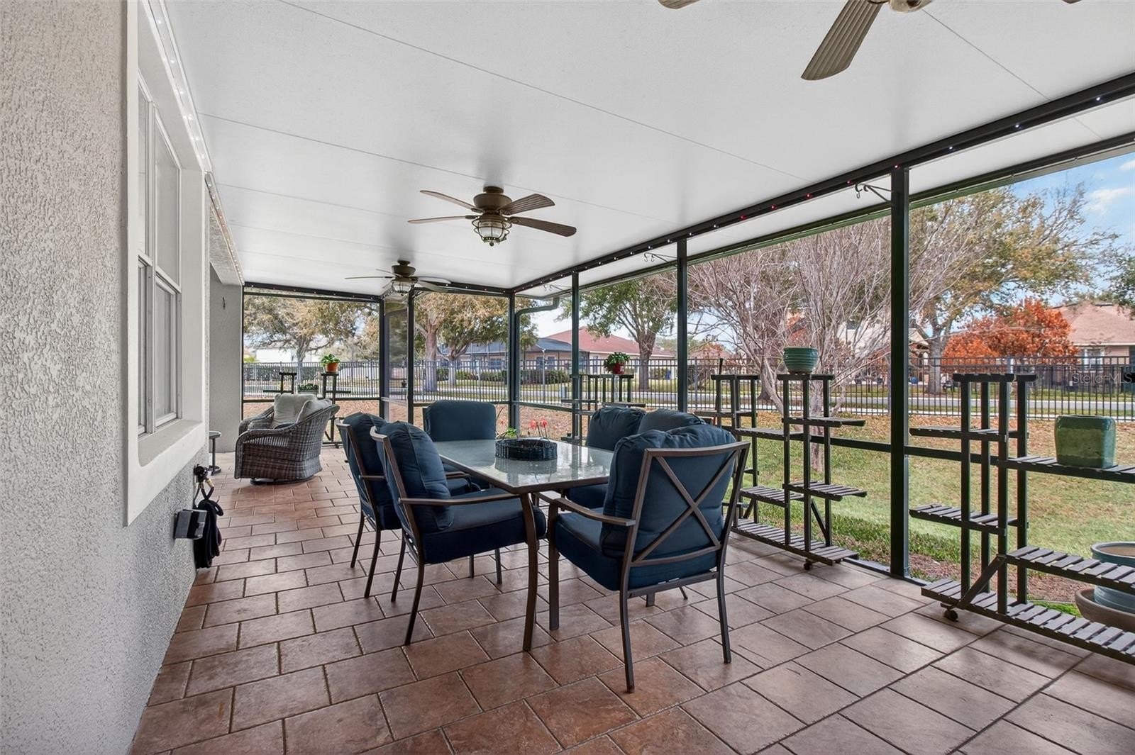 French doors lead to the expanded screened-in lanai, filled with natural light and enhanced with app-controlled trim lighting. The home also features remote-controlled blinds for modern convenience. The lanai includes insulated attic storage with flooring and shelving, plus an additional attic space accessed through the primary closet.