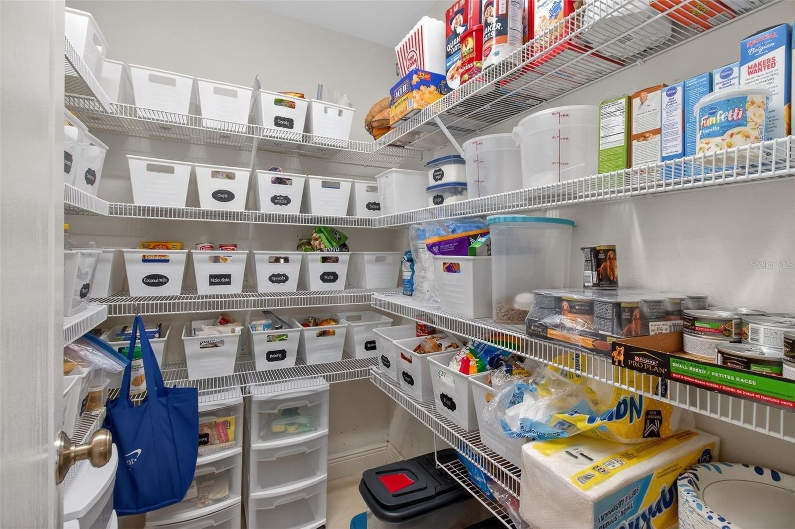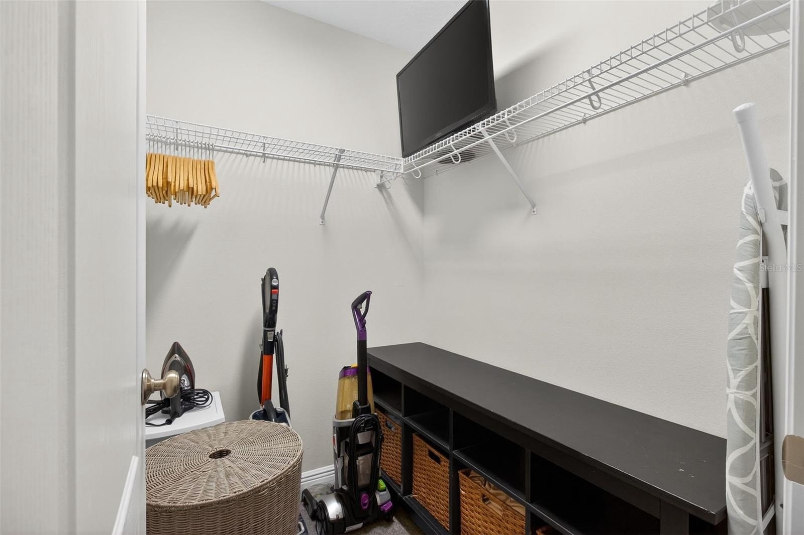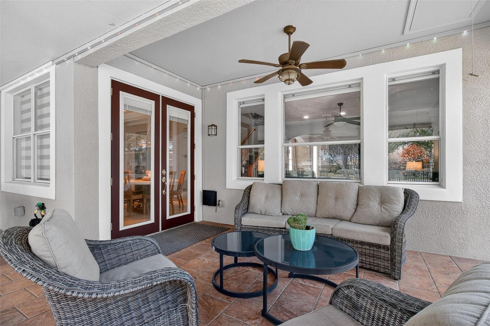 French doors lead to the expanded screened-in lanai, filled with natural light and enhanced with app-controlled trim lighting. The home also features remote-controlled blinds for modern convenience. The lanai includes insulated attic storage with flooring and shelving, plus an additional attic space accessed through the primary closet.