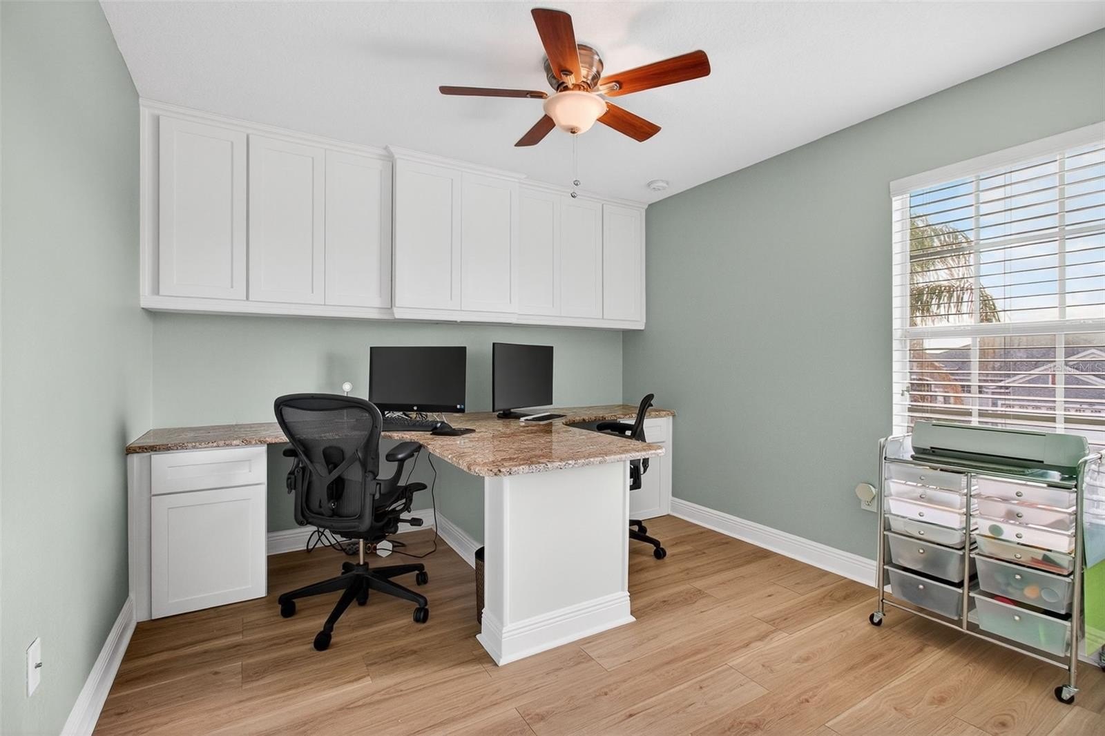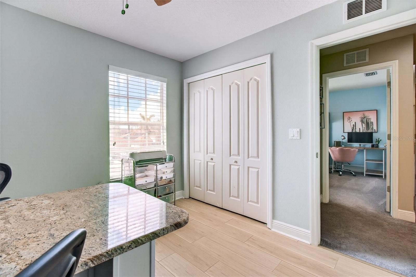 Upstairs offers exceptional space and versatility, thoughtfully designed for comfortable multigenerational living. You’ll find two spacious primary suites — ideal for a mother-in-law setup — along with two additional bedrooms, one currently used as an office featuring brand-new built-in cabinetry, custom desks and granite countertops. A generous open loft provides the perfect space for movie nights, a secondary living area, or a game room. Three of the bedrooms include custom closet systems, adding both style and elevated organization.