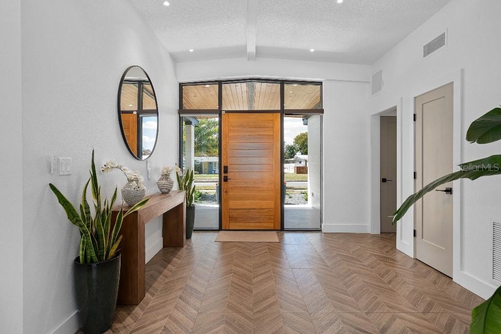 From the moment you arrive, the home’s striking curb appeal sets the tone. Mature landscaping, a custom wood front door, a Synergy wood ceiling on the front porch, and a newer roof create a warm and inviting welcome. Inside, the home’s character shines through with exposed beams, expansive spaces, and porcelain tile flooring laid in a distinctive chevron pattern.