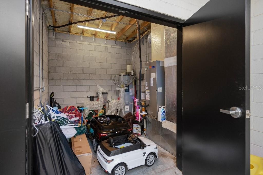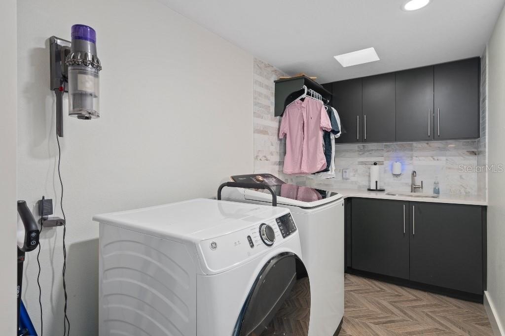 The spacious interior laundry room offers extensive storage, shelving, a utility sink, and direct access to the two-car carport, which is wired for EV charging.
