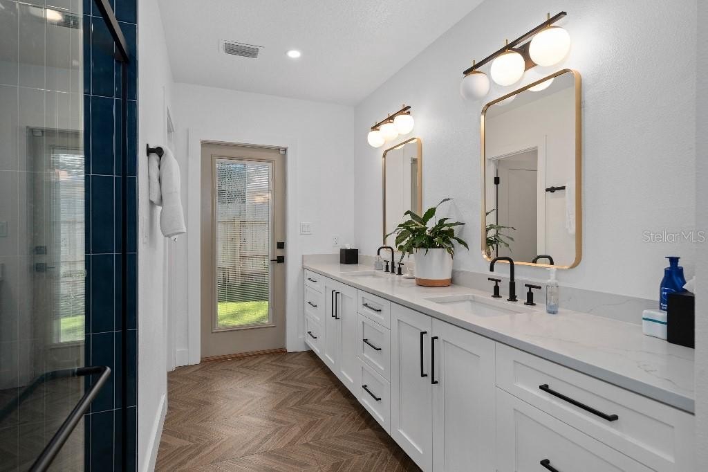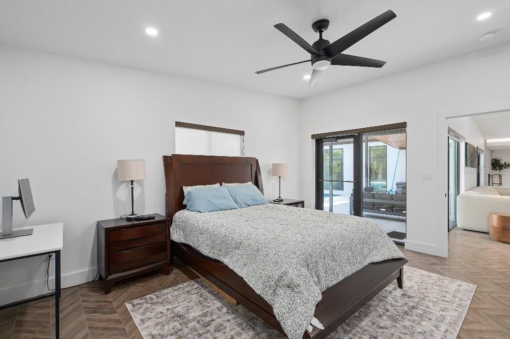 Just off the entry, a hallway leads to two spacious guest bedrooms and a shared full bath. A third bedroom features its own ensuite bathroom, walk-in closet, and private access to the pool area, making it perfect for guests, extended family, or multigenerational living.