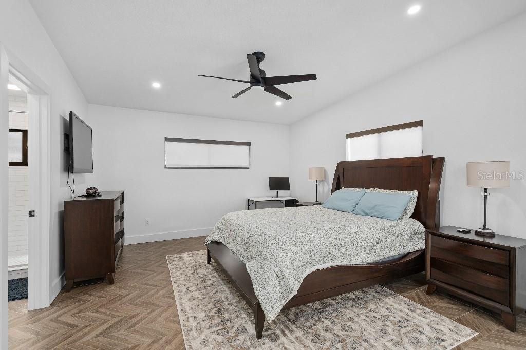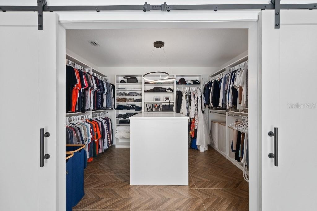 Privately situated on the opposite side of the home, the owner’s retreat feels like its own private wing. This space includes a sitting area, office space, storage, and a convenient pool bath with exterior access. The primary suite features more floor-to-ceiling windows with automated shades and an impressive custom walk-in closet complete with built-ins and an island. The spa-inspired bathroom offers a freestanding soaking tub, oversized shower, dual vanities, and private water closet, along with direct access to the outdoor living space.