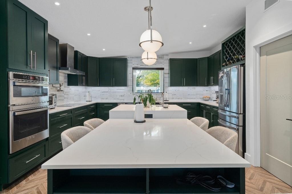 At the heart of the home is a designer kitchen built for both everyday living and entertaining. Highlights include quartz countertops, custom tile backsplash, soft-close cabinetry, built-ins, a large island with prep sink and seating, GE Profile appliances, and a walk-in pantry. Adjacent to the kitchen, a cozy secondary sitting area anchored by a wood-burning fireplace provides the perfect gathering space.
