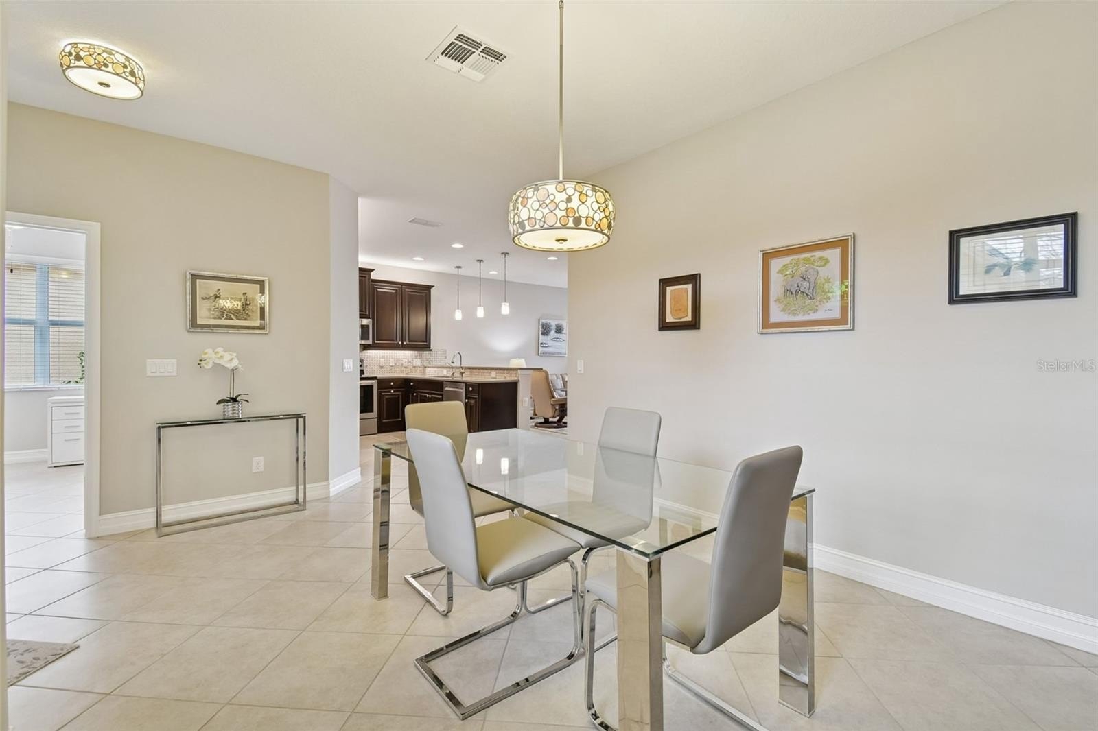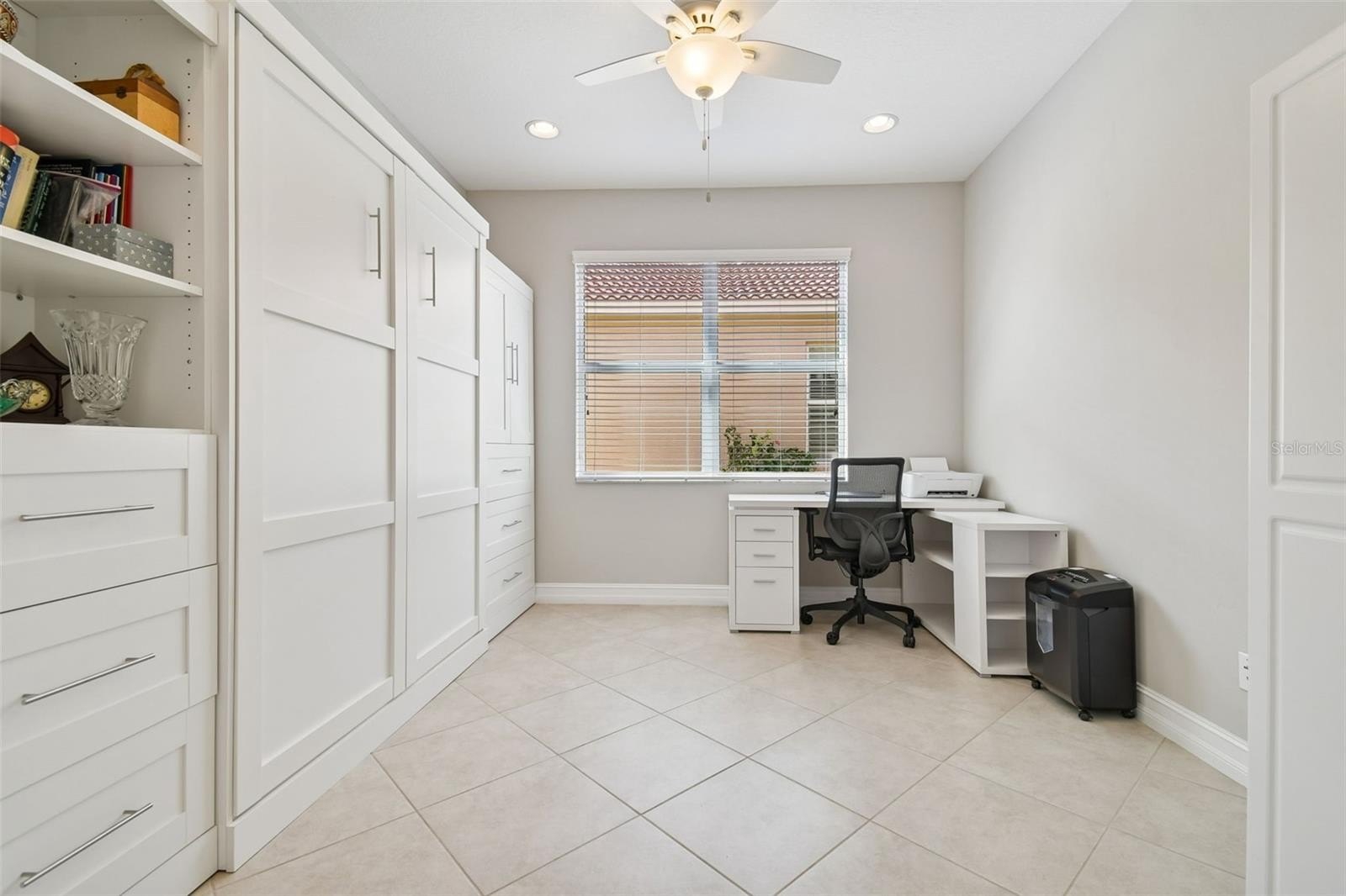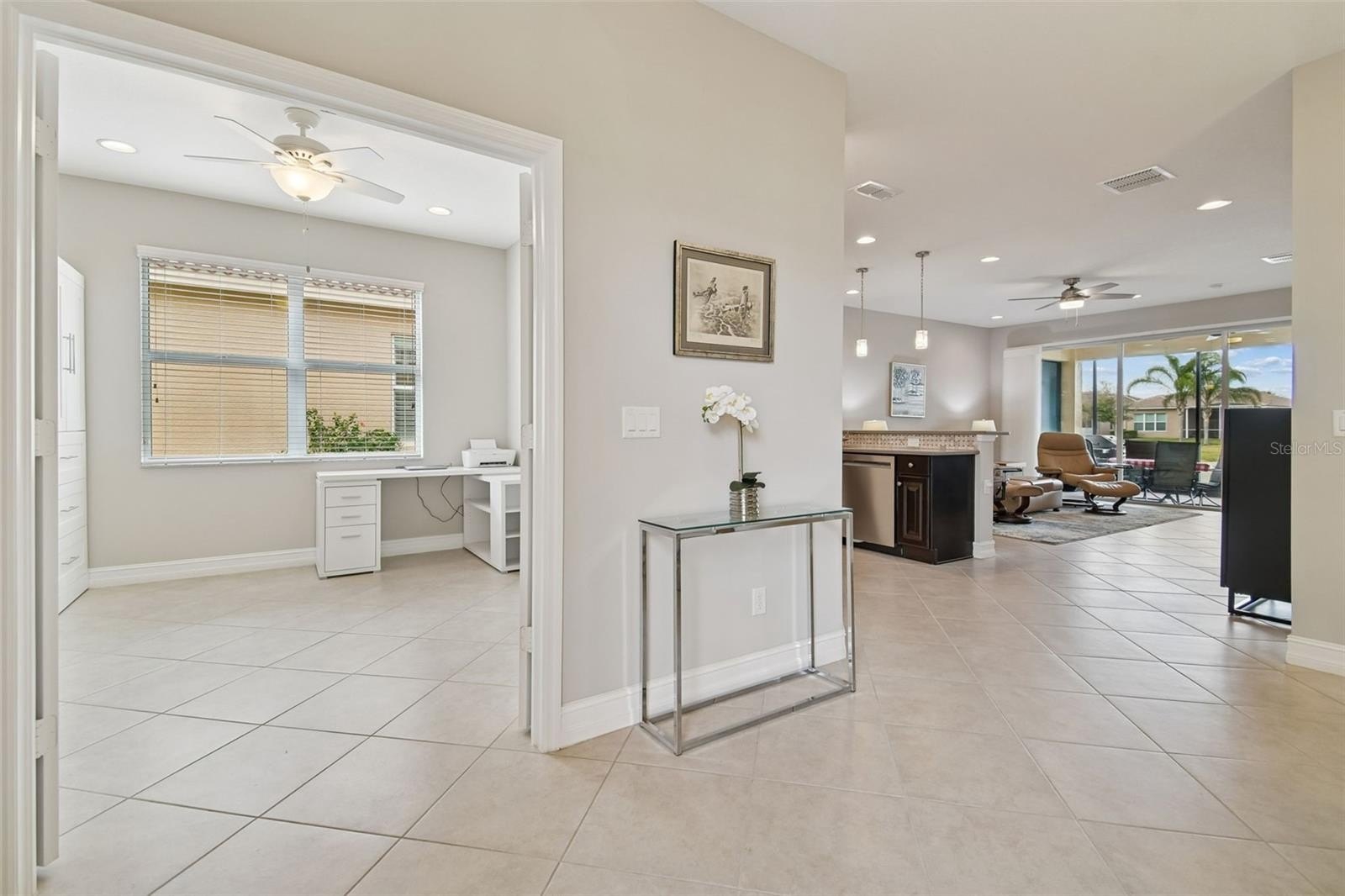An opportunity to own a Nantucket model villa with a water view occurs very rarely! This is one of only a few Nantucket floor plans built during the final phases of the Valencia Lakes community development by GL Homes, and these homes can only be found on Marble Springs Circle.This villa sits on a prime lot with calm and peaceful water views and features numerous high-quality upgrades and offers 2 bdrms, den/optional 3rd bdrm, 2 full baths and a 2-car garage. Large screened front patio provides an additional private outdoor space—perfect for relaxing or entertaining while enjoying beautiful Florida days. Upon entering, you are greeted by a spacious open floor plan with 9-foot ceilings. Elegant 18x18 ceramic tile is installed diagonally throughout the main living areas, while high-quality carpeting, installed just two years ago, adds comfort to the primary and second bdrms. Luxurious gourmet kitchen features upgraded 42" wood cabinets with crown molding, a full-extension glide system with soft-close drawers, upper and lower cabinet lighting, and a custom built-in cabinet pantry. Beautiful quartz countertops include an 18" serving bar extension for additional seating, complemented by a timeless 'basket-weave' style washed stone backsplash. The kitchen is equipped with GE stainless steel appliances, including a nearly new French-door refrigerator, as well as a reverse osmosis water filtration system. This villa model uniquely offers the option to install an exhaust vent system from the kitchen directly to the exterior. Primary bdrm, highlighted by a coffered ceiling, includes two generously sized walk-in closets and an elegant ensuite bath with a double vanity, undermount sinks, and quartz countertops. The bath also features a separate walk-in shower with a built-in corner bench, designed for comfort and stability, along with a spacious linen closet. Tile in both baths extends to the ceiling and is enhanced with a decorative horizontal listello accent and built-in niche. Bdrm 2 also includes a walk-in closet. French door lead to the den/optional 3rd bdrm, where a custom built-in Murphy bed and shelving are included with the sale. Lighting and comfort have been thoughtfully upgraded throughout the home, including updated fans and light fixtures, recessed lighting in the great room, bdrms, den, and lanai, and stylish pendant lighting in the kitchen.