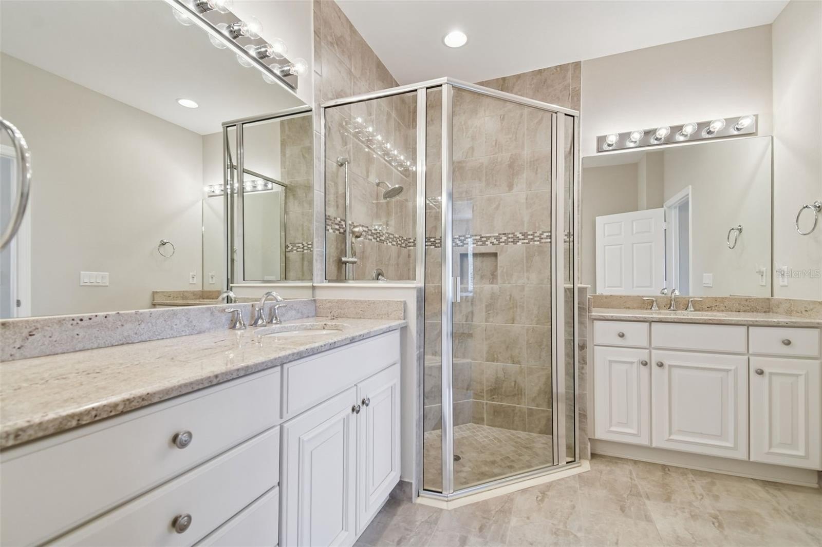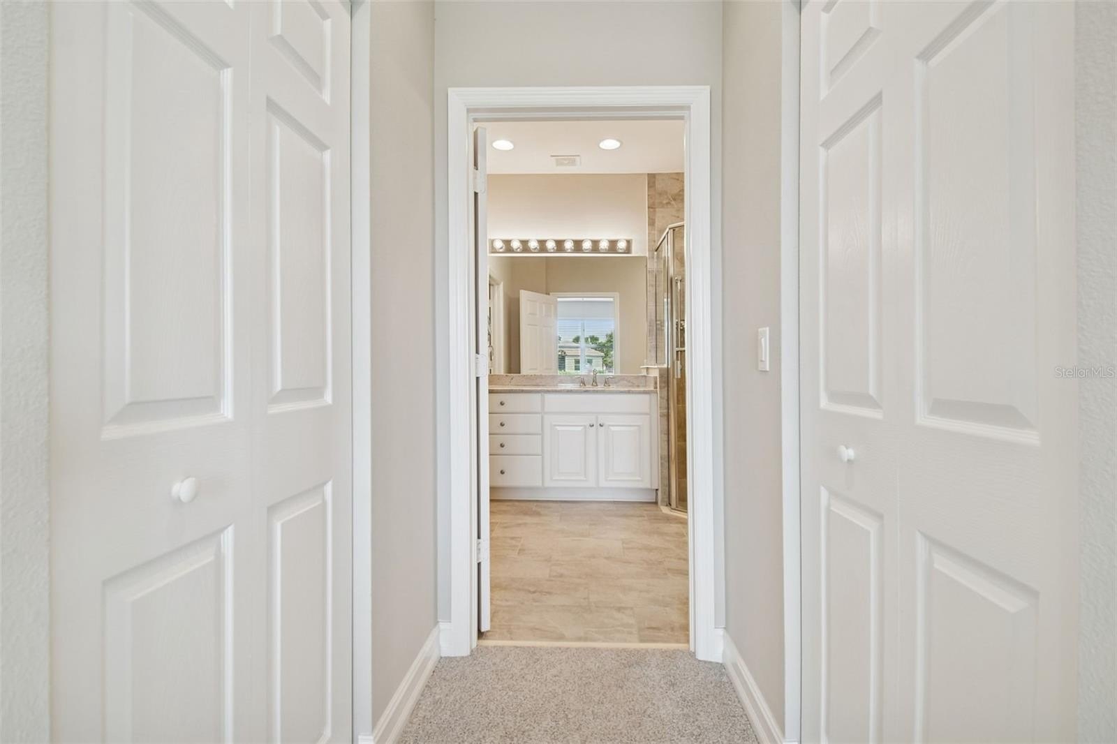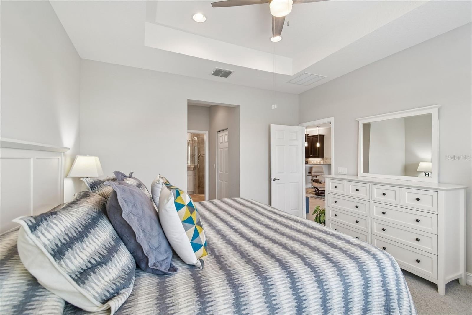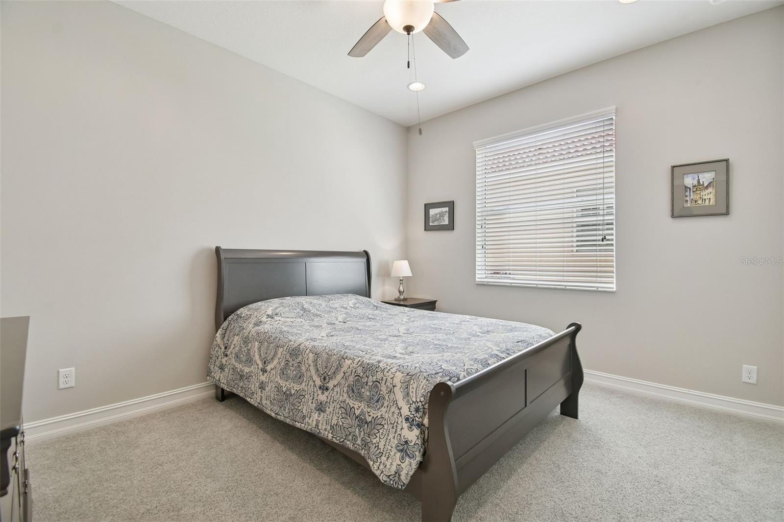 An opportunity to own a Nantucket model villa with a water view occurs very rarely! This is one of only a few Nantucket floor plans built during the final phases of the Valencia Lakes community development by GL Homes, and these homes can only be found on Marble Springs Circle.This villa sits on a prime lot with calm and peaceful water views and features numerous high-quality upgrades and offers 2 bdrms, den/optional 3rd bdrm, 2 full baths and a 2-car garage. Large screened front patio provides an additional private outdoor space—perfect for relaxing or entertaining while enjoying beautiful Florida days. Upon entering, you are greeted by a spacious open floor plan with 9-foot ceilings. Elegant 18x18 ceramic tile is installed diagonally throughout the main living areas, while high-quality carpeting, installed just two years ago, adds comfort to the primary and second bdrms. Luxurious gourmet kitchen features upgraded 42" wood cabinets with crown molding, a full-extension glide system with soft-close drawers, upper and lower cabinet lighting, and a custom built-in cabinet pantry. Beautiful quartz countertops include an 18" serving bar extension for additional seating, complemented by a timeless 'basket-weave' style washed stone backsplash. The kitchen is equipped with GE stainless steel appliances, including a nearly new French-door refrigerator, as well as a reverse osmosis water filtration system. This villa model uniquely offers the option to install an exhaust vent system from the kitchen directly to the exterior. Primary bdrm, highlighted by a coffered ceiling, includes two generously sized walk-in closets and an elegant ensuite bath with a double vanity, undermount sinks, and quartz countertops. The bath also features a separate walk-in shower with a built-in corner bench, designed for comfort and stability, along with a spacious linen closet. Tile in both baths extends to the ceiling and is enhanced with a decorative horizontal listello accent and built-in niche. Bdrm 2 also includes a walk-in closet. French door lead to the den/optional 3rd bdrm, where a custom built-in Murphy bed and shelving are included with the sale. Lighting and comfort have been thoughtfully upgraded throughout the home, including updated fans and light fixtures, recessed lighting in the great room, bdrms, den, and lanai, and stylish pendant lighting in the kitchen.