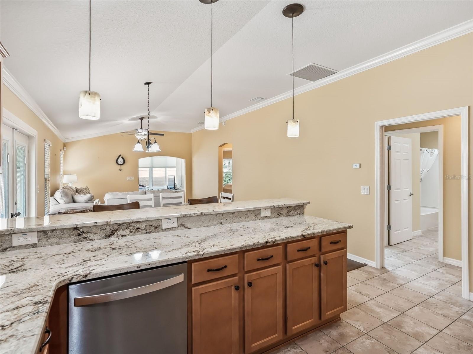 Inside, the home showcases granite countertops in the kitchen and bathrooms, stainless steel appliances, crown molding, arched doorways, and pendant lighting. The primary suite features a tray ceiling, spacious walk-in closet, and an en-suite bath with a frameless glass shower door.