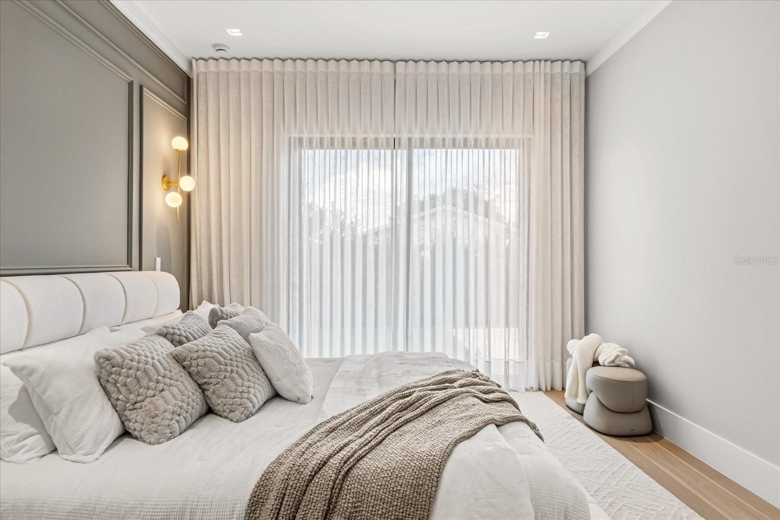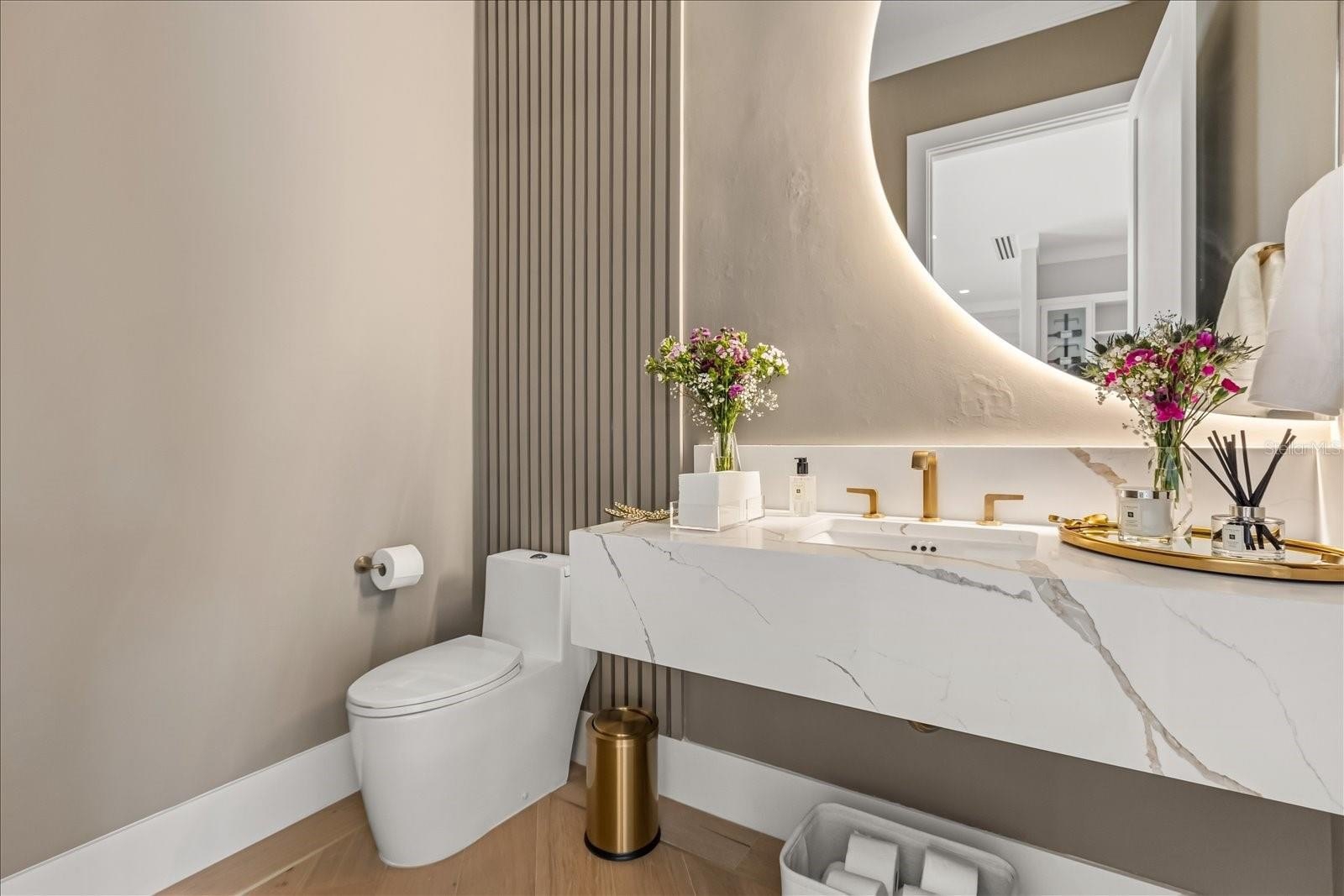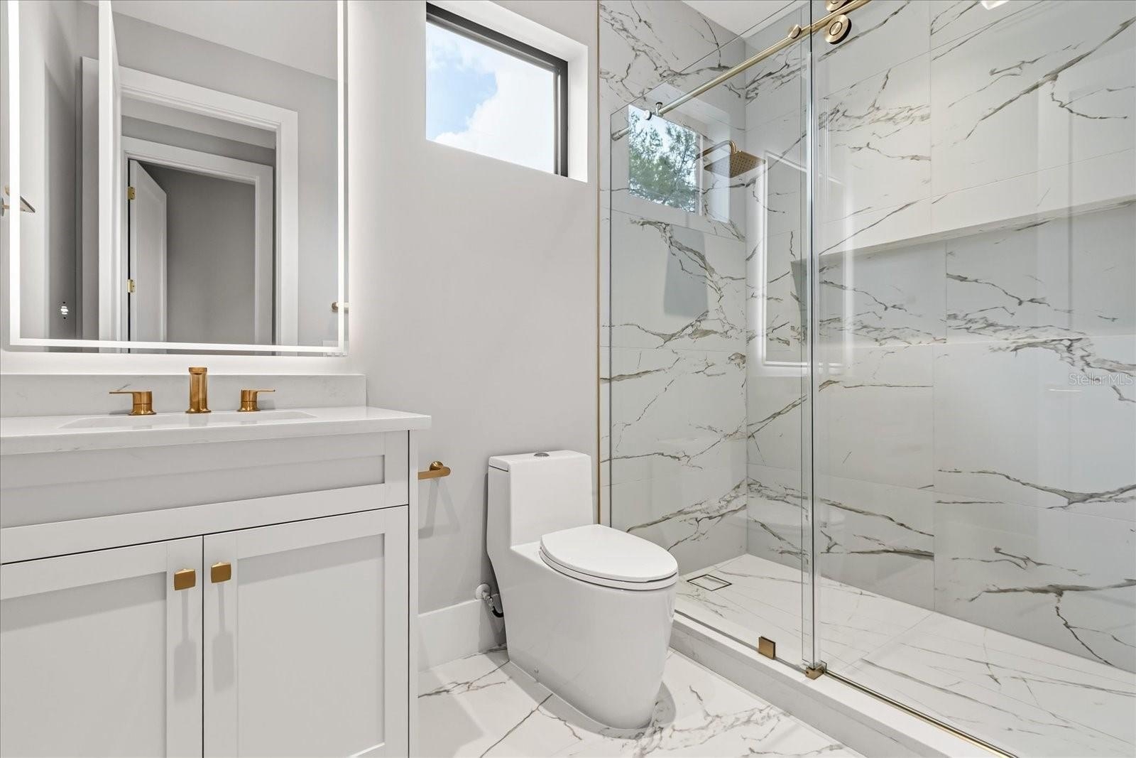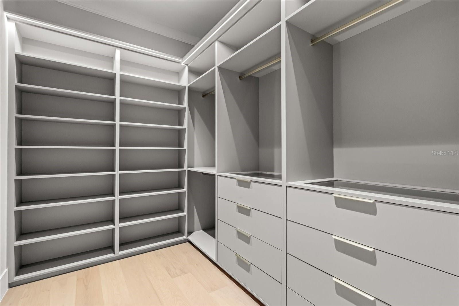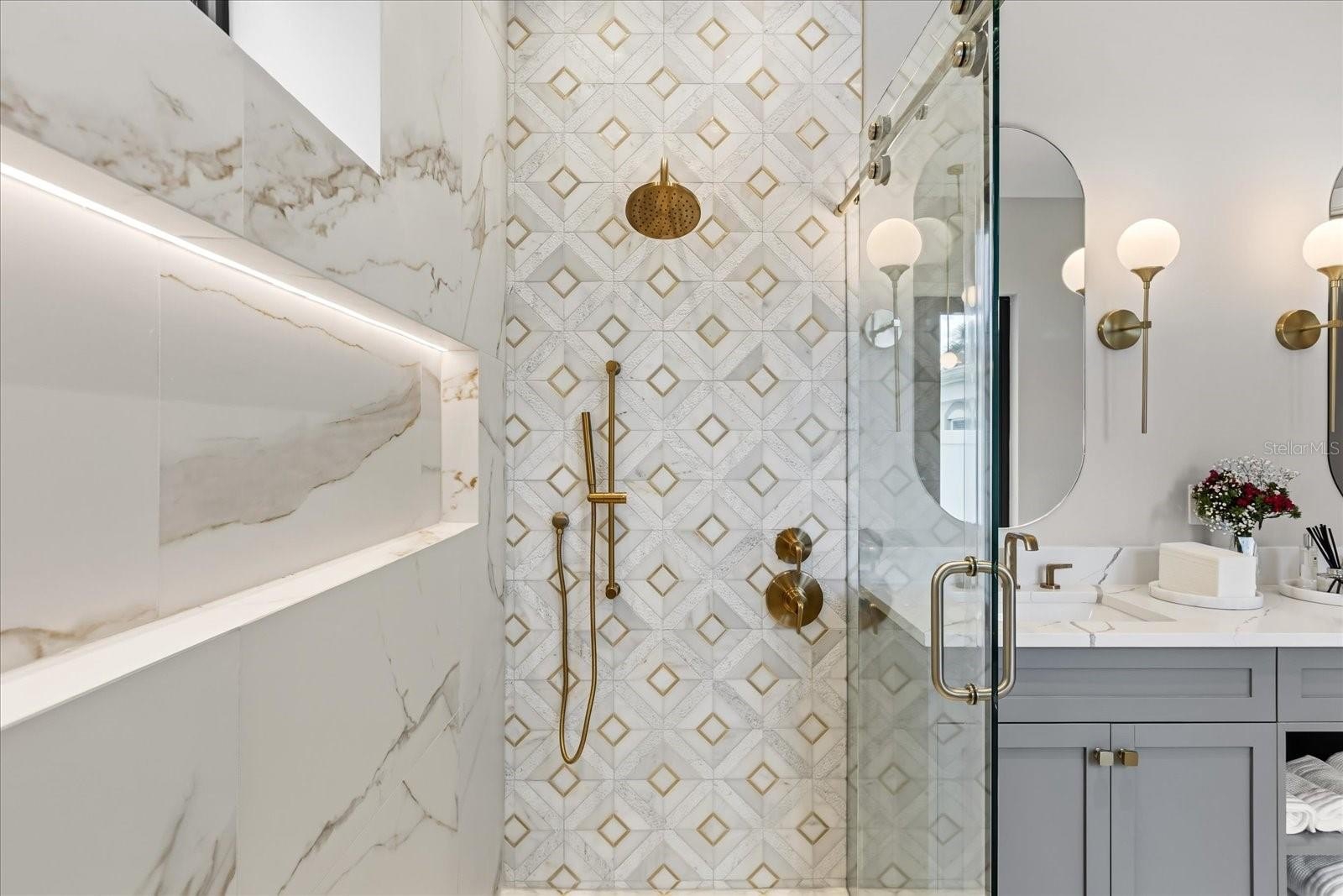 The first-floor primary suite serves as a private retreat, offering elegant finishes and direct access to the backyard oasis. The spa-inspired bathroom features Calacatta Laza Oro countertops, marble shower flooring, and an expansive double shower with dual showerheads and hand-held fixtures by Signature in the beautiful brushed gold. An oversized soaking tub anchors the space, and completing the space is an expansive walk-in closet complete with custom built-in's enhanced with lighting and glass to showcase your finest watches and jewelry.