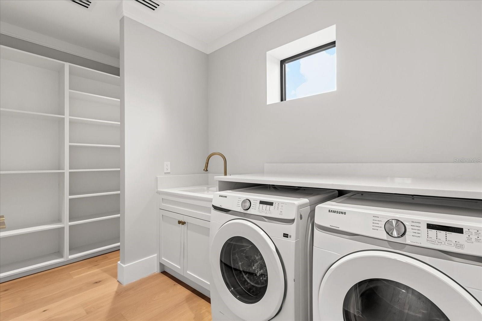 Upstairs, an oversized loft provides flexible space ideal for a media room, secondary lounge, or study. Four generously sized en-suite bedrooms, each with built in walk-in closets, a full a upstairs laundry room with Samsung front-load washer and dryer and a large storage area featuring custom shelving and storage.