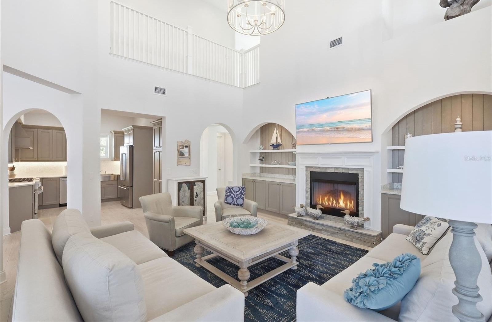 The first floor features an expansive ~960 SF 3-car garage with large storage rooms. On the second level, soaring 20+ foot ceilings and ashwood floors create a stunning main living space complete with a natural gas fireplace, impact doors and windows, a natural gas range, laundry room, guest bedroom, full bath, and bonus room/office.