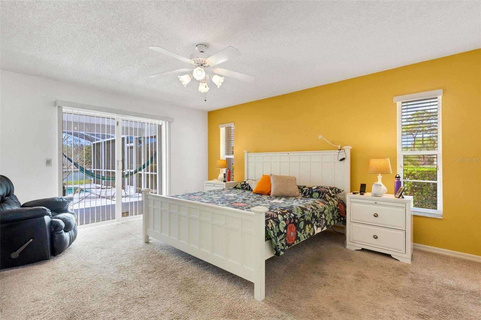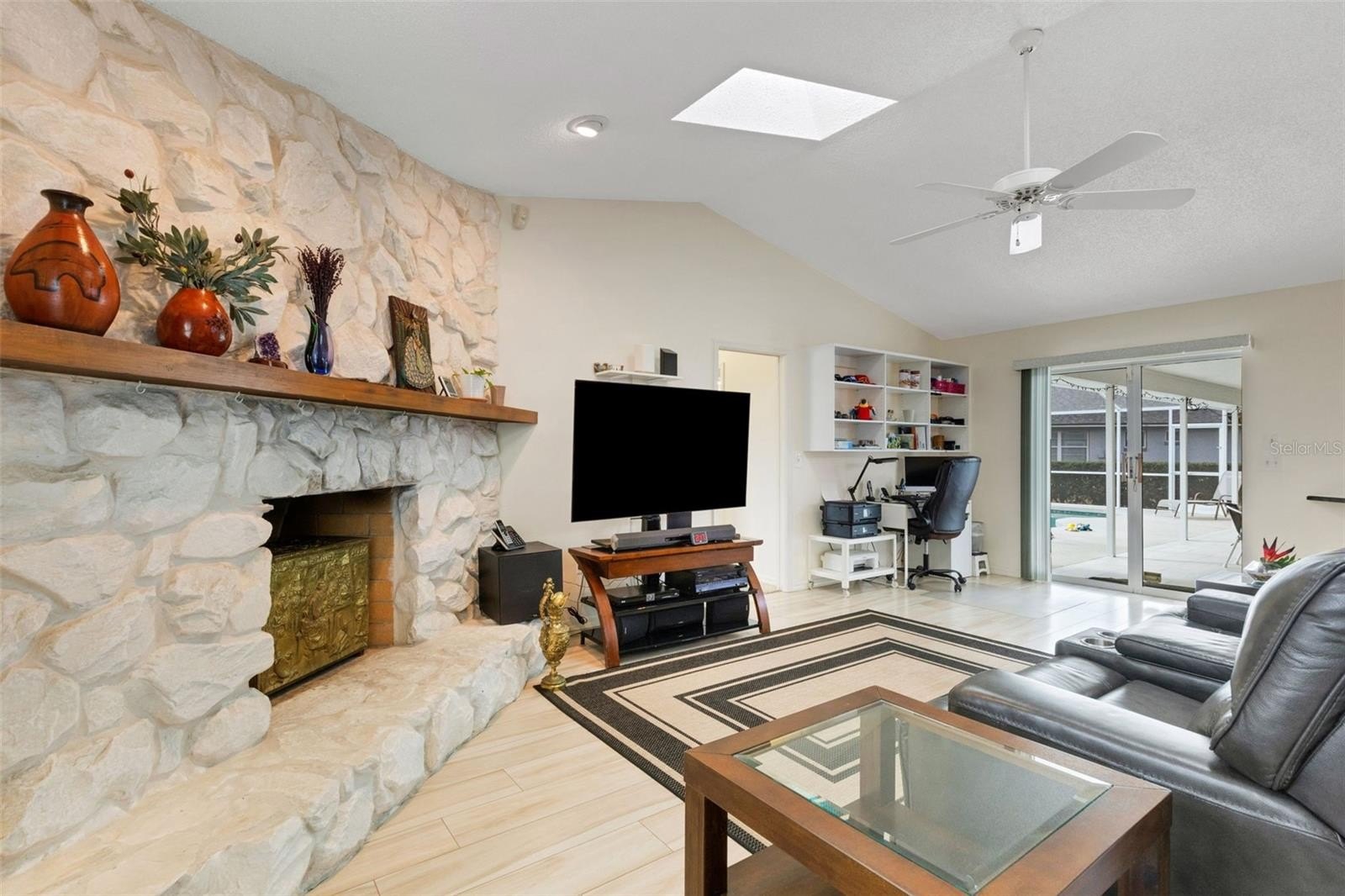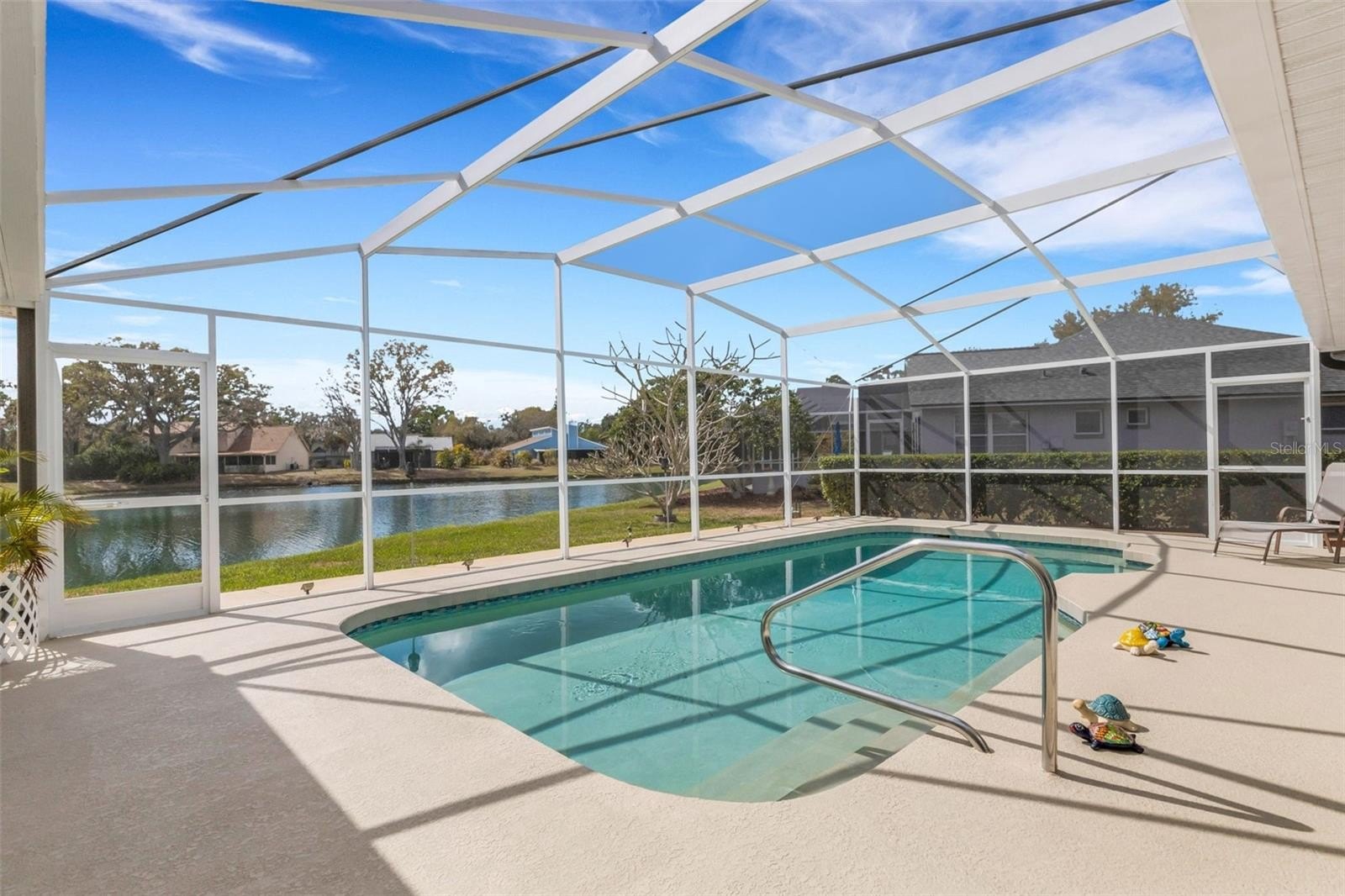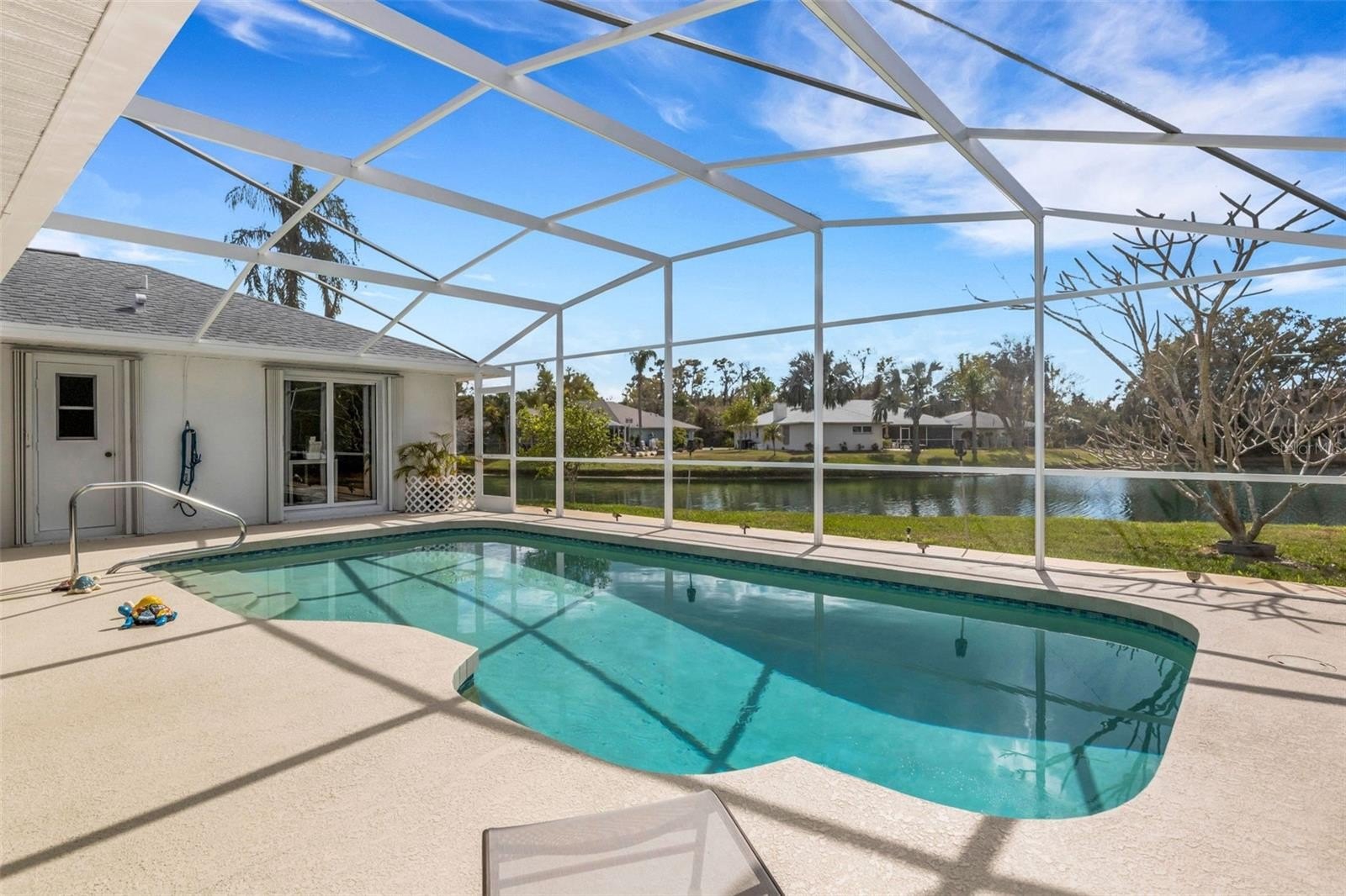 LET THE SUN SHINE IN! Come explore this waterfront beauty in Cedar Creek - North Sarasota, where serene pond views and indoor-outdoor living come together beautifully. This 3-bedroom, 2-bath home offers approximately 2,100 square feet of living space on a generously sized lot perfectly positioned to capture water views from nearly every room. Double front doors open to a vaulted-ceiling living room with sliders that immediately draw your eye to the sparkling pool and wide pond view beyond. The natural light pouring in creates a warm and inviting first impression that only gets better throughout the home. Designed for both comfort and entertaining, the layout includes separate living and dining rooms plus a stunning family room featuring a stone wood-burning fireplace and a full wall of custom built-ins adjacent to the kitchen. The bright kitchen offers shaker cabinetry, dark granite countertops, a pass-through window to the lanai, a newer dark stainless GAS range giving you the convenience of propane cooking — a true chef’s dream. All three bedrooms feature walk-in closets and mounted 50+” TVs, with the 2nd bath featuring a door to access the pool area. The spacious primary suite includes a custom-designed closet maximizing every inch of space and sliding glass doors that open directly to the lanai and pool. Outdoor living shines with four sets of sliders leading to the pool area, creating seamless indoor-outdoor flow. The large lanai is under roof, offering plenty of room to add an outdoor kitchen and dining area. The screened pool enclosure was replaced in 2024, and poured sidewalks surround the home for clean, easy access all around.