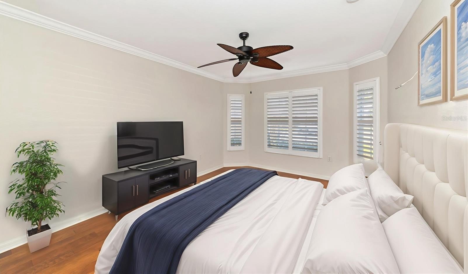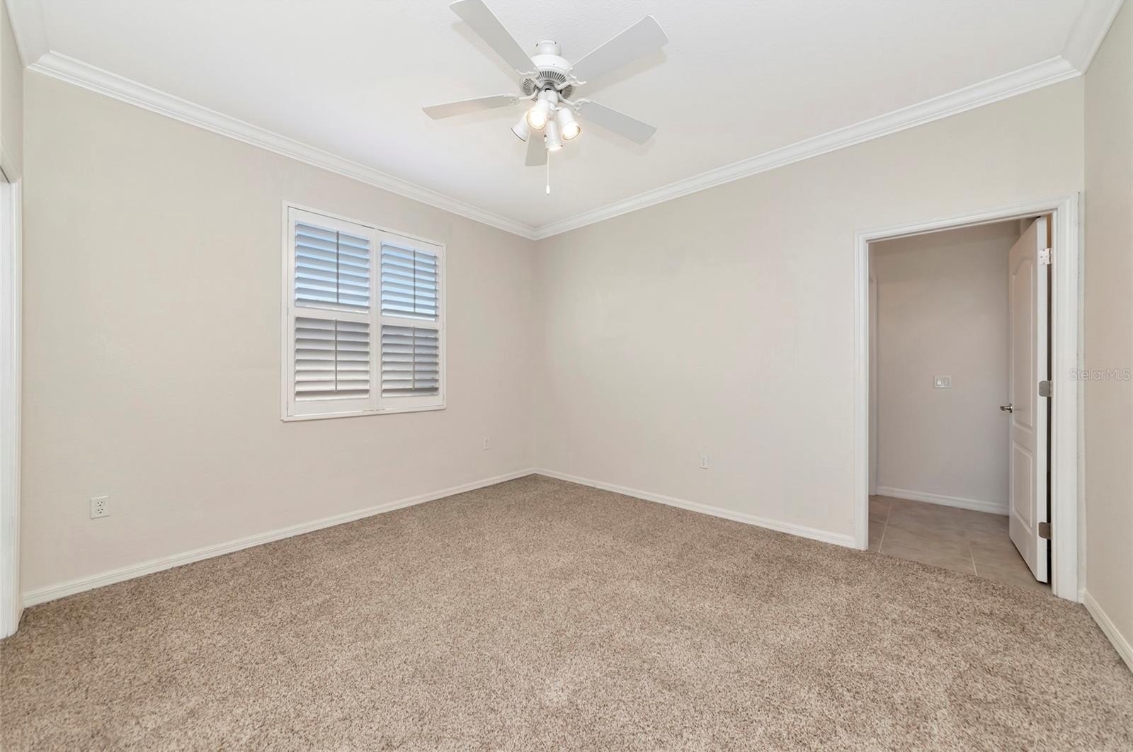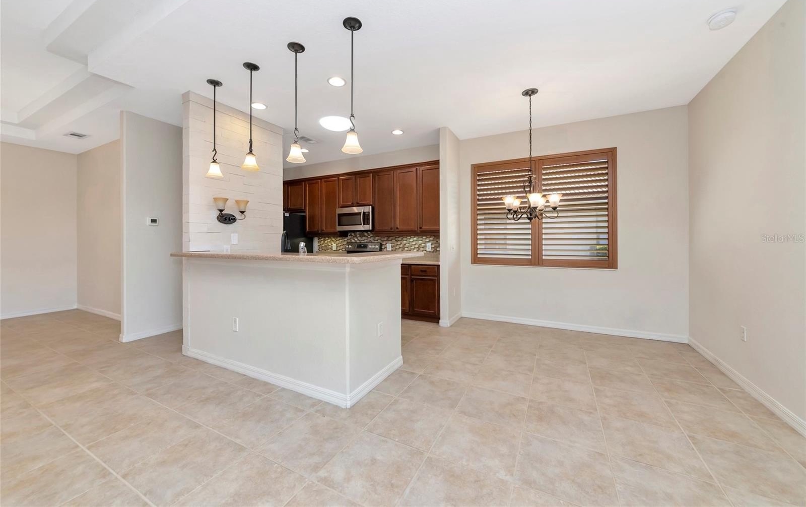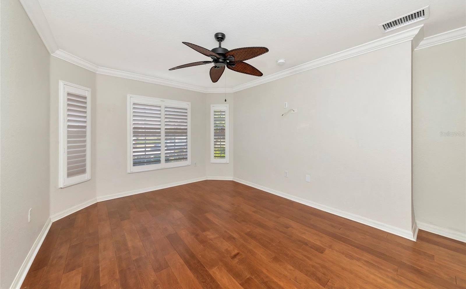 Inside, you'll find a bright, open-concept layout with upgraded plantation shutters. The spacious kitchen features solid-surface countertops, ample cabinetry, and a convenient breakfast bar. The private owner’s suite includes a walk-in closet and en-suite bathroom, while the separate guest suite also offers a walk-in closet and private bath. An additional guest bedroom and a versatile den provide even more flexibility for work, hobbies, or hosting visitors.