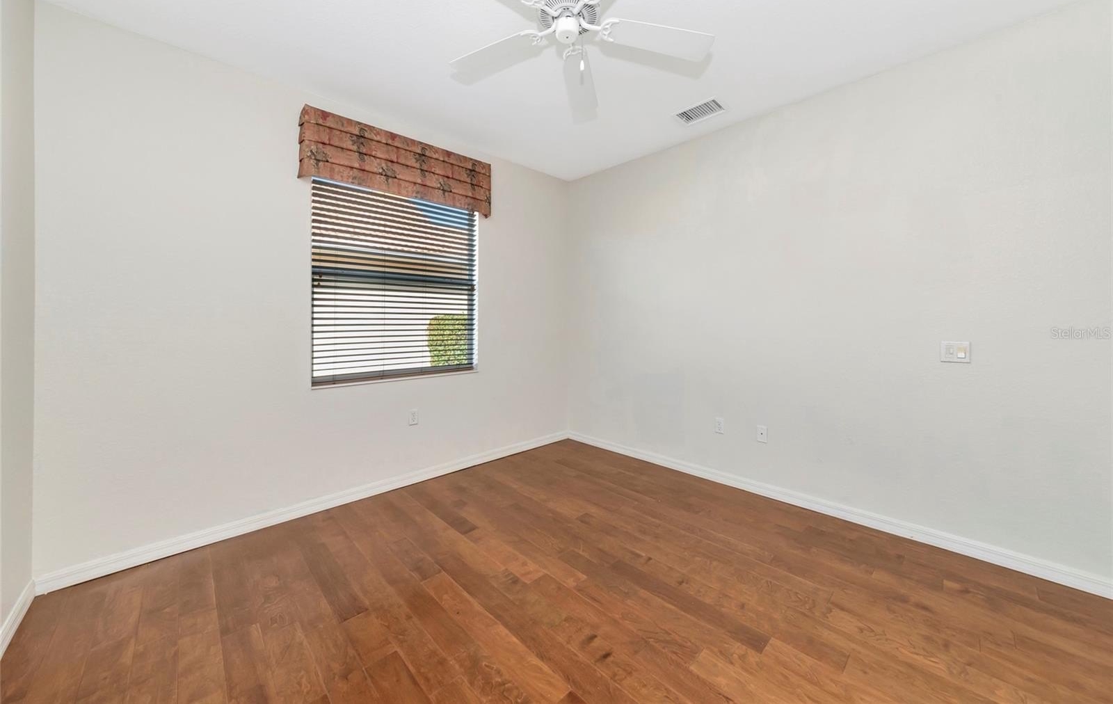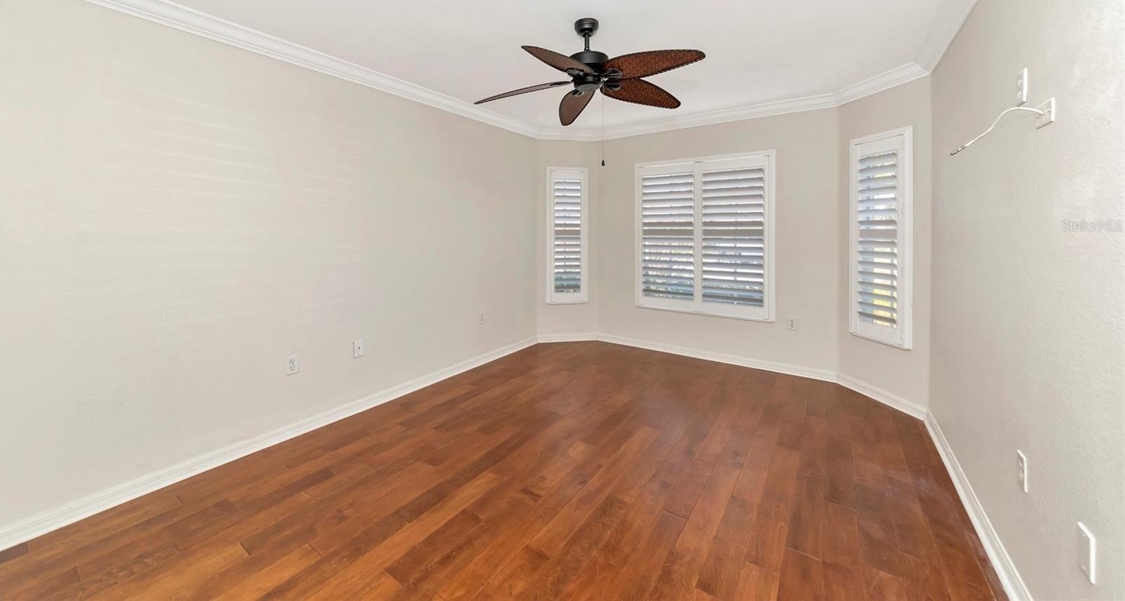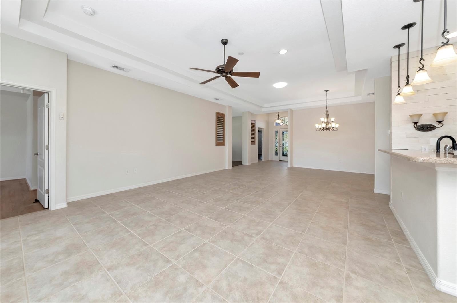 Inside, you'll find a bright, open-concept layout with upgraded plantation shutters. The spacious kitchen features solid-surface countertops, ample cabinetry, and a convenient breakfast bar. The private owner’s suite includes a walk-in closet and en-suite bathroom, while the separate guest suite also offers a walk-in closet and private bath. An additional guest bedroom and a versatile den provide even more flexibility for work, hobbies, or hosting visitors.