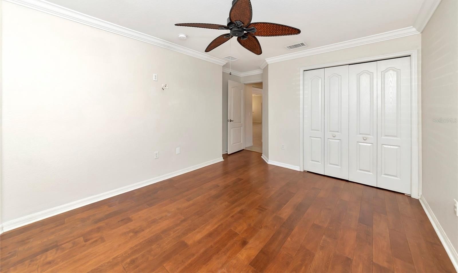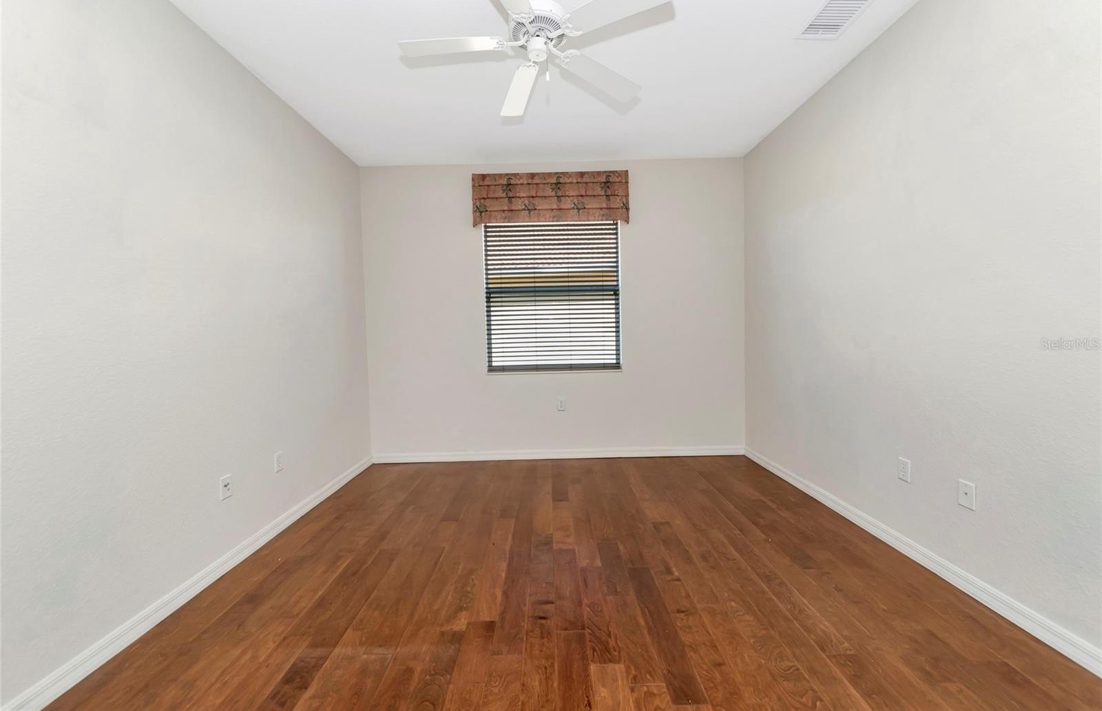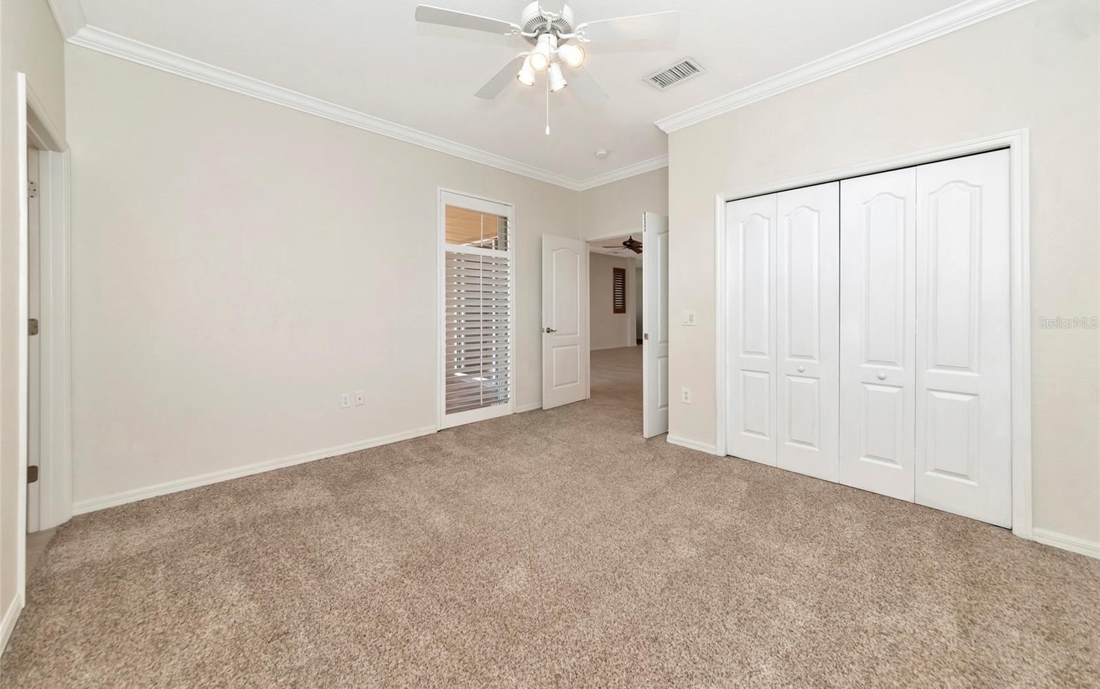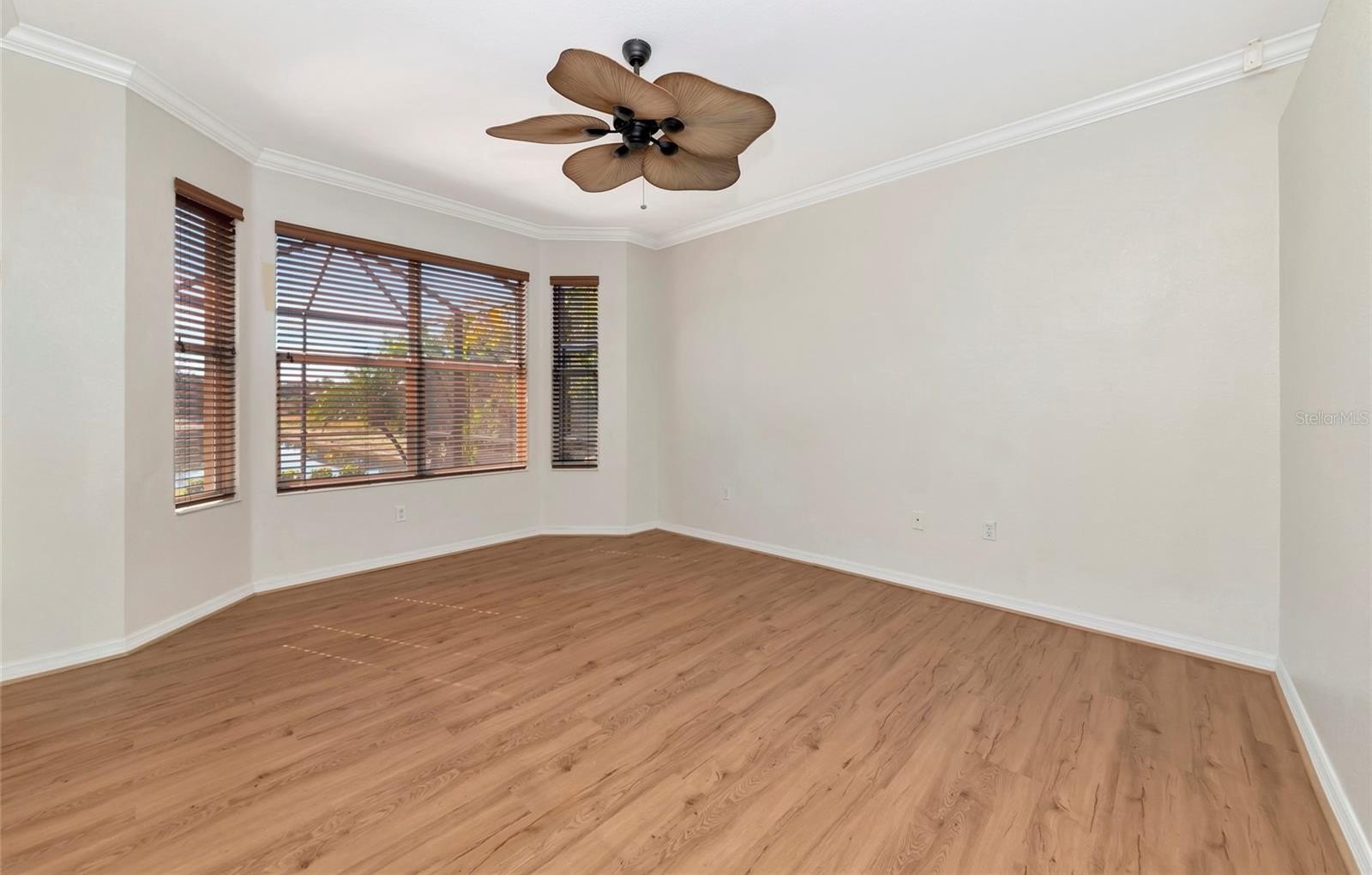 Inside, you'll find a bright, open-concept layout with upgraded plantation shutters. The spacious kitchen features solid-surface countertops, ample cabinetry, and a convenient breakfast bar. The private owner’s suite includes a walk-in closet and en-suite bathroom, while the separate guest suite also offers a walk-in closet and private bath. An additional guest bedroom and a versatile den provide even more flexibility for work, hobbies, or hosting visitors.