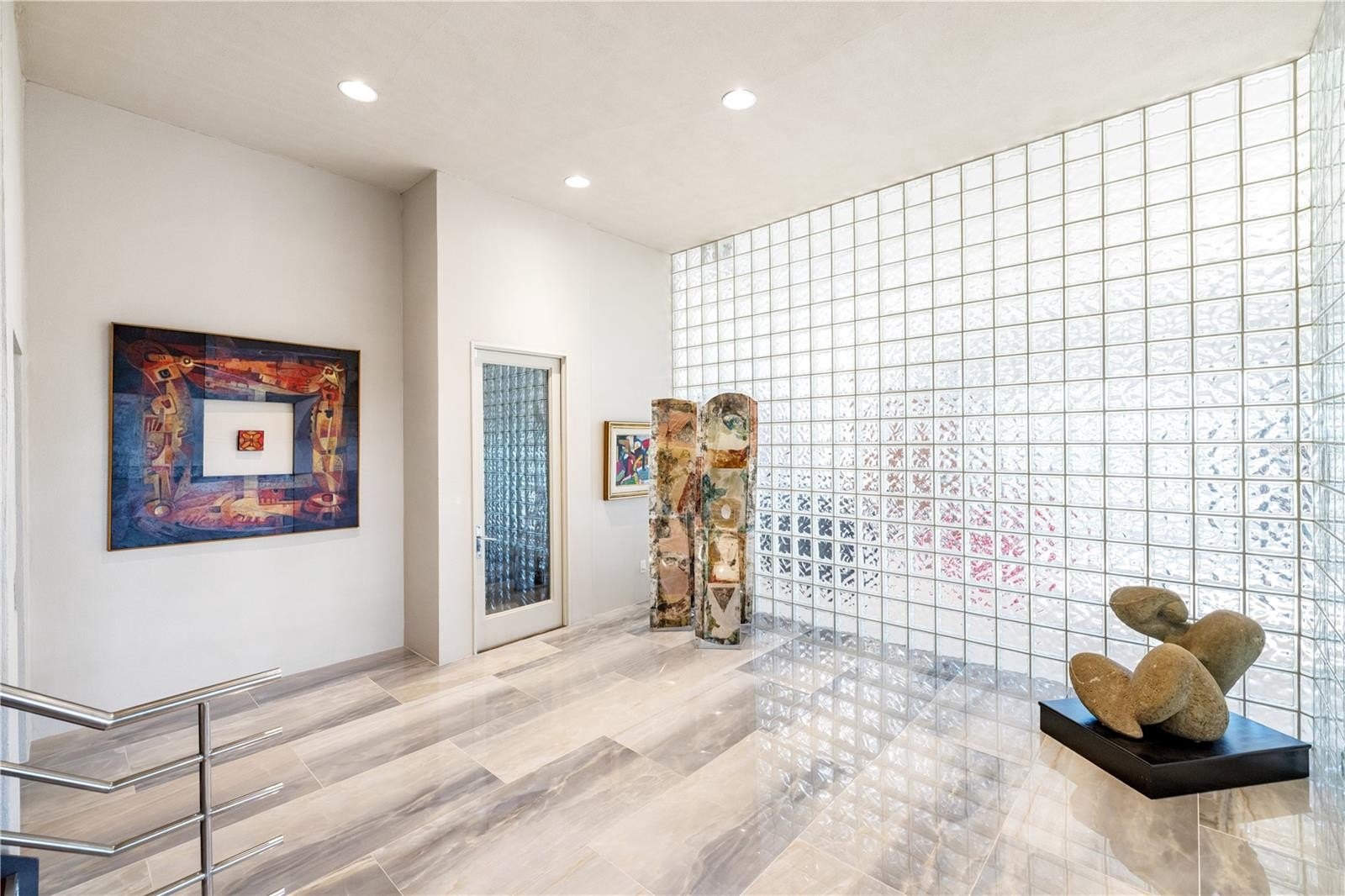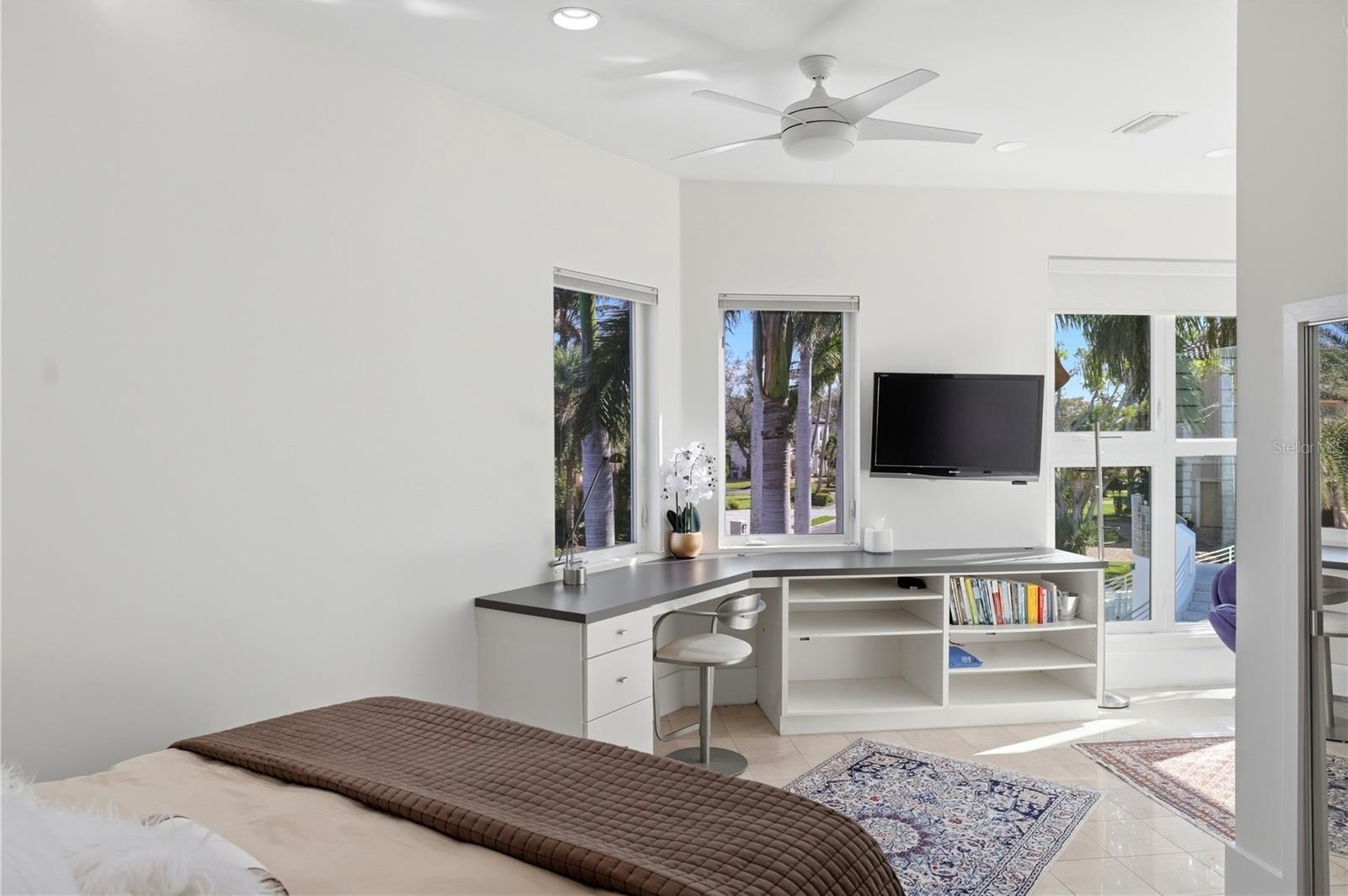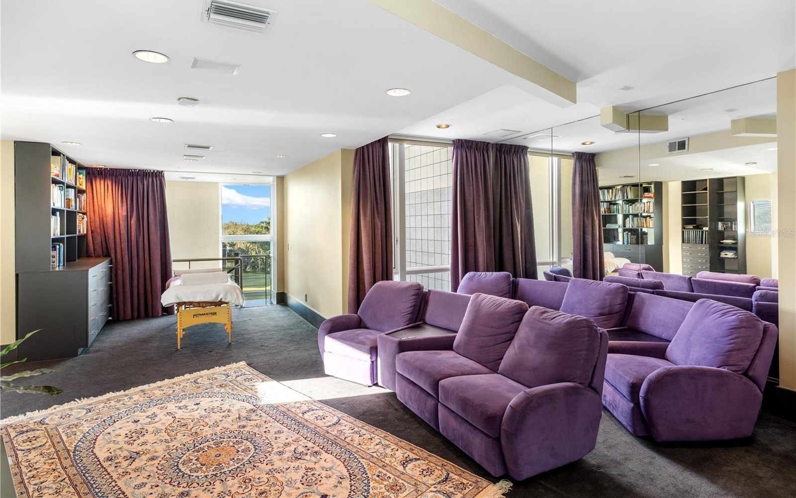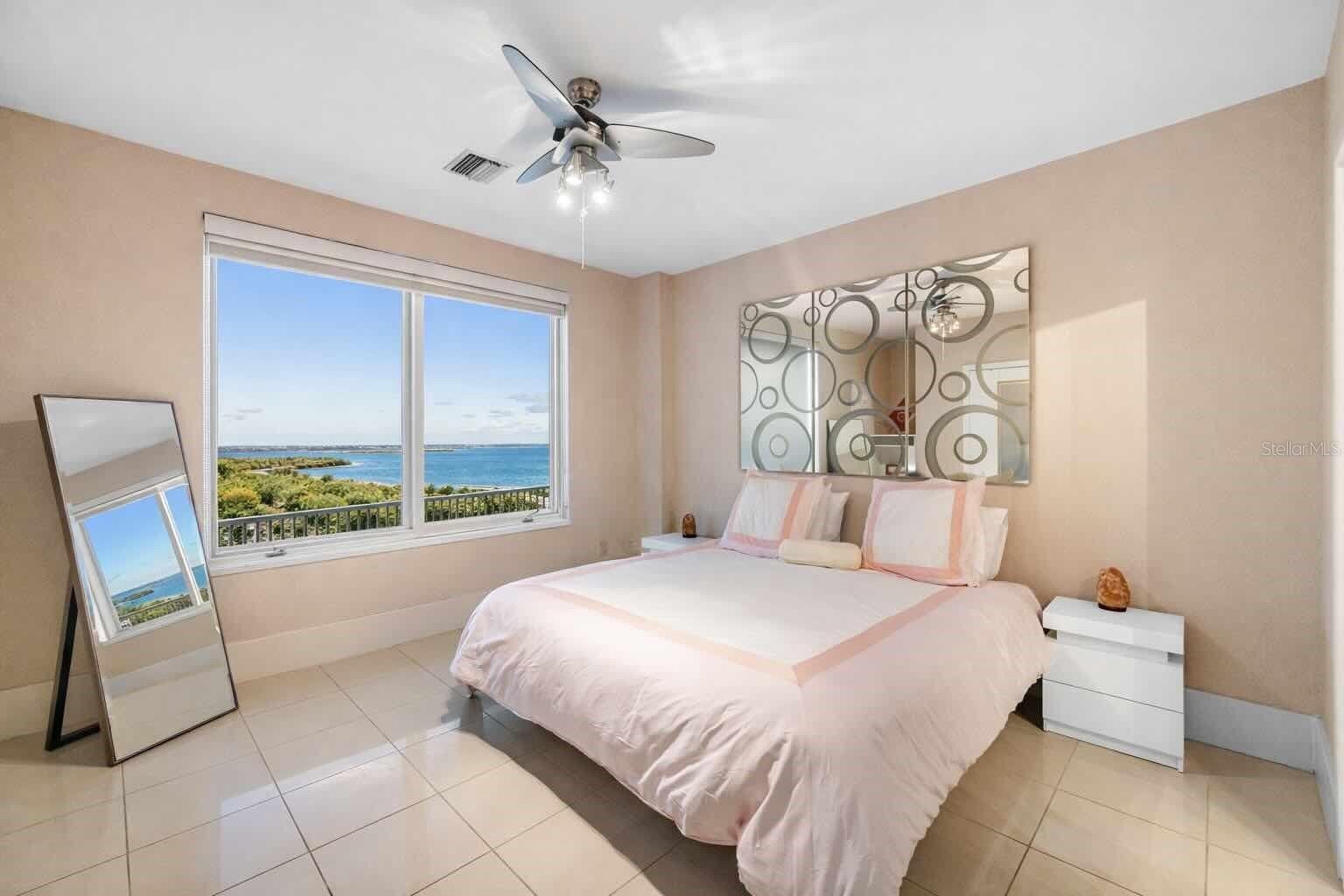 Beyond the kitchen, a formal dining room provides an elegant setting for gatherings and special occasions and opens to a spacious balcony overlooking Sarasota Bay, complete with a spiral staircase leading to the ground level. Just past the dining room, a seating area with views of Sarasota Bay offers a relaxed place to enjoy the waterfront setting while remaining connected to the surrounding living spaces.