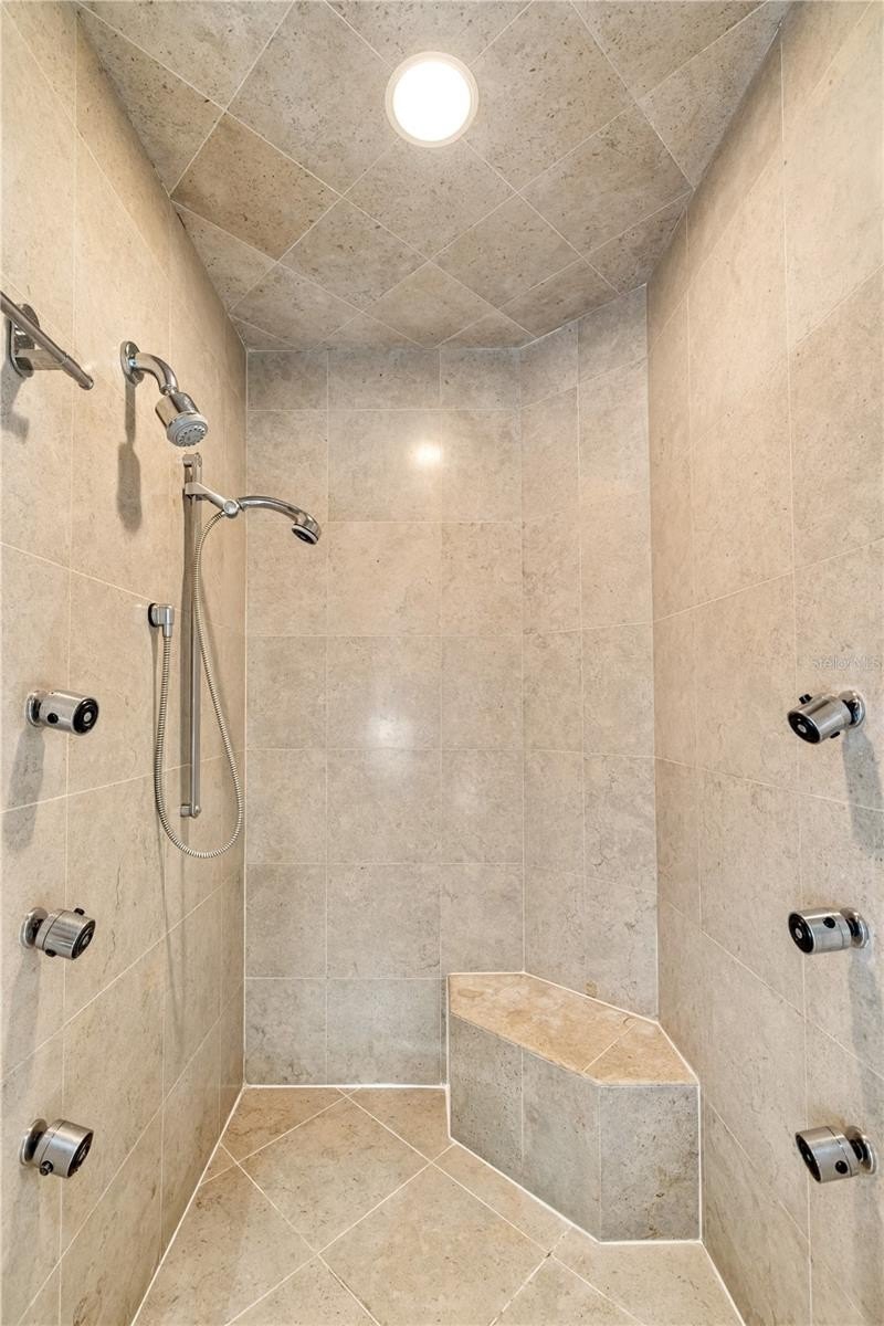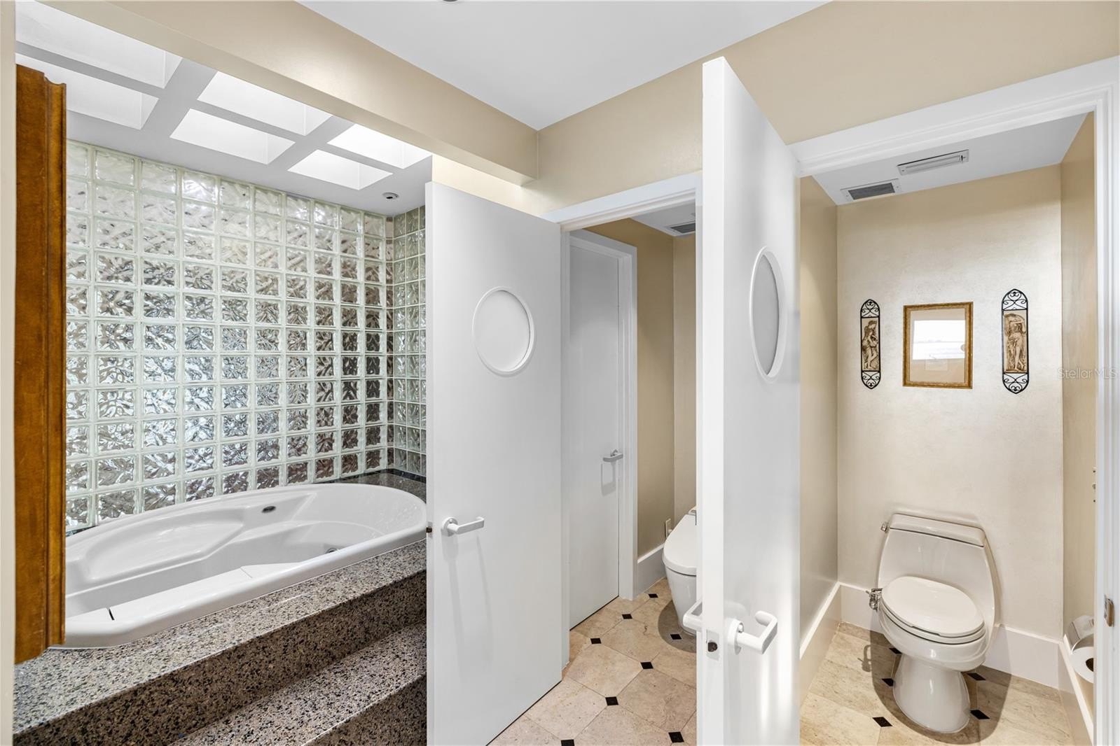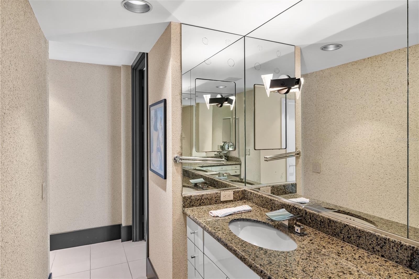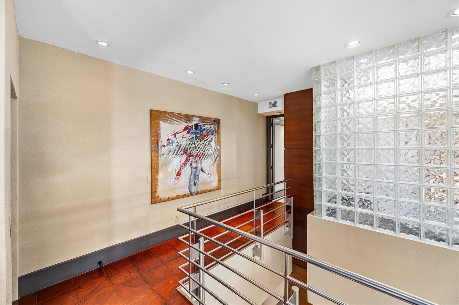 Beyond the kitchen, a formal dining room provides an elegant setting for gatherings and special occasions and opens to a spacious balcony overlooking Sarasota Bay, complete with a spiral staircase leading to the ground level. Just past the dining room, a seating area with views of Sarasota Bay offers a relaxed place to enjoy the waterfront setting while remaining connected to the surrounding living spaces.