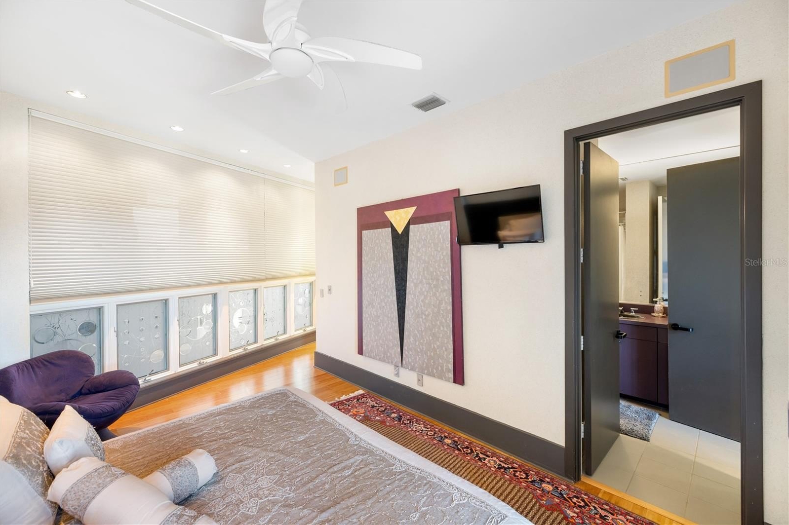 The upper level features the expansive primary suite with fireplace and private balcony overlooking Sarasota Bay, ideal for enjoying tranquil water views and spectacular sunsets. Also located on this level are two additional bedrooms, each with its own en-suite bathroom, along with a spacious media room with its own bathroom. A private elevator connects the ground, main living, and primary suite levels.