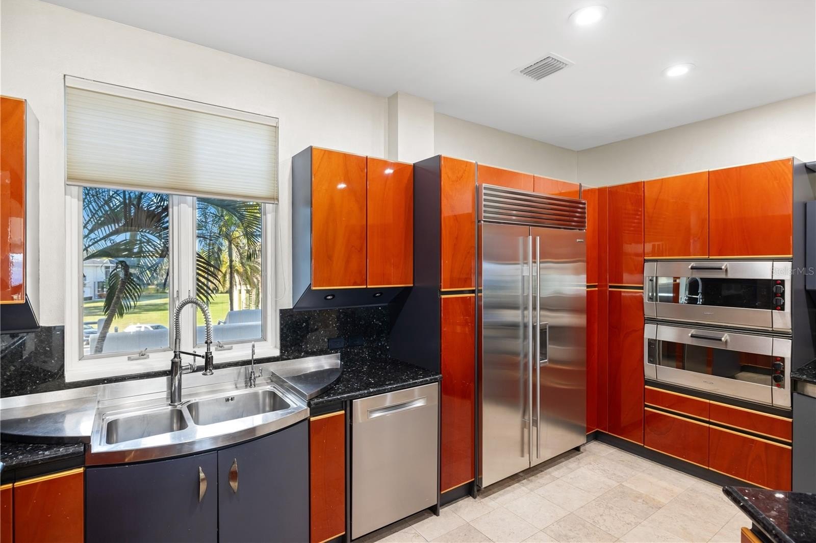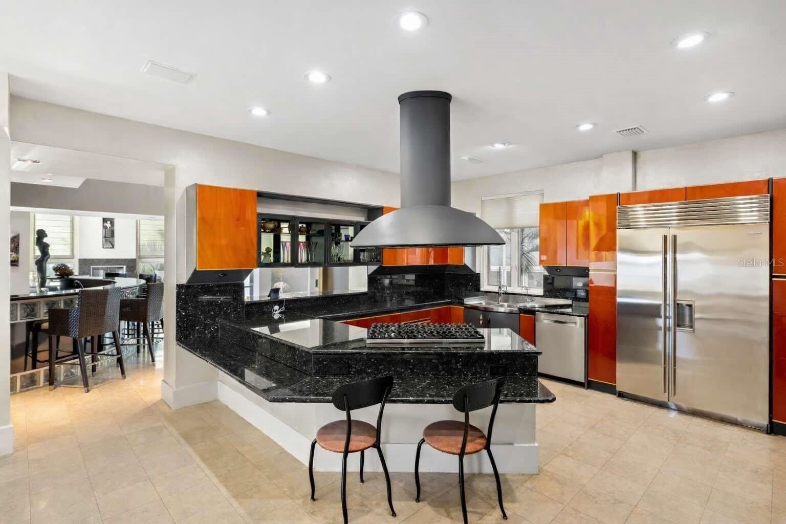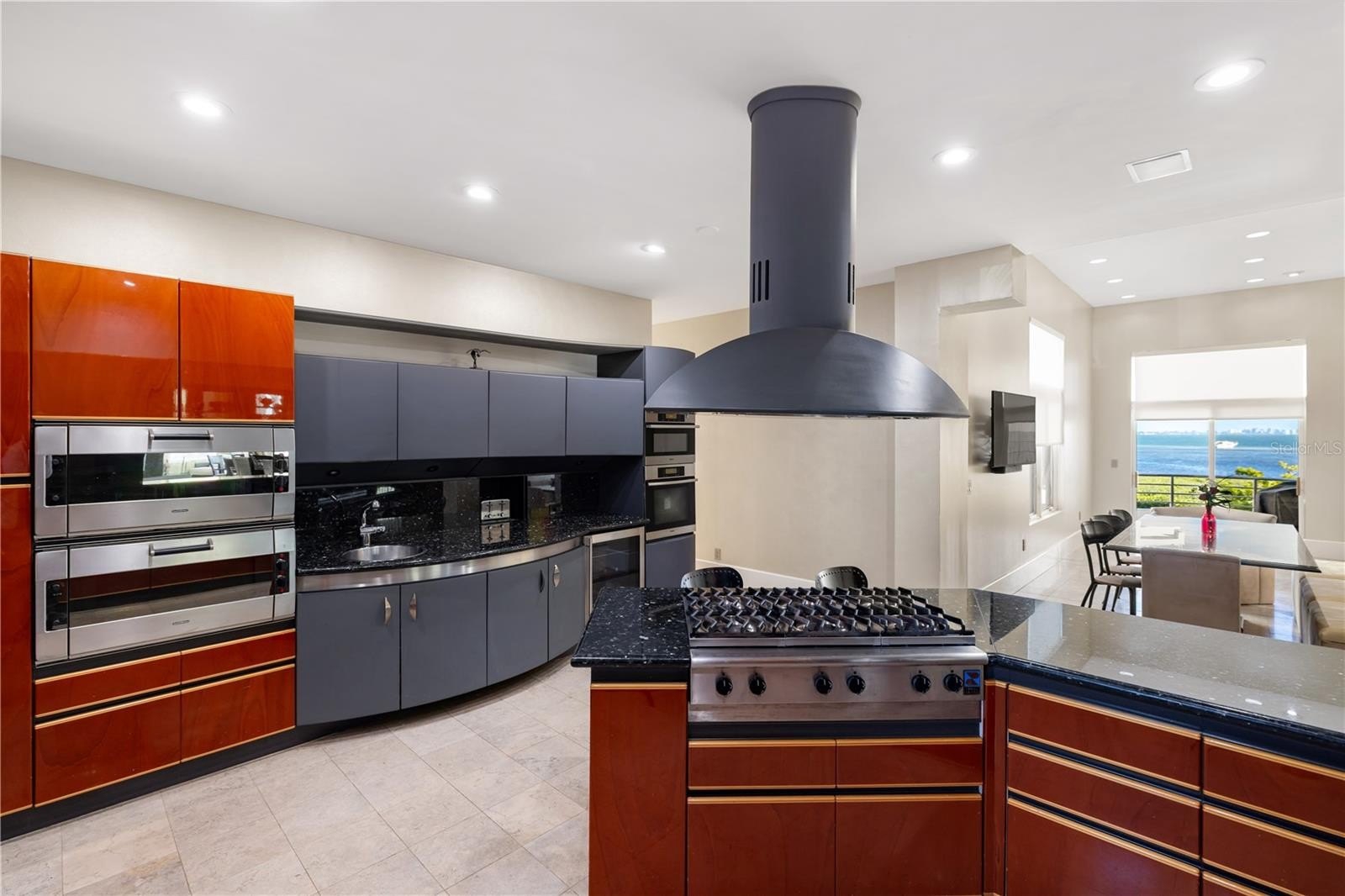 From the living room, the home unfolds into surrounding living spaces with the gourmet kitchen positioned at the center of the layout. It features a large center island, professional gas cooktop, premium appliances, and extensive cabinetry arranged to connect seamlessly with the surrounding areas while maintaining views toward Sarasota Bay. Adjacent to the kitchen, a light-filled casual dining space overlooks the bay and opens to a private balcony, creating a beautiful setting for morning coffee or relaxed meals.