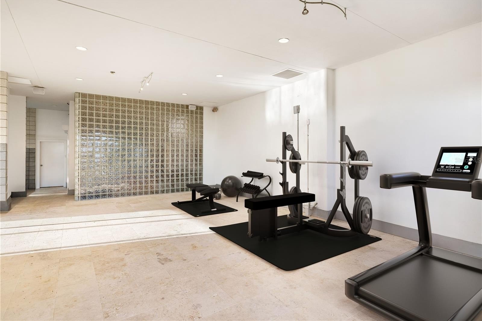 The ground level includes a large fitness area, lounge space, and bathroom, along with two attached garages accommodating up to seven vehicles.