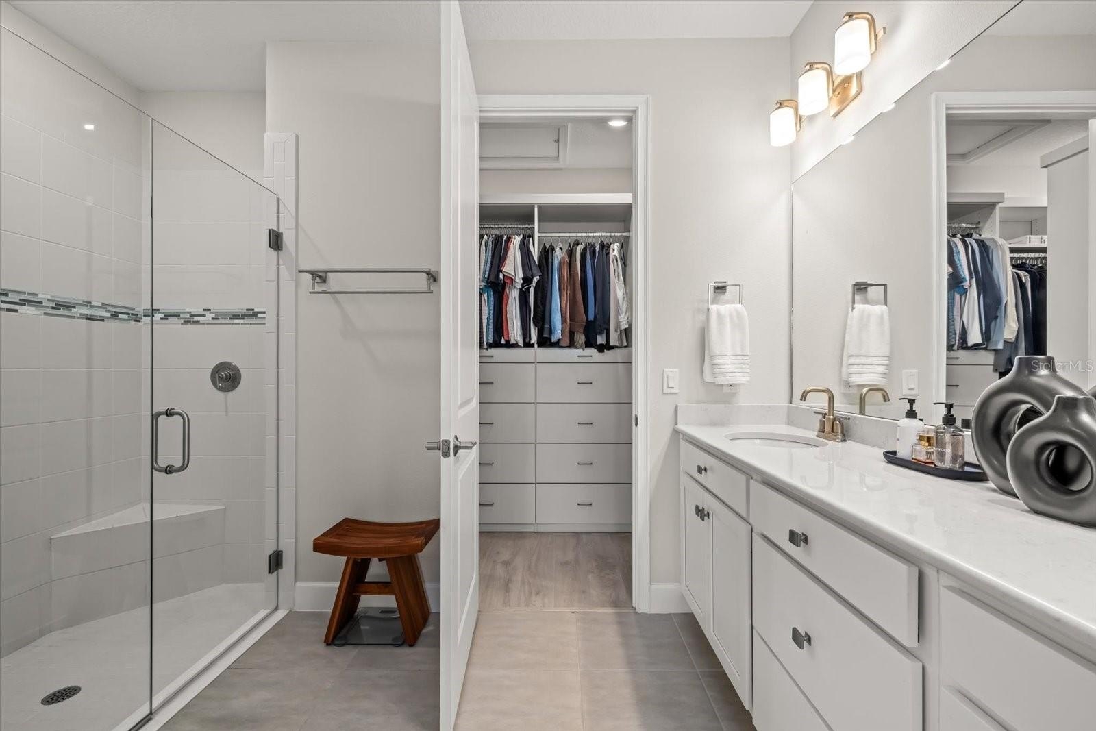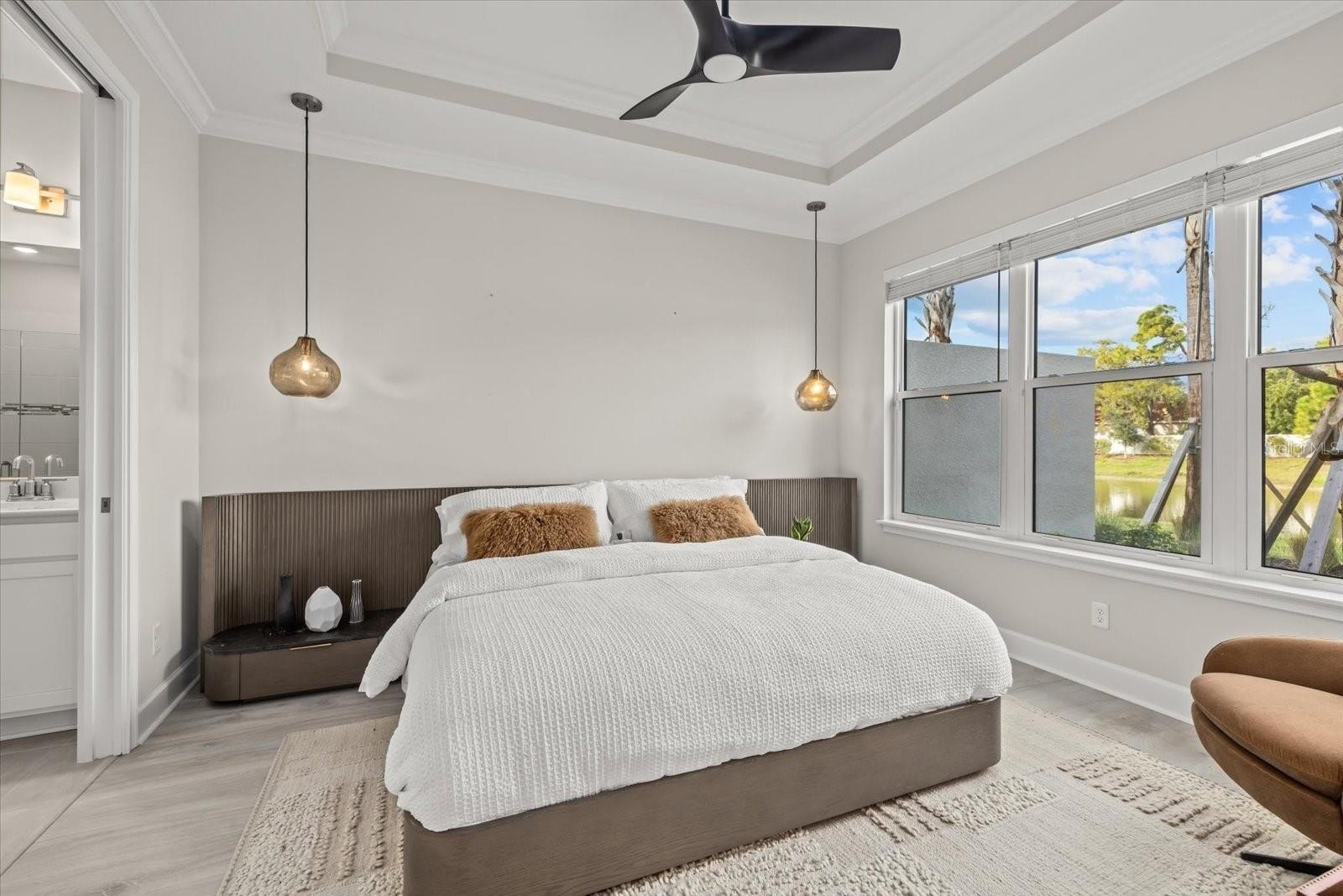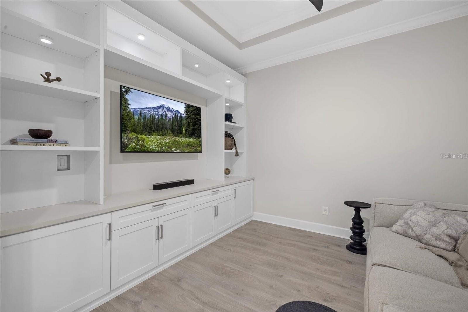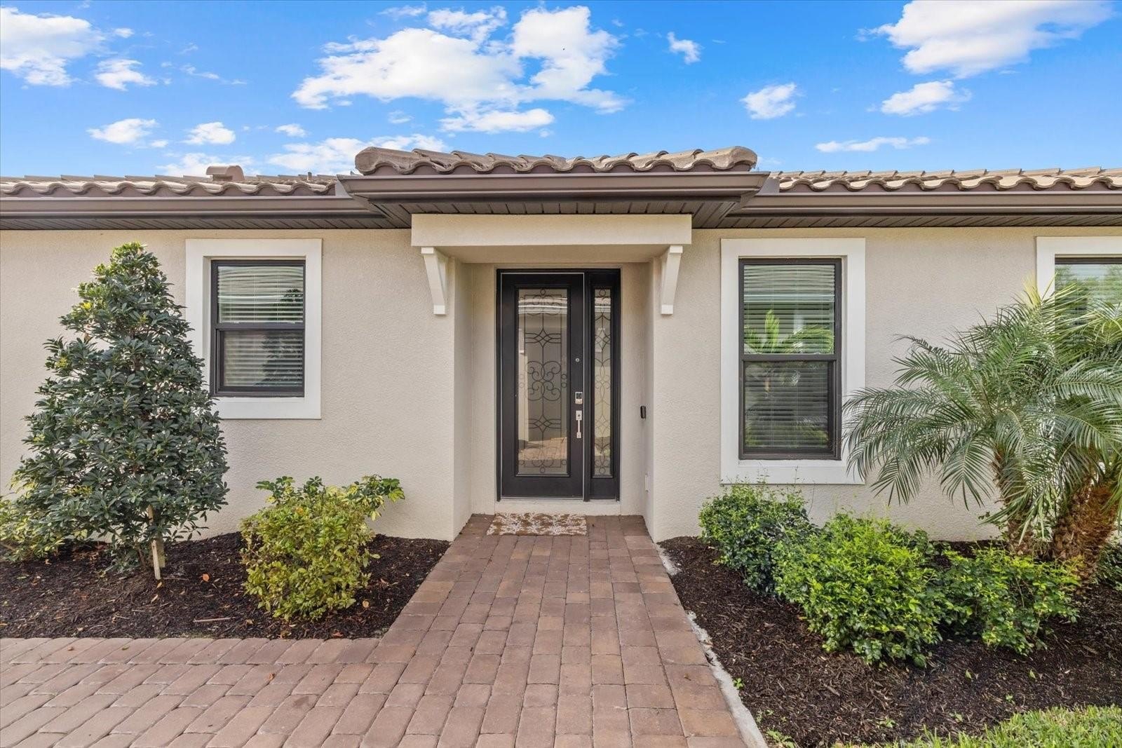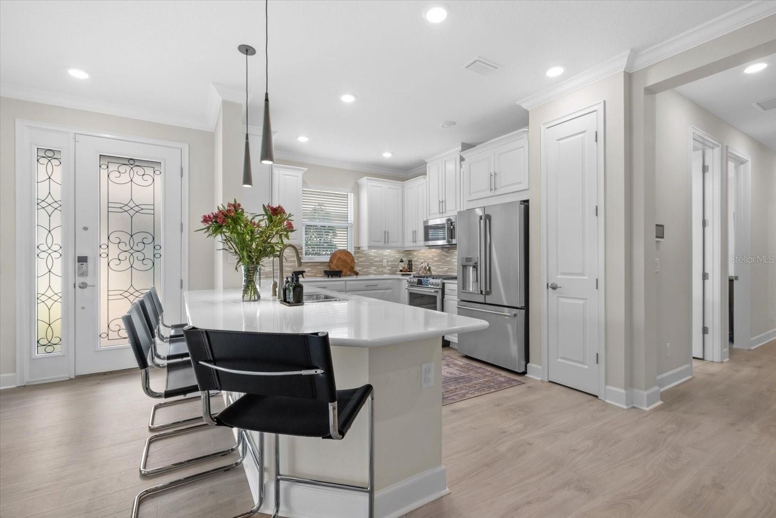 The open-concept layout boasts luxury vinyl plank flooring, an expansive tray ceiling, and exquisite crown molding throughout. The gourmet kitchen is a chef’s delight, featuring GE Café stainless steel appliances, gleaming quartz countertops, and custom designer lighting. Enjoy premium upgrades including hurricane impact windows throughout, 8-foot interior doors, a beautifully appointed laundry room with custom cabinetry, upgraded window treatments, custom motorized shades over the sliding doors, Culligan water filtration system, and smart-home Uxari security system enhancements for effortless, modern living.