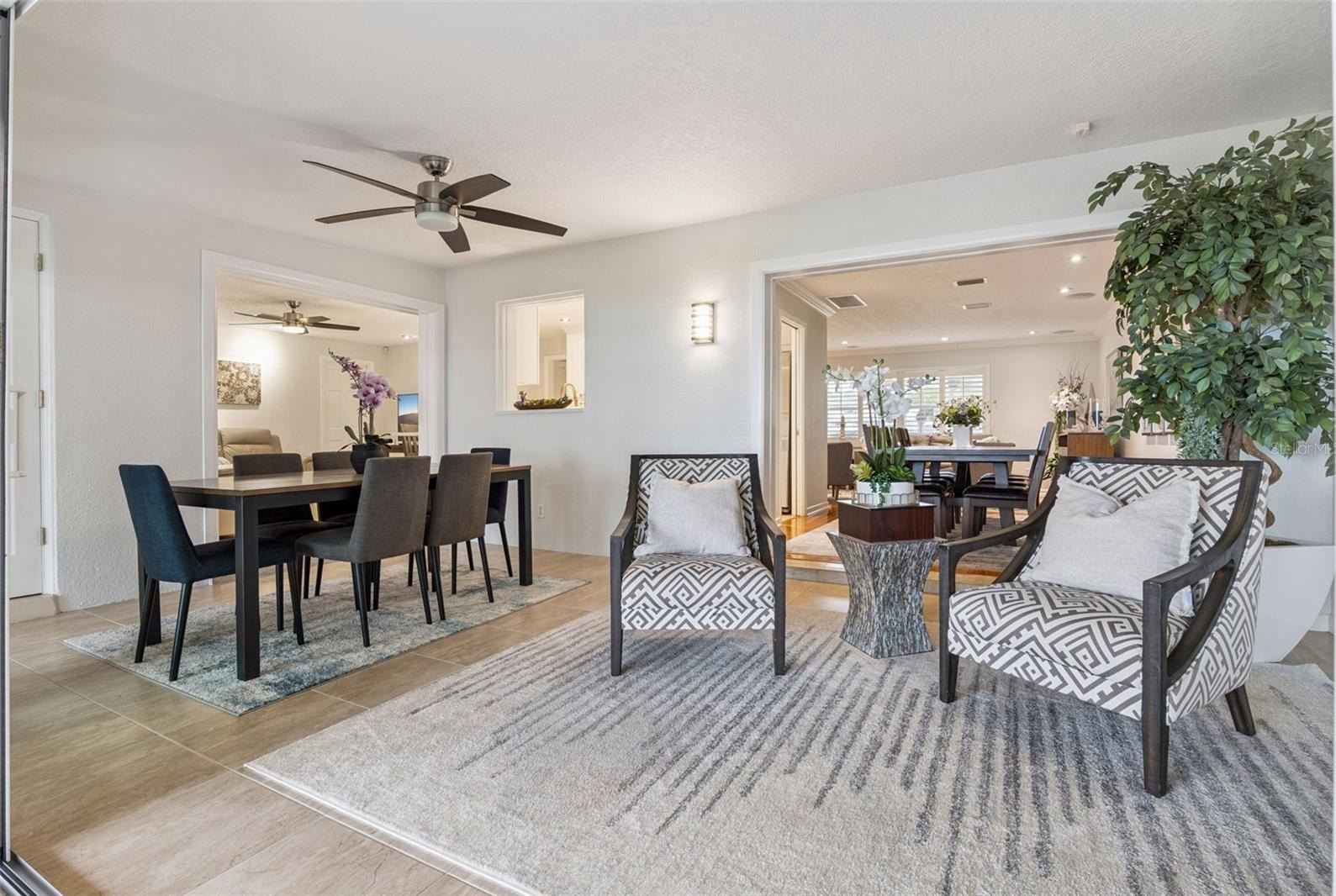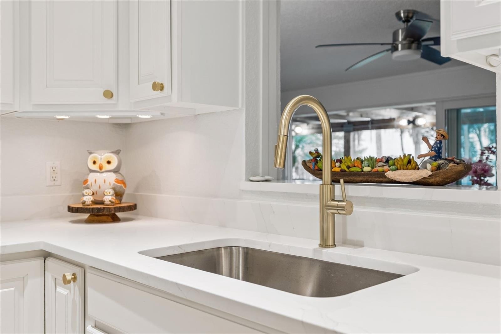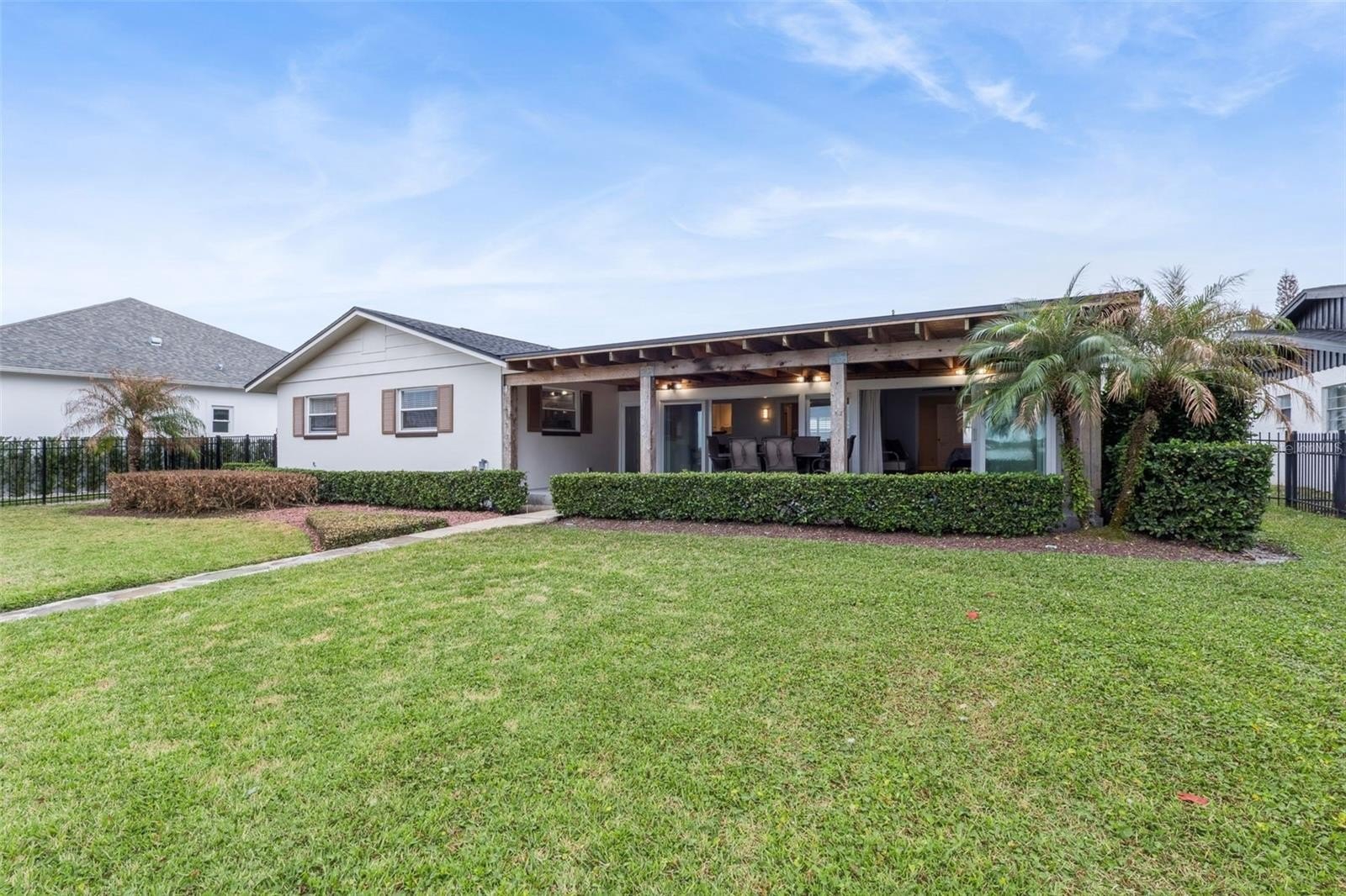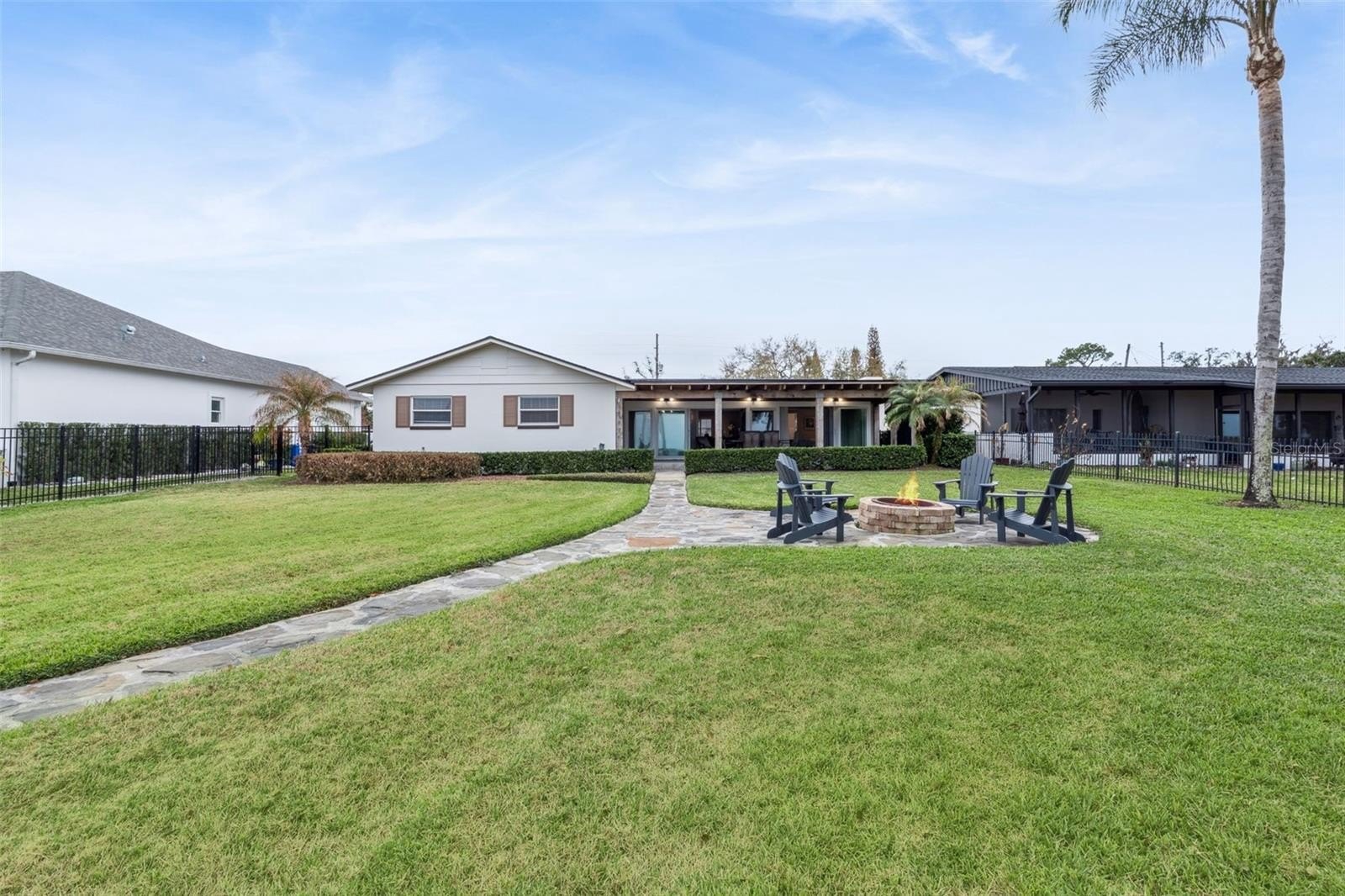 The primary suite has a sitting area with two additional closets overlooking the covered lanai & lake frontage and could serve as a secluded office space or cozy reading nook. 3 additional bedrooms, all with walk-in closets, are located at the opposite side of the home from the primary suite for that enviable split-plan! The Living Room, with wood flooring and plantation shutters leads you to the casually elegant Dining space, with room for a large dining table. Serve your guests directly from the gorgeous kitchen with BRAND NEW quartz countertops, new sink & upgraded fixtures. The Kitchen also has a breakfast bar leading to an inviting Family Room, just steps from the new laundry room. The airy Florida Room is the best place to take in the waterfront views UNTIL you step outside onto your covered lanai! This is a great spot for entertaining, gathering and Al Fresco dining! You'll want to end your evening around the firepit, toasting THE GOOD LIFE!