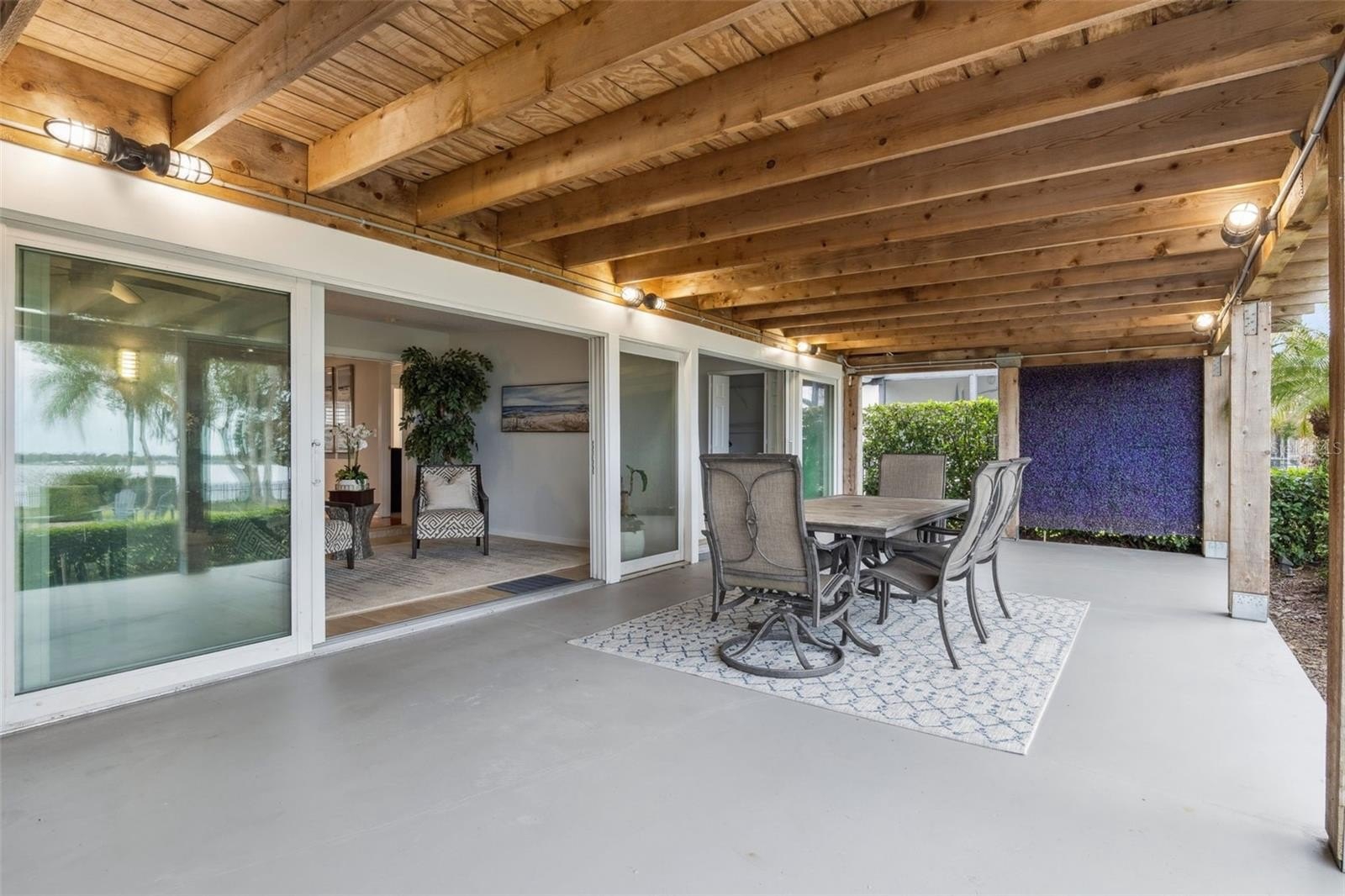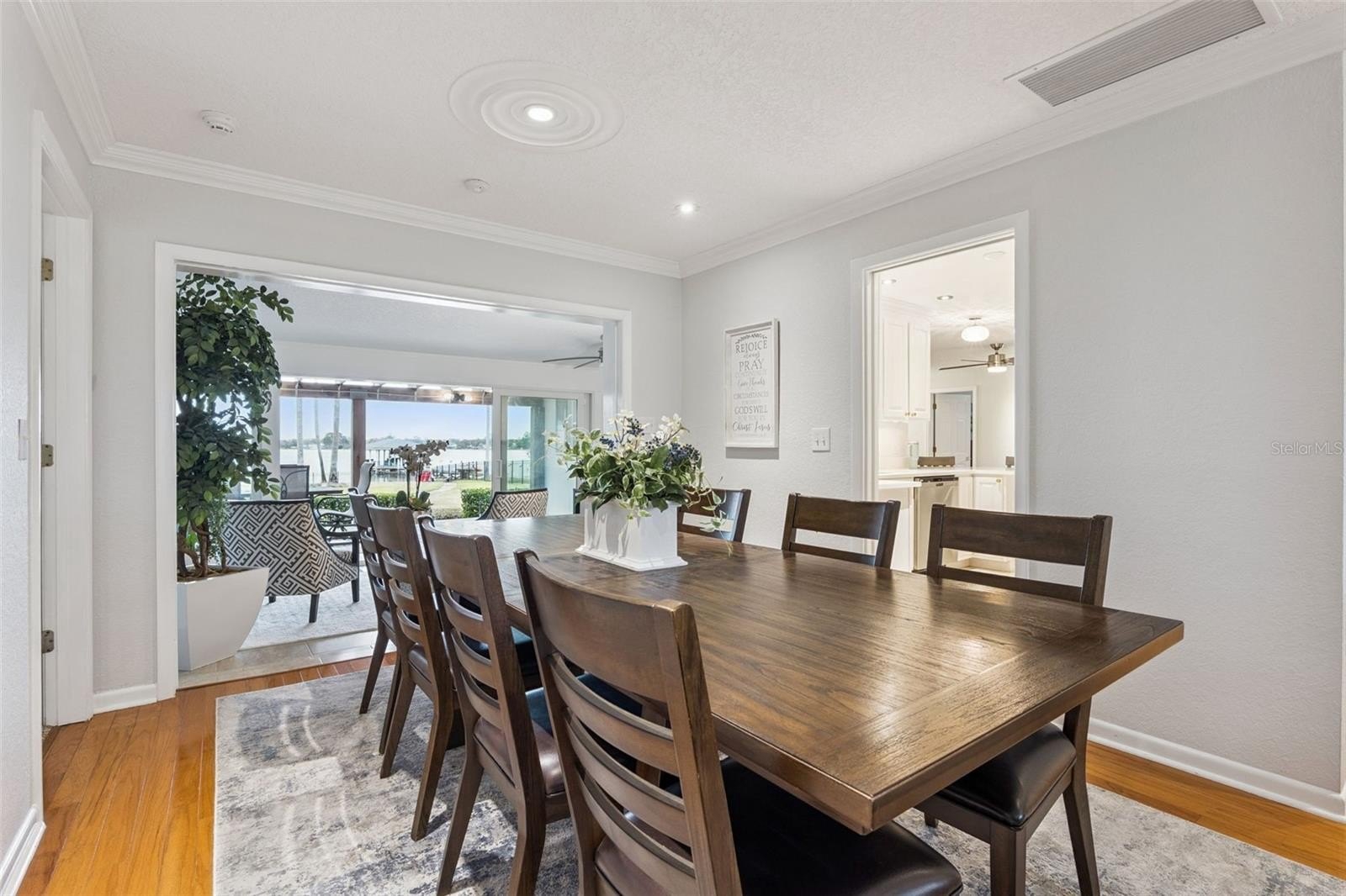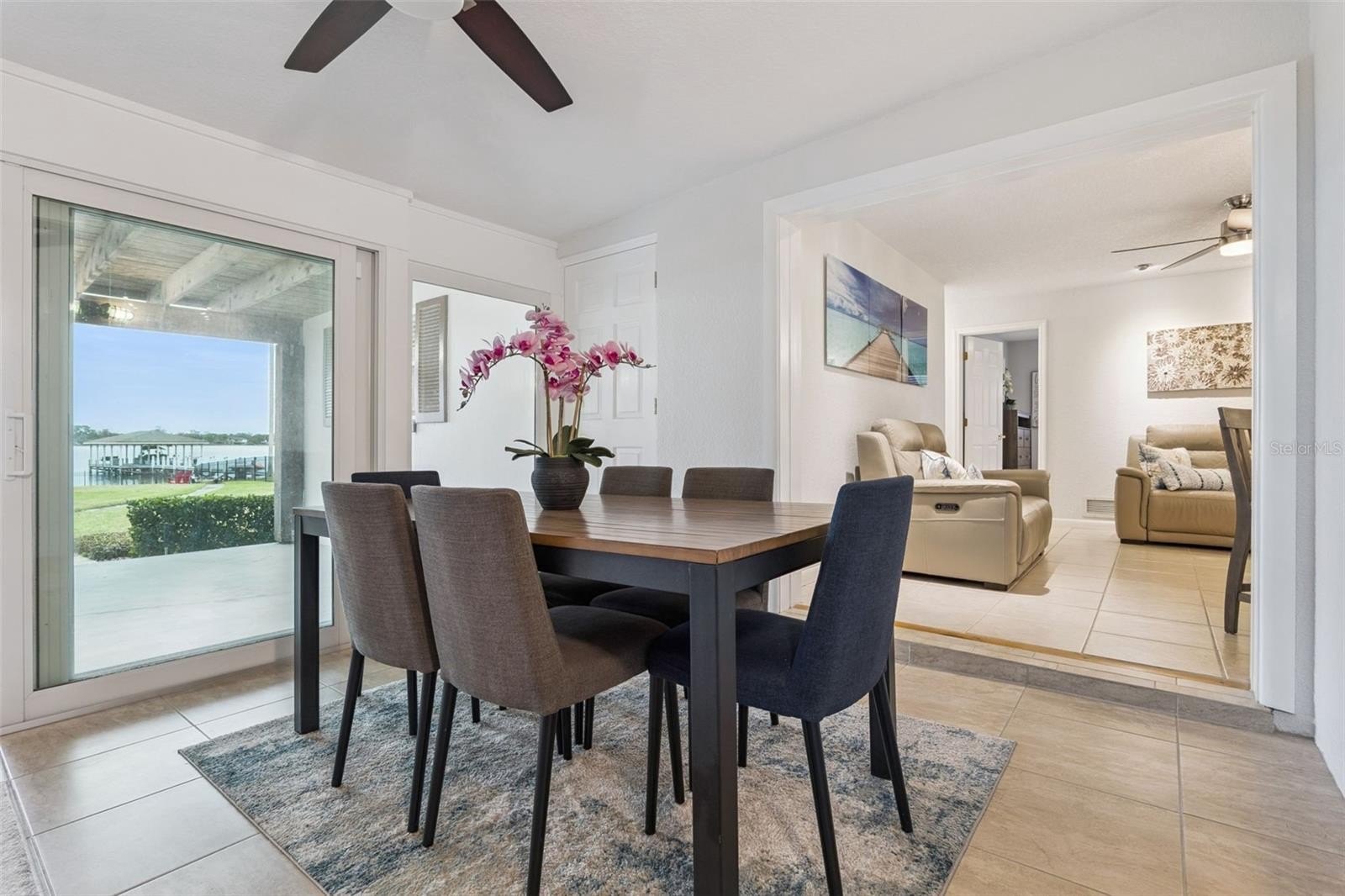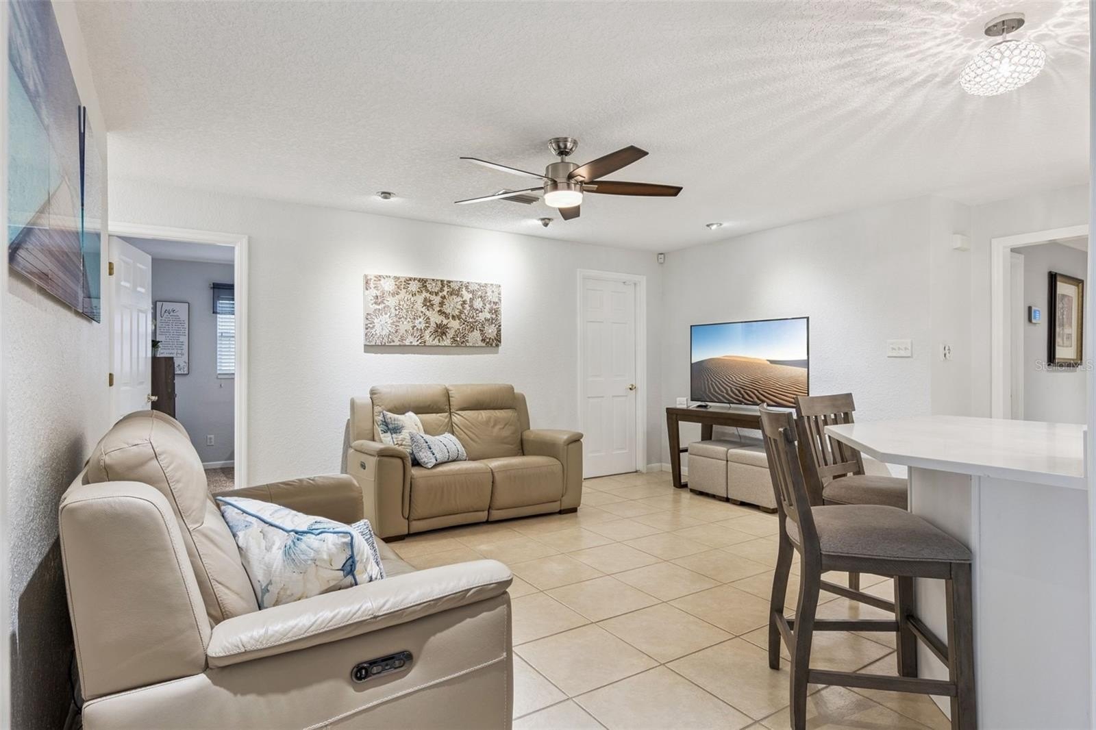 The primary suite has a sitting area with two additional closets overlooking the covered lanai & lake frontage and could serve as a secluded office space or cozy reading nook. 3 additional bedrooms, all with walk-in closets, are located at the opposite side of the home from the primary suite for that enviable split-plan! The Living Room, with wood flooring and plantation shutters leads you to the casually elegant Dining space, with room for a large dining table. Serve your guests directly from the gorgeous kitchen with BRAND NEW quartz countertops, new sink & upgraded fixtures. The Kitchen also has a breakfast bar leading to an inviting Family Room, just steps from the new laundry room. The airy Florida Room is the best place to take in the waterfront views UNTIL you step outside onto your covered lanai! This is a great spot for entertaining, gathering and Al Fresco dining! You'll want to end your evening around the firepit, toasting THE GOOD LIFE!