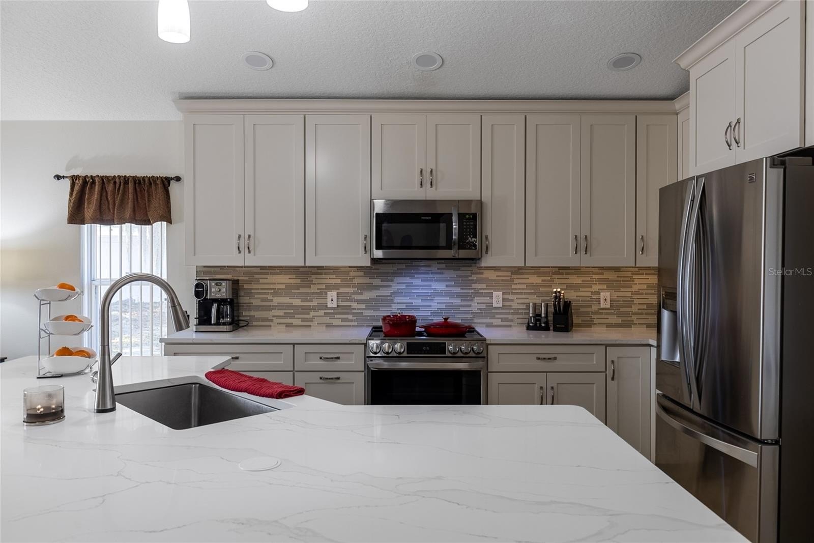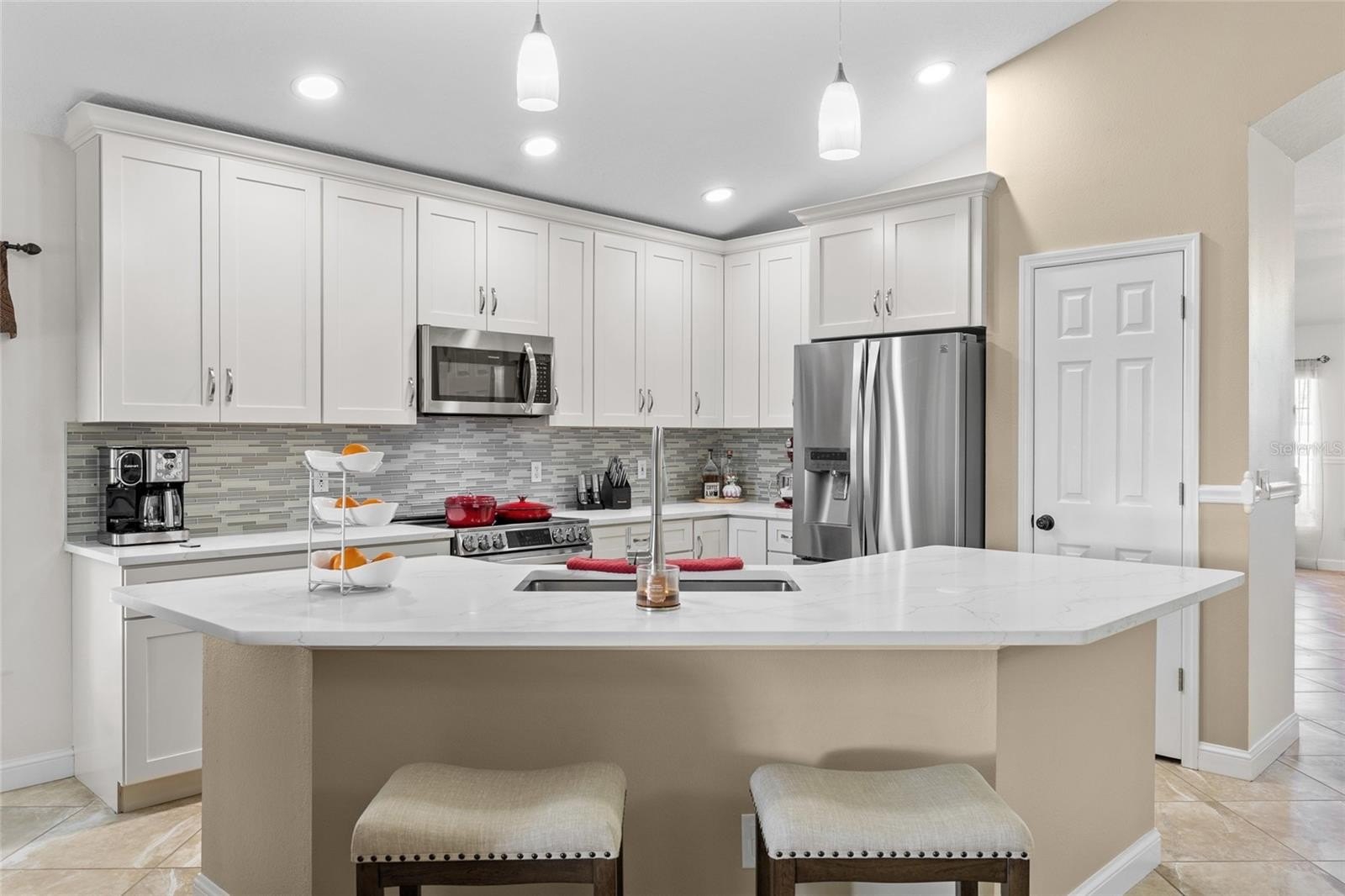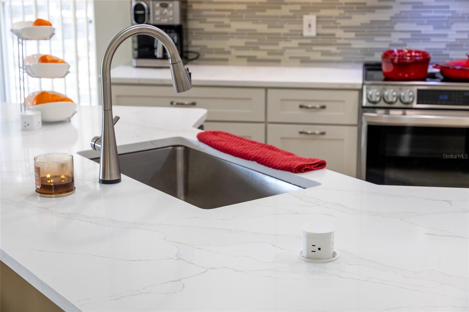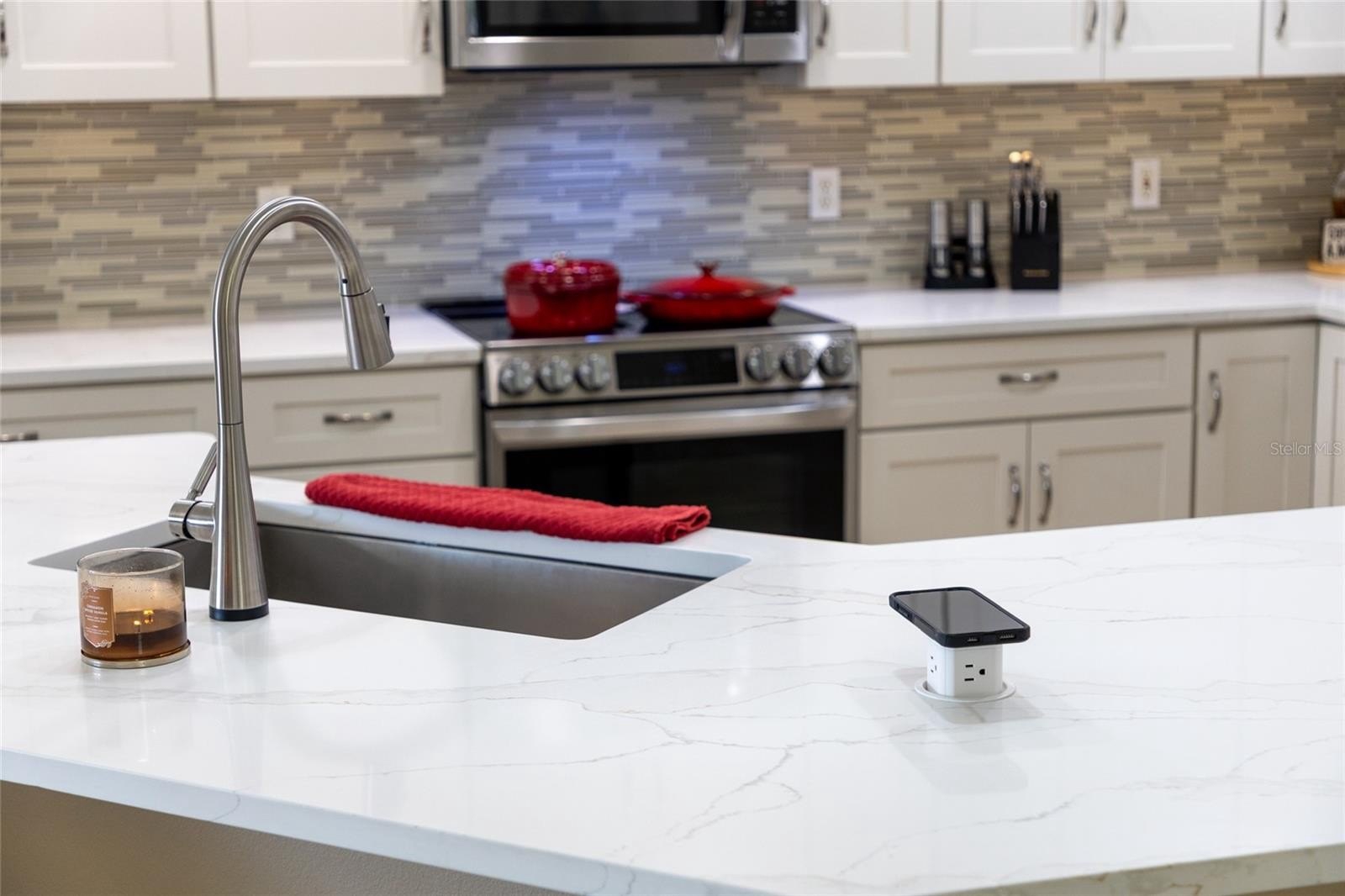 The gourmet kitchen is a true centerpiece, showcasing all-new cabinetry, stunning quartz countertops, stainless steel appliances, and a large island with a built-in sink -perfect for meal prep, entertaining, and gathering with family and friends. There are 2 charging stations that pop up with 4 outlets in each.