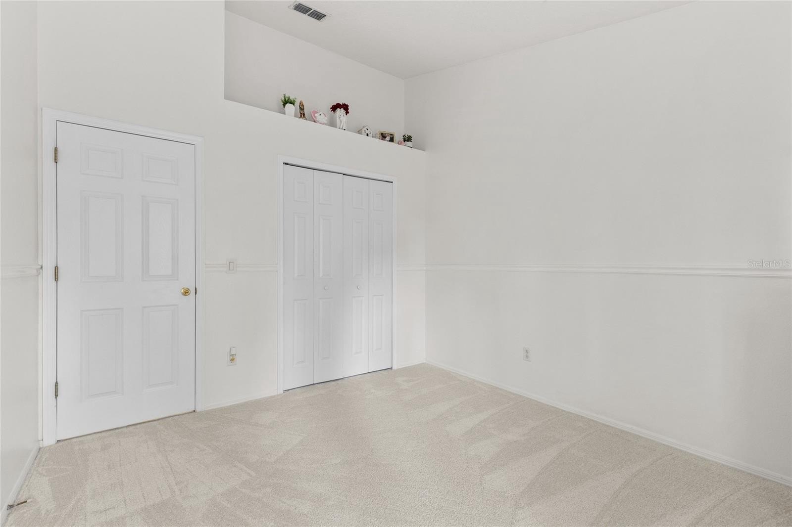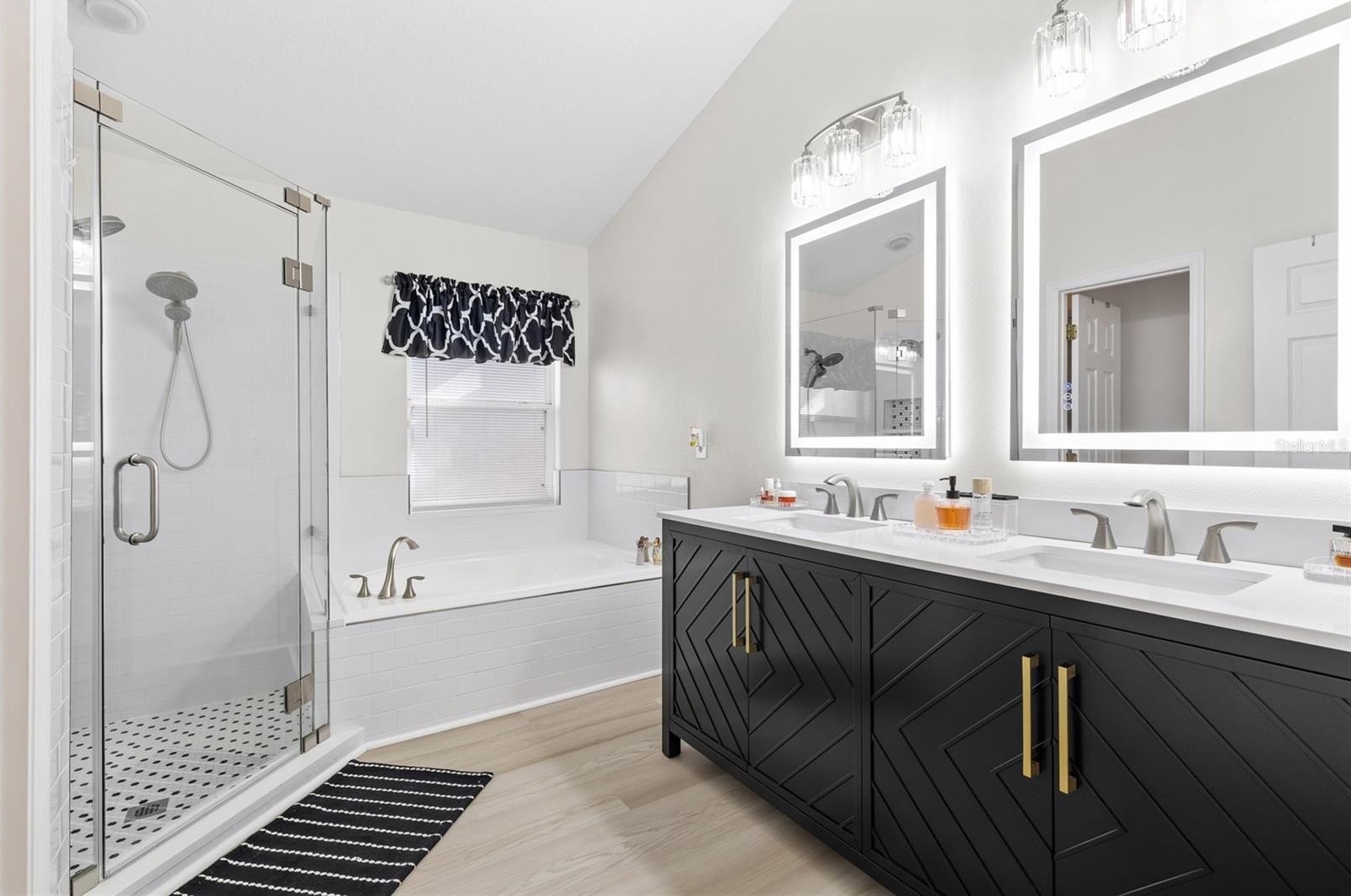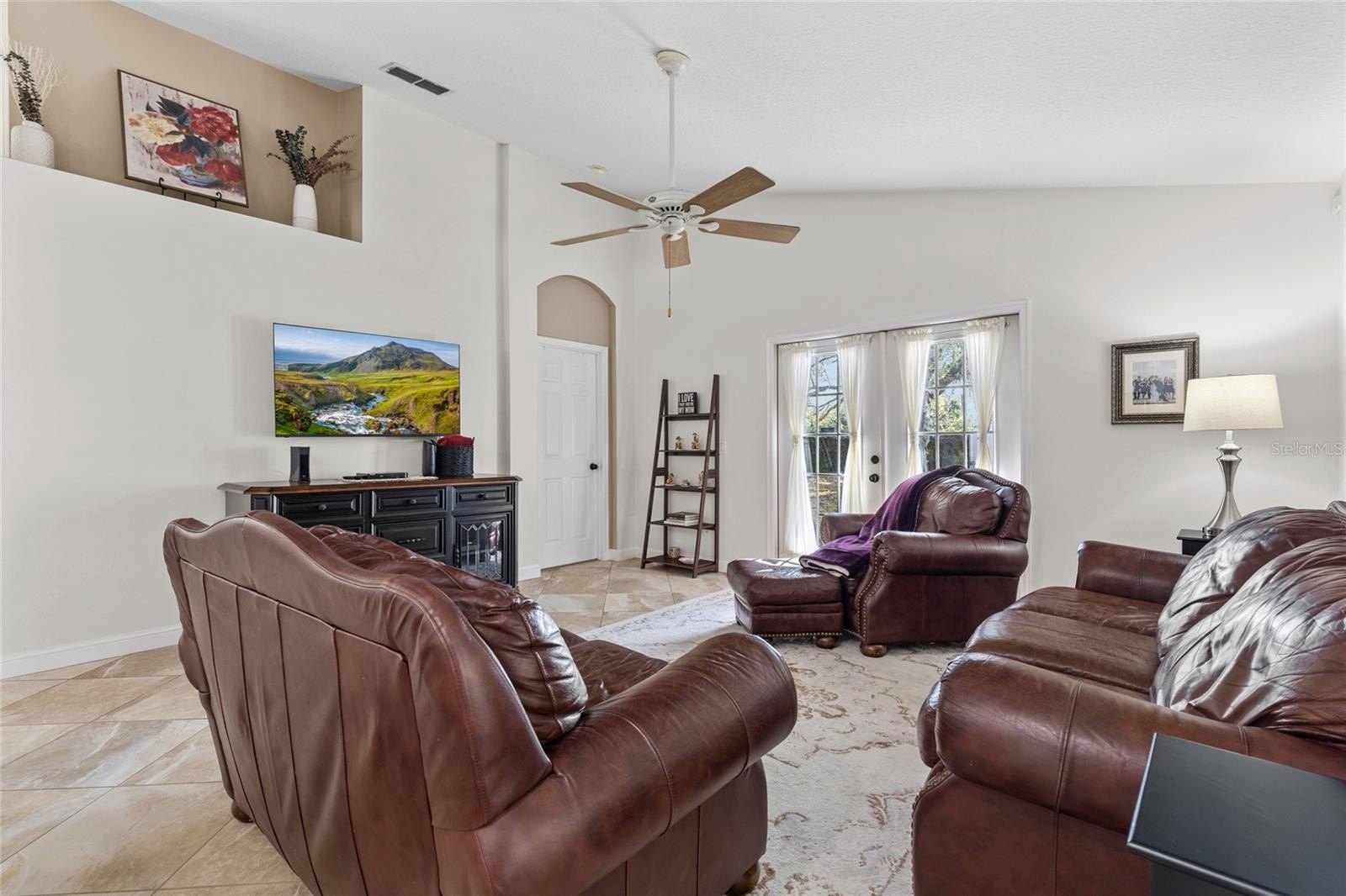 Step inside to an open floor plan highlighted by soaring high ceilings that create a bright and spacious feel throughout the main living areas. There is a formal dining and living room as you enter the home. An office or den has French doors for privacy. The split-bedroom layout offers added privacy, with the primary suite located on the opposite end of the home from the secondary bedrooms. The spacious primary retreat features new luxury vinyl flooring, an updated primary bathroom, and a generous walk-in closet. The primary bath has two separate shower heads with a total of 4 shower heads, the stunning vanity has pull out shelving providing plenty of storage space, and 2 mirrors with lighting and de-fogging features.