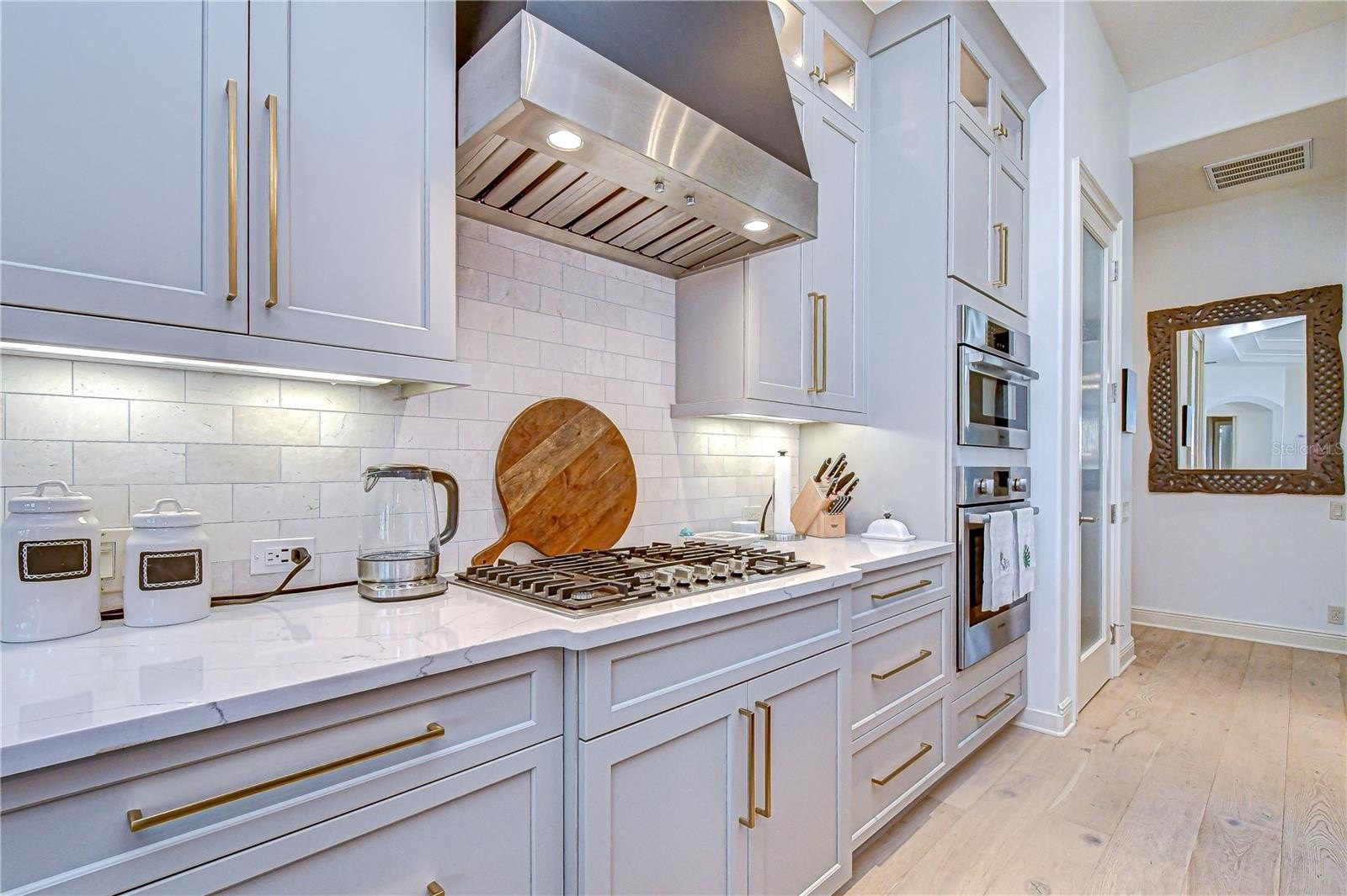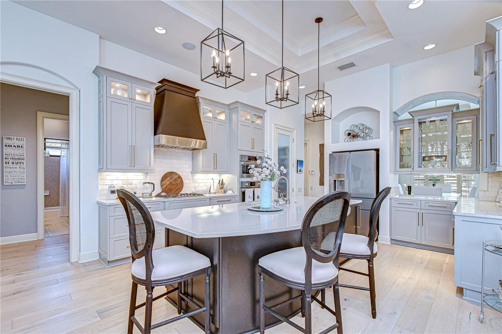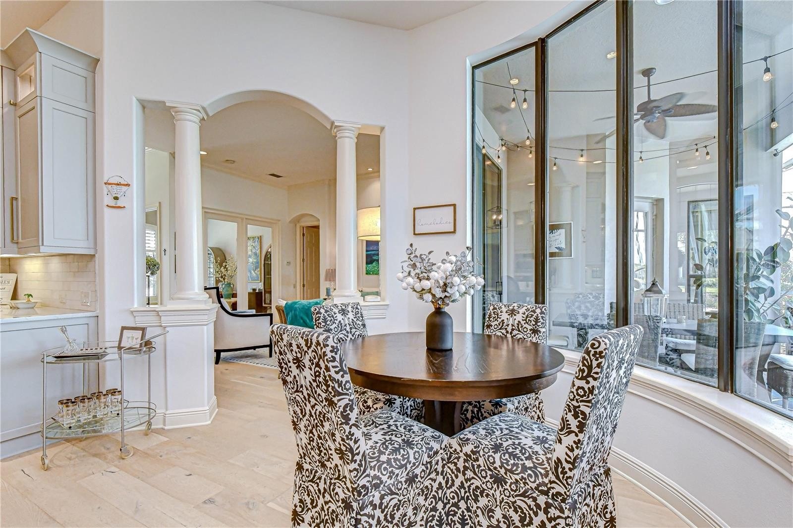 Architectural columns frame the entrance to the beautifully updated kitchen (2024) featuring a double tray ceiling with crown molding, 42-inch cabinetry with glass display cabinets above, modern crown molding and under-cabinet lighting, travertine tile backsplash, Cambria quartz countertops, and a walk-in pantry with decorative reeded glass door. The redesigned island offers curved counter-height seating with a granite composite sink and designer lighting above. A chef’s appliance suite includes a 5-burner gas cooktop with vent hood, built-in microwave and convection oven, dishwasher, and Café French-door refrigerator with dual drawers. The kitchen continues around to a pass-through to the dining room topped with decorative glass cabinets. The dinette’s tall bay windows overlook the pool, lanai, and tranquil pond.