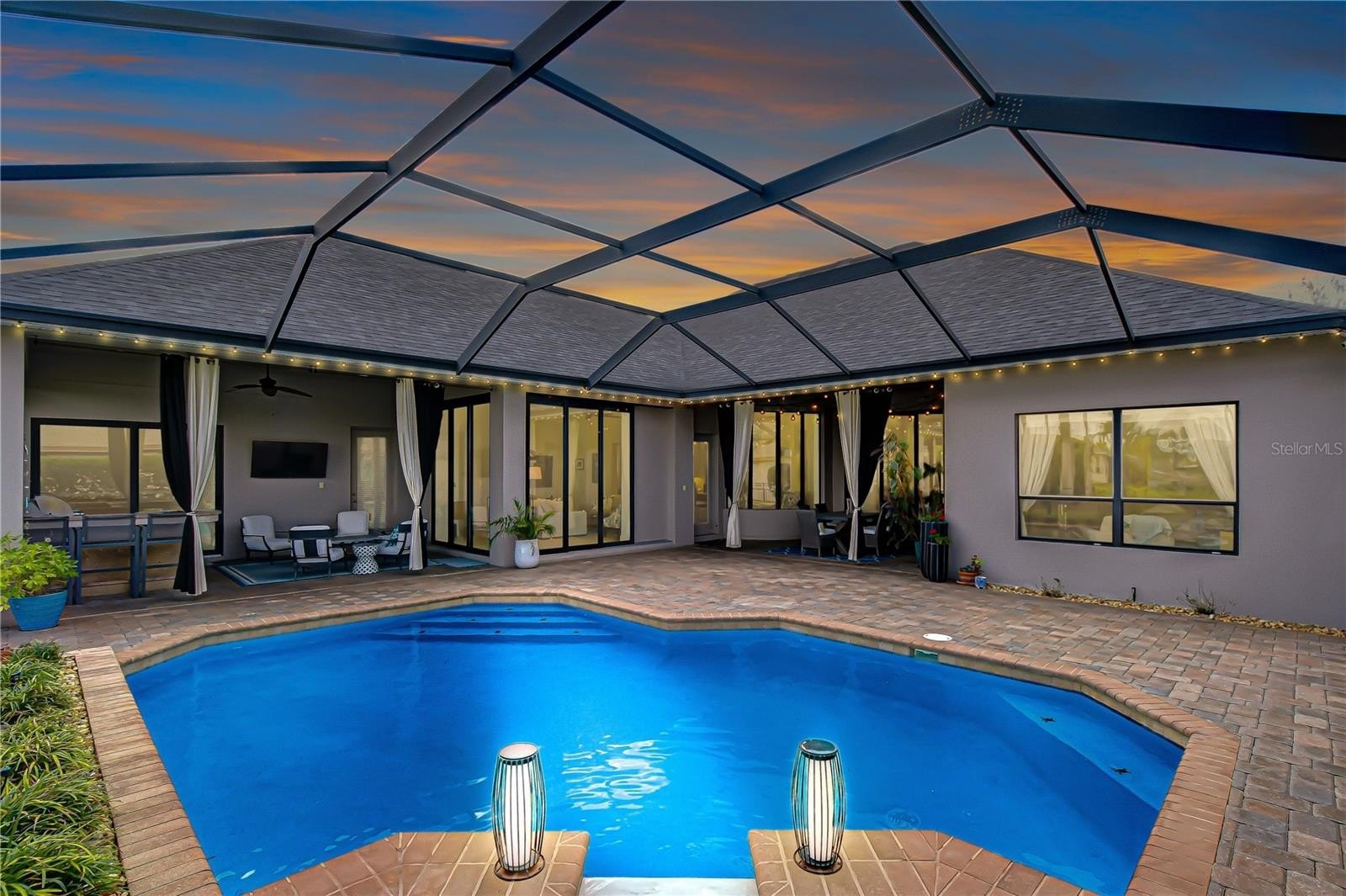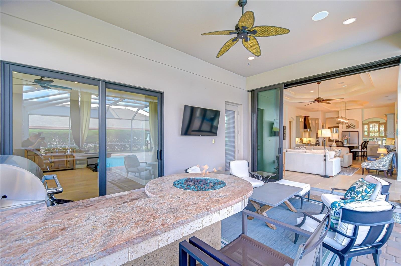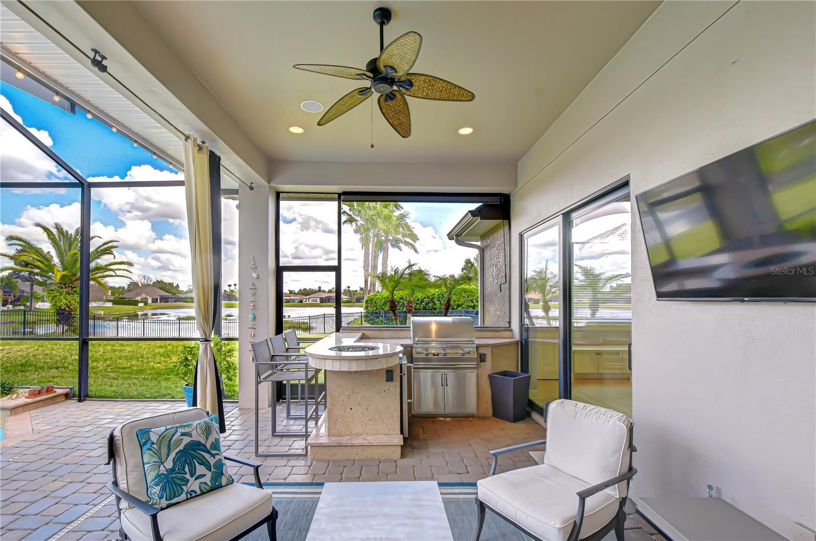 Step outside to a spectacular screened lanai designed for year-round Florida living with a paver deck, sparkling pool with spillover spa, outdoor granite bar, grilling station, and counter-height fire feature overlooking the tranquil pond, all within a fully fenced backyard.