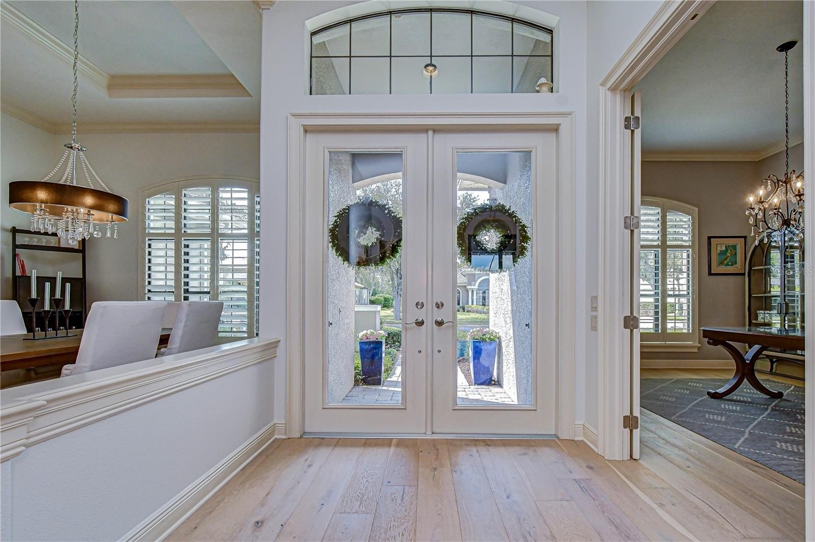 Inside, soaring 12–14 ft ceilings, engineered hardwood flooring installed 2023, rounded corner walls, and art niches create an immediate sense of elegance as natural light pours through the front glass double doors topped by a transom window.