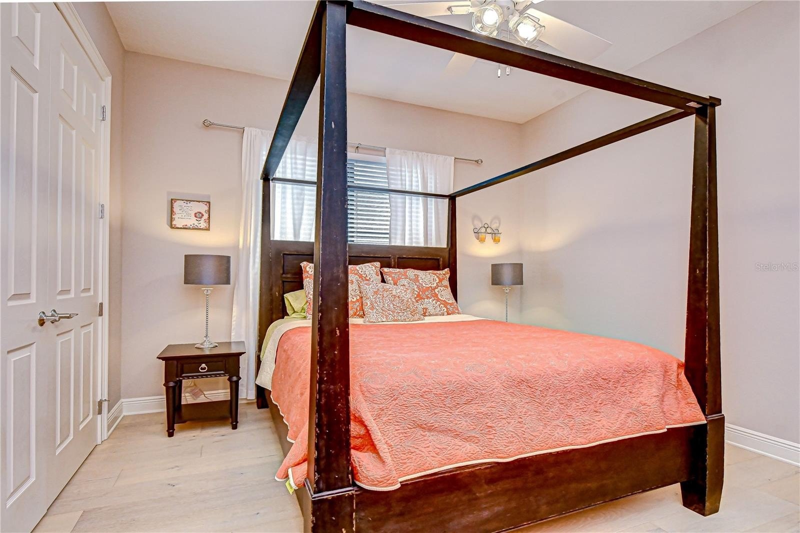 The private primary retreat is introduced by an elegant art niche entry and features a tray ceiling with crown molding, ceiling fan, and sitting area with French-door to the lanai. Dual custom walk-in closets lead to the spacious ensuite bath offering split vanities with quartz countertops, makeup space, soaking tub with tiled surround beneath a window with plantation shutters, walk-in shower with decorative Listello accents, private water closet, built-in shelving, and linen closet.