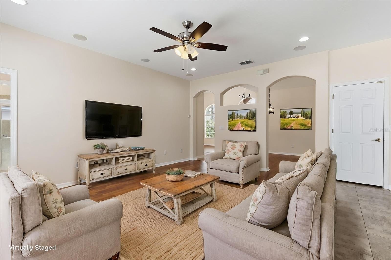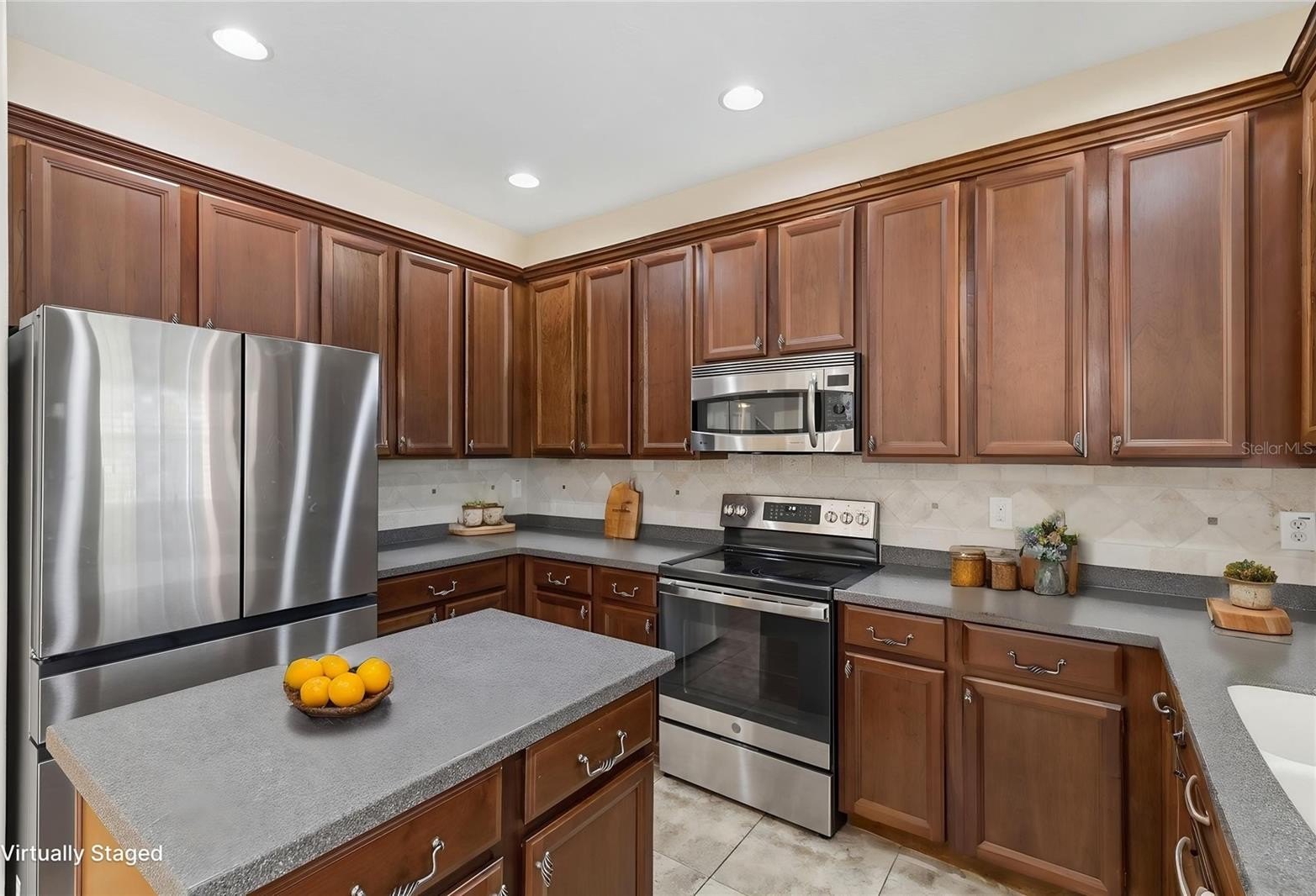 One or more photo(s) has been virtually staged. Welcome to your new home in the upscale gated community of Waters Edge. At 2,600+-sqft this beautifully maintained 5-bed/3-bath/3-car garage, 2-story home situated on a premium 60-foot wide conservation lot w/no rear neighbors, offers privacy and serene views. From the moment you arrive, you’ll appreciate the upgraded stone-accent elevation, luscious landscaping and decorative curbing. Step inside to discover a thoughtfully designed floor plan briming w/natural light from the multitude of windows featuring a formal living room w/vaulted ceilings and formal dining room both w/plank hardwood floors—perfect for entertaining/large gatherings. Move into the spacious family room also w/hardwood flooring and modern features like the in-wall cable management system and convenient floor-located recessed electrical outlet and sliders out to the extended lanai. In close proximity is the chef-friendly kitchen, showcasing solid wood cabinetry w/crown molding, stainless steel appliances, endless Corian countertops, center island, oversized walk-in pantry/storage closet and a cozy eat-in dining space. Main floor also includes 1 full sized bedroom and 1 full bath w/step-in shower and helpful grab bars and a nearby door which leads to the extended lanai, ideal for a future pool bath. Just off the kitchen finds the large laundry room which includes a utility sink and washer/dryer for added convenience. The second story finds the remaining sleeping quarters and the enormous bonus room all w/vaulted ceilings. The oversized primary suite is a private retreat featuring stately double door entry and a large attached sitting room, dual walk-in closets, and a luxurious en-suite bath complete w/dual sinks, garden tub, separate shower stall, and private water closet. You will also find 2 additional bedrooms and the 3rd bath which features dual sinks and a shower/tub combo. This versatile floor plan also includes a large bonus room/5th bedroom. This ideal flex space can be used as needed for a media room, playroom, home office or even a large bedroom complete w/2 closets. This home was made for outdoor living. Step outside to your extended screened-in lanai w/upgraded stone pavers which overlooks the large vinyl-fenced backyard—ideal for outdoor living, pets, or future pool plans—backing to peaceful conservation. There is also a separate patio w/stone pavers ideal spot for BBQ. Some additional features in the home include; New roof 2023, New AC 2019 (2), New water heater 2018, ALL NEW CARPETING, FRESHLY PAINTED INTERIOR, stylish ceramic tile in all wet areas, water softener, dual garage door openers, WiFi-thermostat, window blinds, ceiling fans, irrigation system, and more. This home offers the perfect blend of space, privacy, and functionality. Don’t miss this opportunity to make it yours. Waters Edge is one of Pasco County’s most desirable communities. Amenities include a 9000-sqft clubhouse, fitness center, grand swimming pool, kiddie pool, basketball/pickleball court, playground, picnic area, dual fishing piers and community boat dock leading to the spectacular 70-acre West Moon Lake at its center. The low HOA fee includes Spectrum cable/internet service and trash collection and the entire community has reclaimed water for irrigation. Located in West Pasco County Waters Edge is in a prime location, close to shops, restaurants, schools and hospitals and only minutes from the Veterans Expressway for an easy commute to downtown Tampa and TIA.