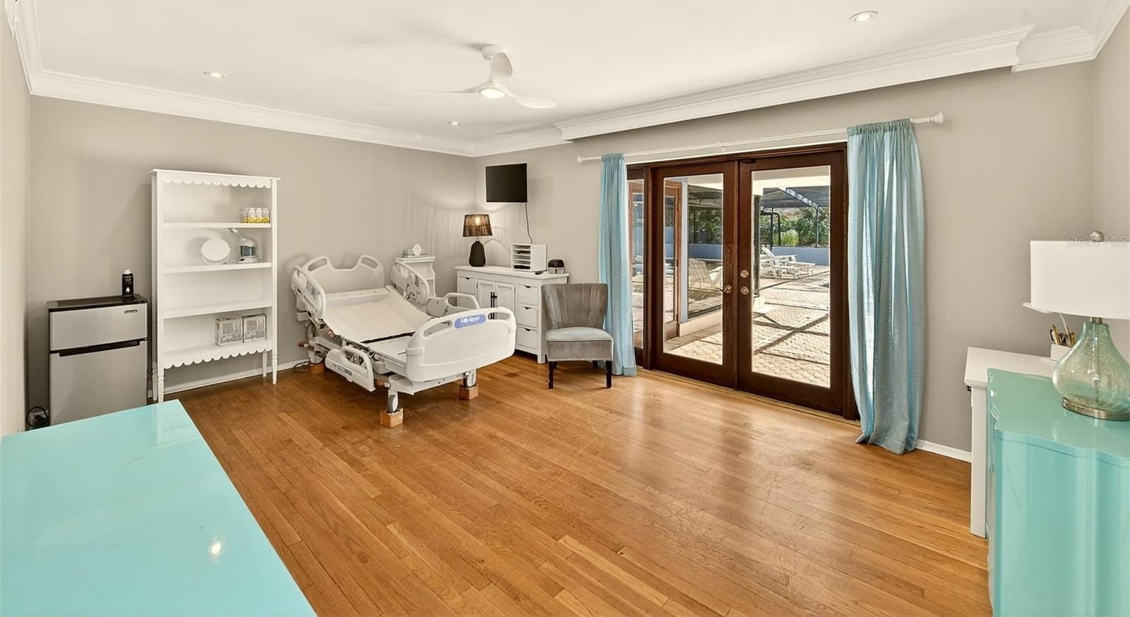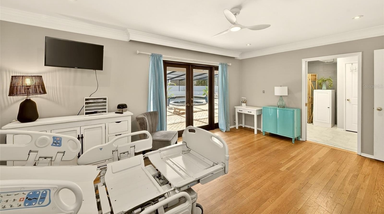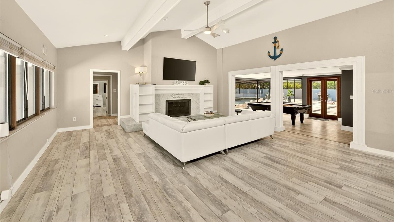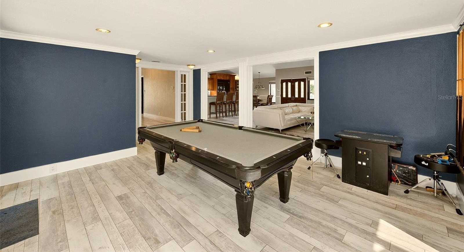 The secluded primary suite is tucked away on its own wing of the home with vaulted ceilings and direct access to the pool and lanai, creating a true private retreat. In total, three bedrooms enjoy peaceful views of the pool, including a private suite with a full bath designed with accessibility in mind, featuring a curbless roll-in shower and open layout—ideal for extended family, guests, or live-in care. A dedicated game room with billiards table overlooks the pool and opens directly to the lanai, creating seamless indoor-outdoor living and entertaining.