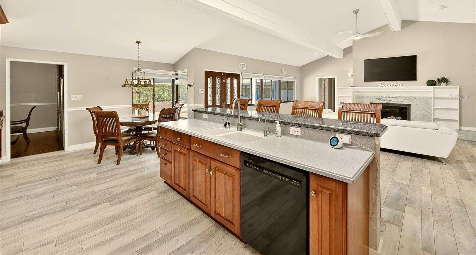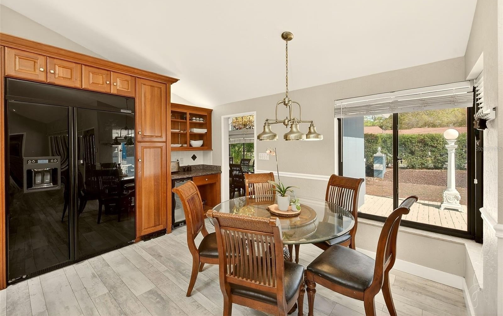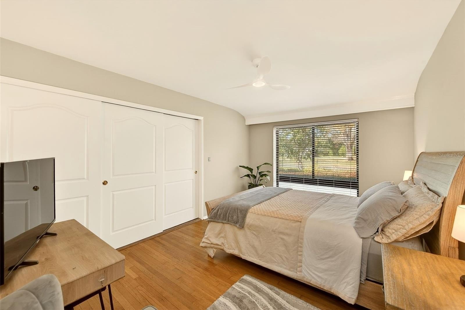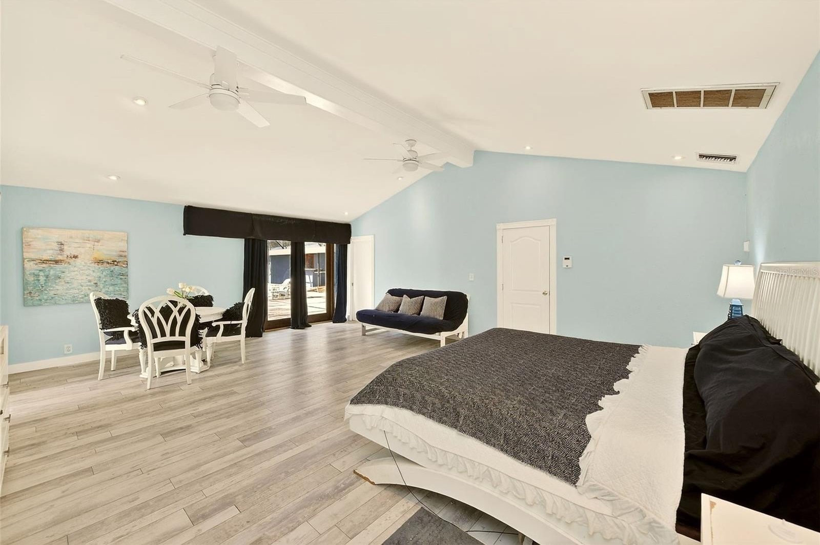 The secluded primary suite is tucked away on its own wing of the home with vaulted ceilings and direct access to the pool and lanai, creating a true private retreat. In total, three bedrooms enjoy peaceful views of the pool, including a private suite with a full bath designed with accessibility in mind, featuring a curbless roll-in shower and open layout—ideal for extended family, guests, or live-in care. A dedicated game room with billiards table overlooks the pool and opens directly to the lanai, creating seamless indoor-outdoor living and entertaining.