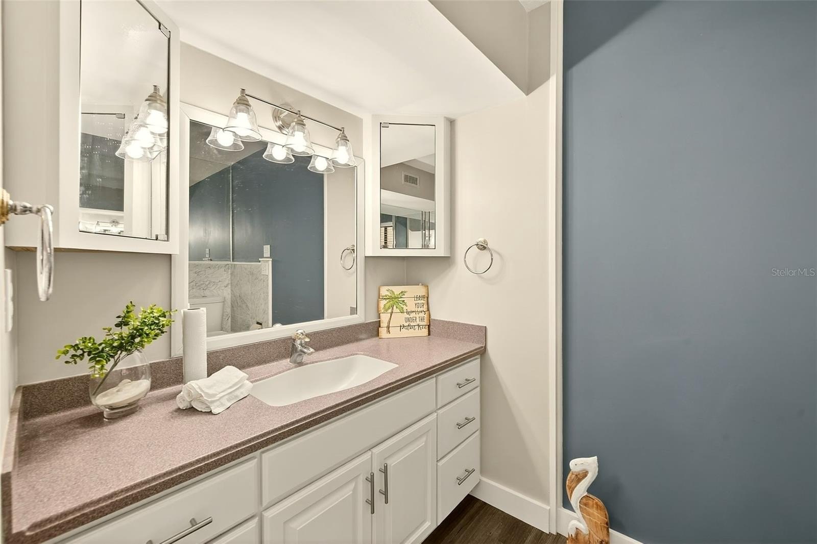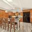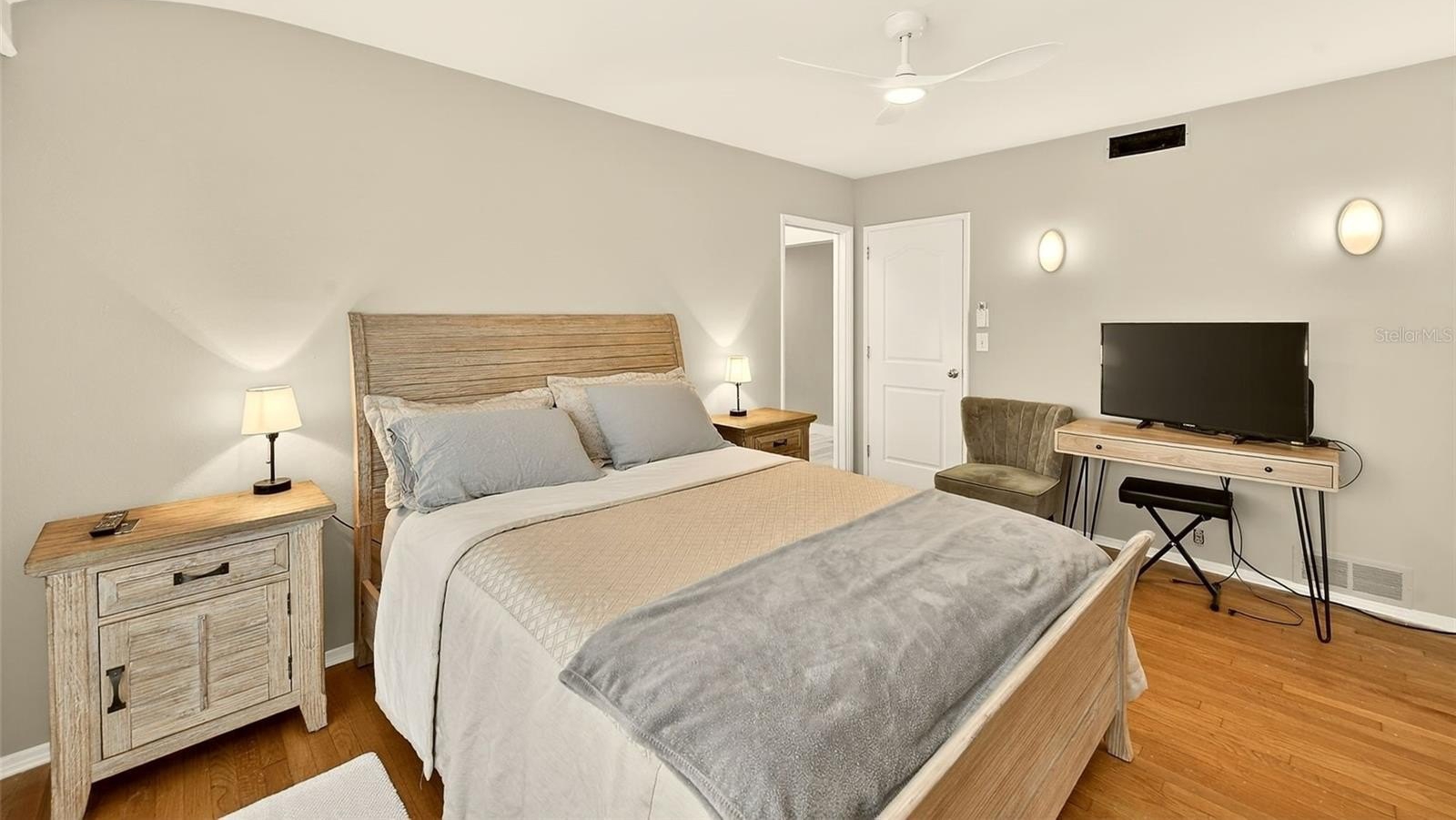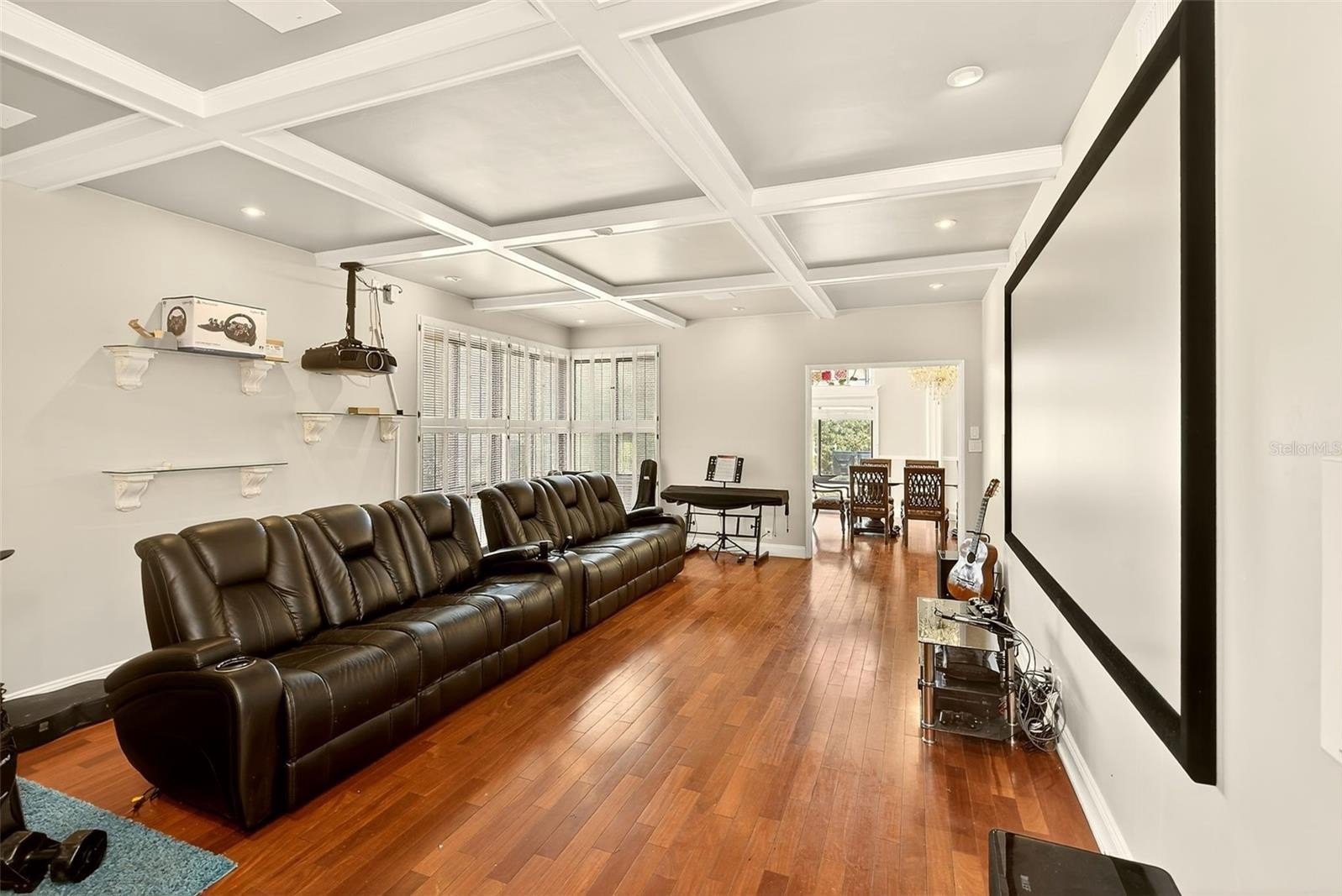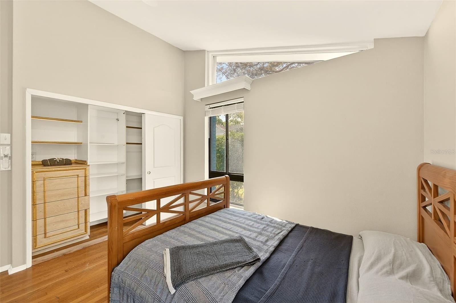 The secluded primary suite is tucked away on its own wing of the home with vaulted ceilings and direct access to the pool and lanai, creating a true private retreat. In total, three bedrooms enjoy peaceful views of the pool, including a private suite with a full bath designed with accessibility in mind, featuring a curbless roll-in shower and open layout—ideal for extended family, guests, or live-in care. A dedicated game room with billiards table overlooks the pool and opens directly to the lanai, creating seamless indoor-outdoor living and entertaining.
