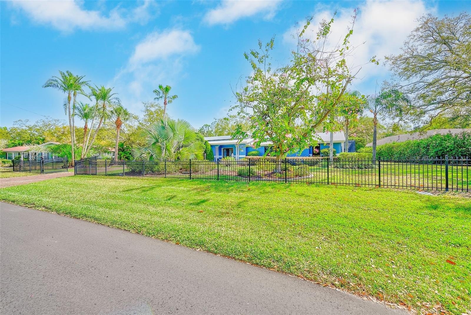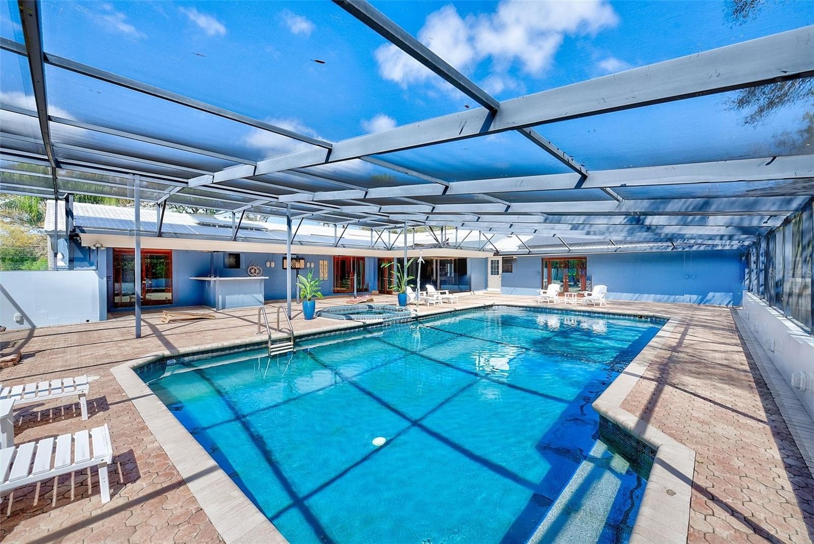 Outdoors, the property transforms into a true backyard oasis with a large screened pool courtyard featuring a 20x40 pool reaching approximately 9 feet in depth, a spillover spa, expansive paver deck space, poolside bar, fire pit, and multiple patio areas designed for entertaining and relaxation. The grounds are secured with double fencing, featuring wrought iron fencing at the front of the property and a solid wall fence surrounding the backyard for added privacy.