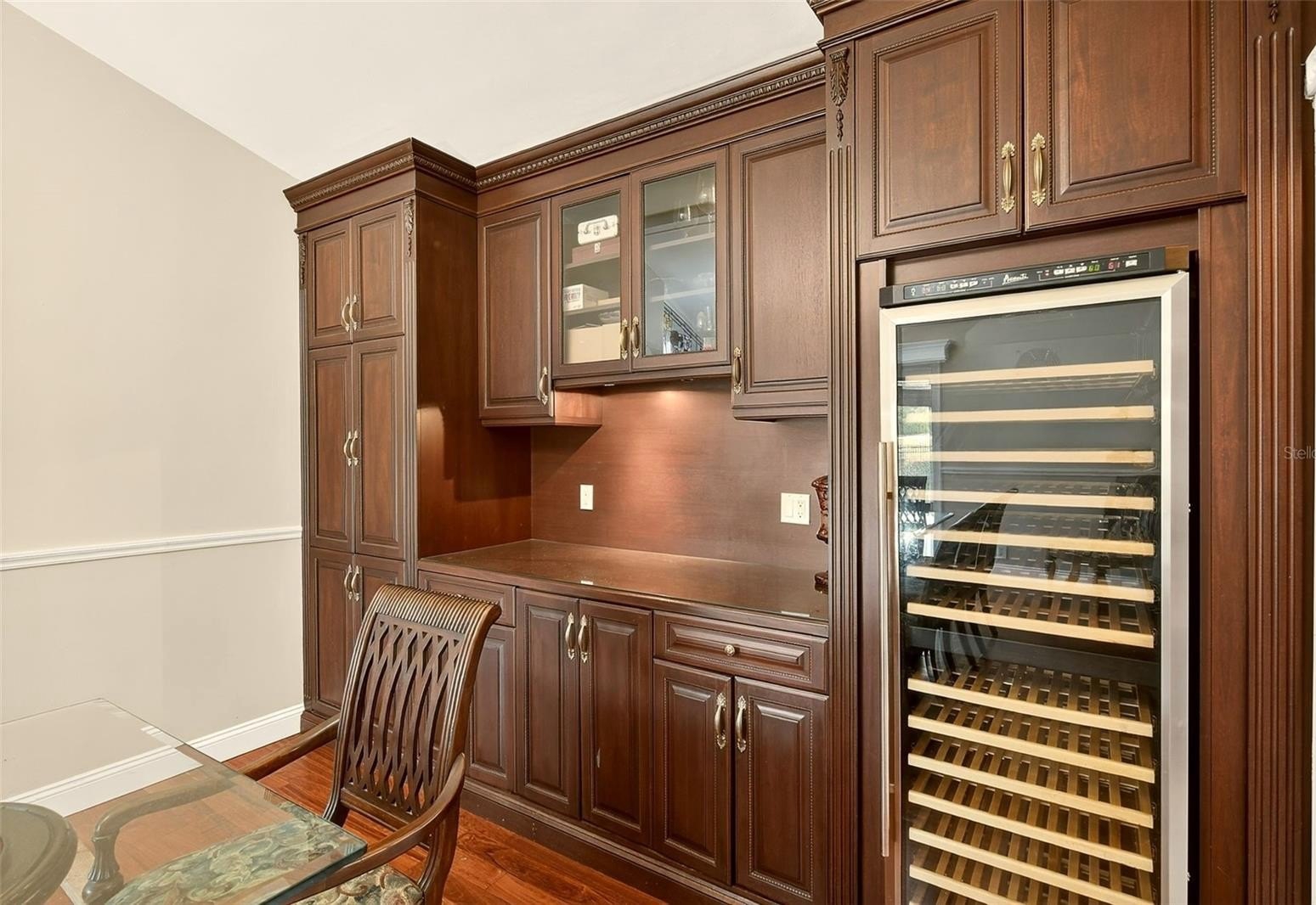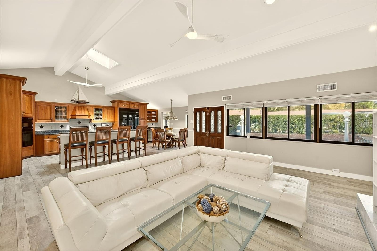 The thoughtfully designed floor plan features formal living and dining rooms, a spacious family room with a wood-burning fireplace and fully rebuilt chimney, and a large media/game room. Architectural details including vaulted ceilings, exposed beams, skylights, and custom trim bring natural light and character throughout the home’s living spaces. The updated kitchen is ideal for both everyday living and entertaining, featuring custom cabinetry, stone counters, high-end appliances, beverage center, wine storage, and the convenience of instant hot water at the sink.