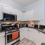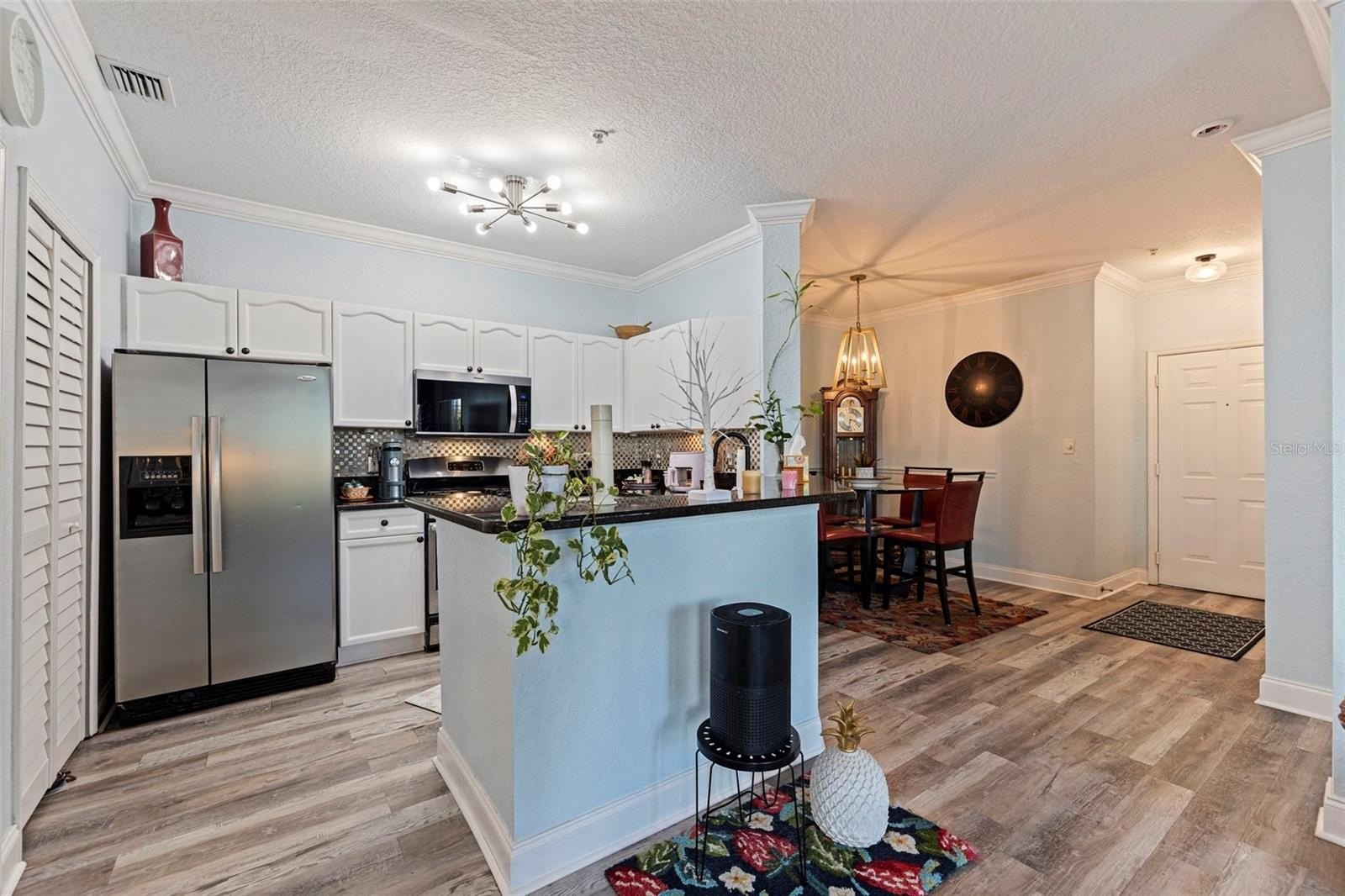 • A large open kitchen with white cabinetry and stainless-steel appliances