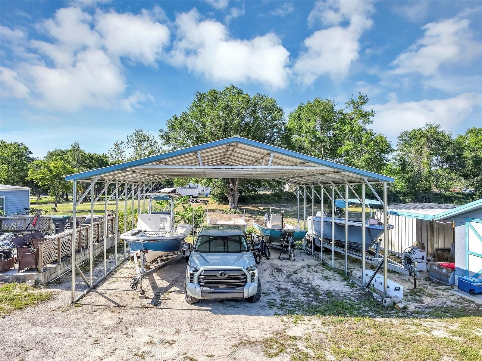 Welcome to your idyllic county retreat, nestled on 4.28 acres. This charming residence offers the perfect blend of comfort, functionality, and natural beauty. The spacious 3-bedroom double-wide home, renovated from top to bottom, features luxury laminate throughout, granite countertops, new windows and doors, and a new 5-ton AC. The expansive concrete pad with railing is ideal for entertaining and relaxation. Additionally, a new 30x35 metal-covered parking area accommodates your RV or boat, and a block building features a garage and a spacious shed for your tools. Zoned Agricultural, this property offers endless possibilities, located just a few miles from downtown Mt. Dora and 20 minutes from Orlando. Whether you're seeking to cultivate a homestead, enjoy a peaceful rural lifestyle, or create your own private haven, this property is yours. Schedule your appointment today to own this countryside paradise.