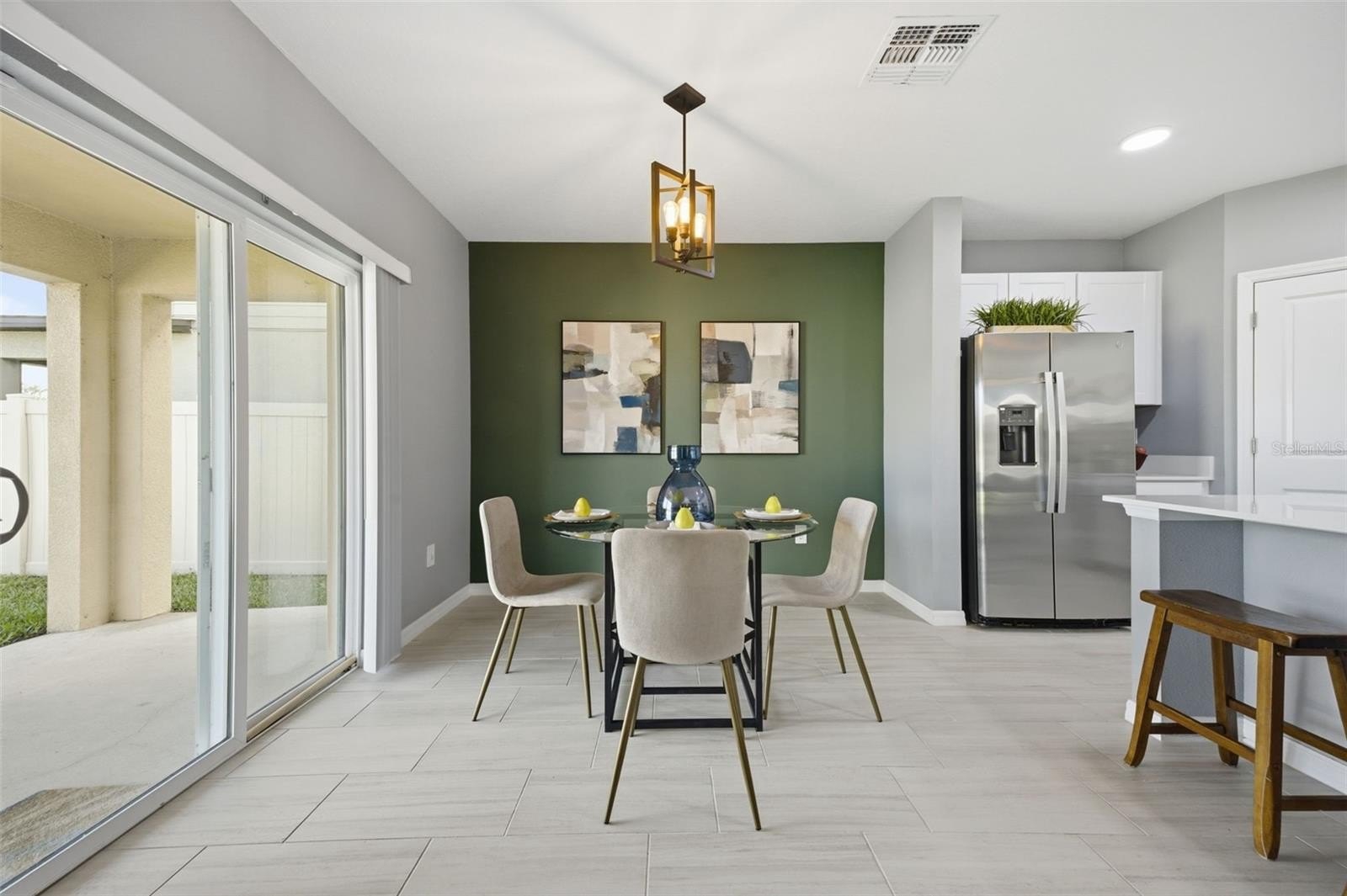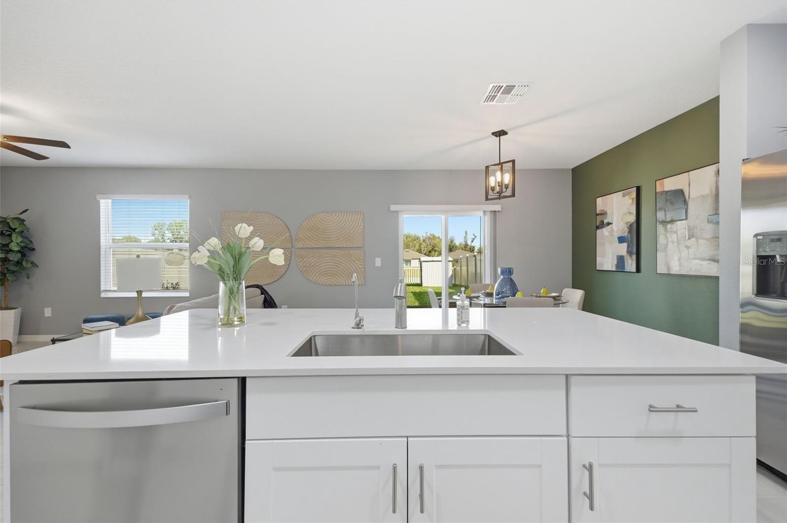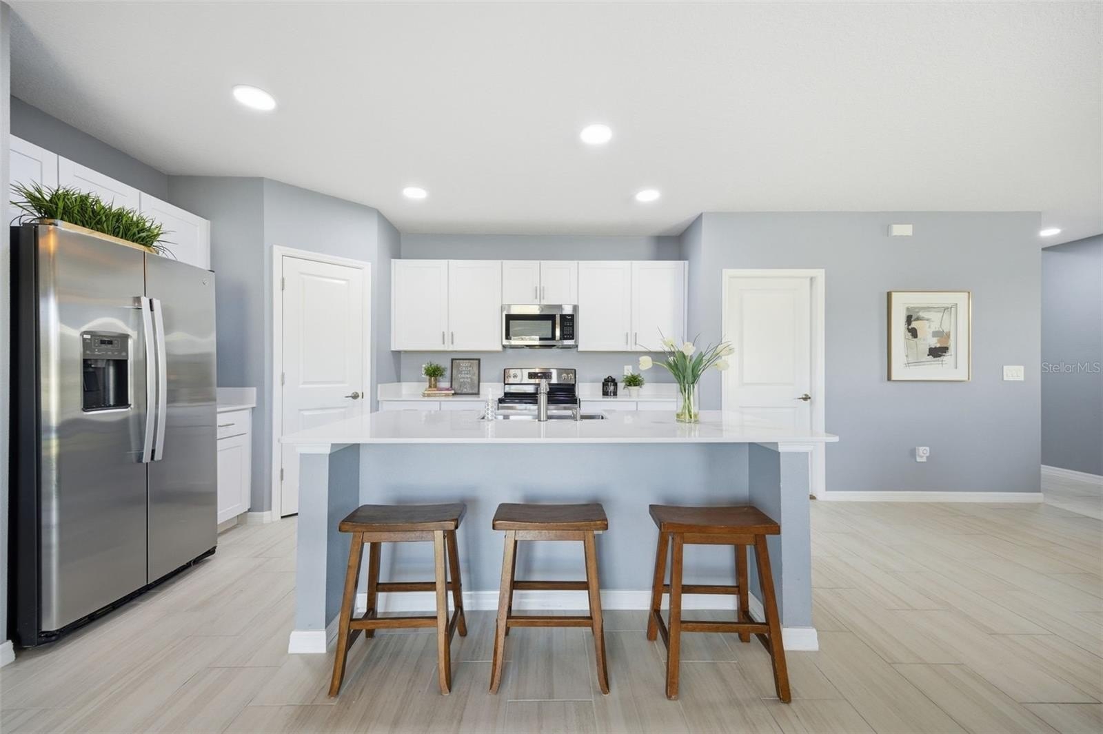 As you enter through the expansive foyer, you are drawn into the heart of the home—a bright kitchen and living room combination. This space features gleaming tile floors throughout, designed for seamless entertaining. The chef’s kitchen is a highlight, offering: An oversized island with counter-height seating and additional storage, lustrous quartz countertops paired with modern white shaker cabinetry and a true true walk-in pantry and stainless steel appliances