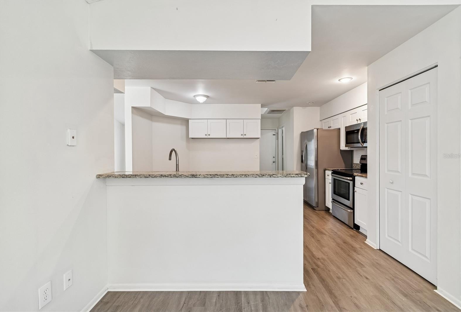 Step into an oversized covered lanai and pool area, ideal for relaxing, hosting friends, or enjoying Florida’s sunshine and summer showers, with large sliders connecting the outdoor space seamlessly to the interior. The kitchen features quartz countertops, ample cabinetry, and a natural flow into the dining and family areas. A dedicated laundry room is conveniently located just off the kitchen.