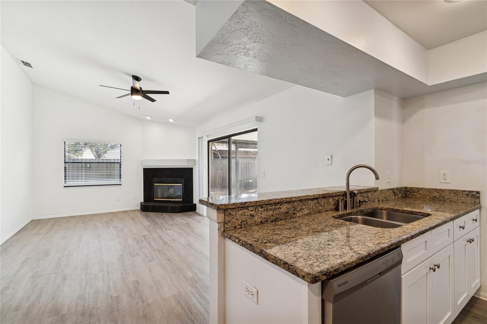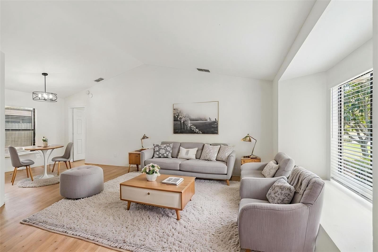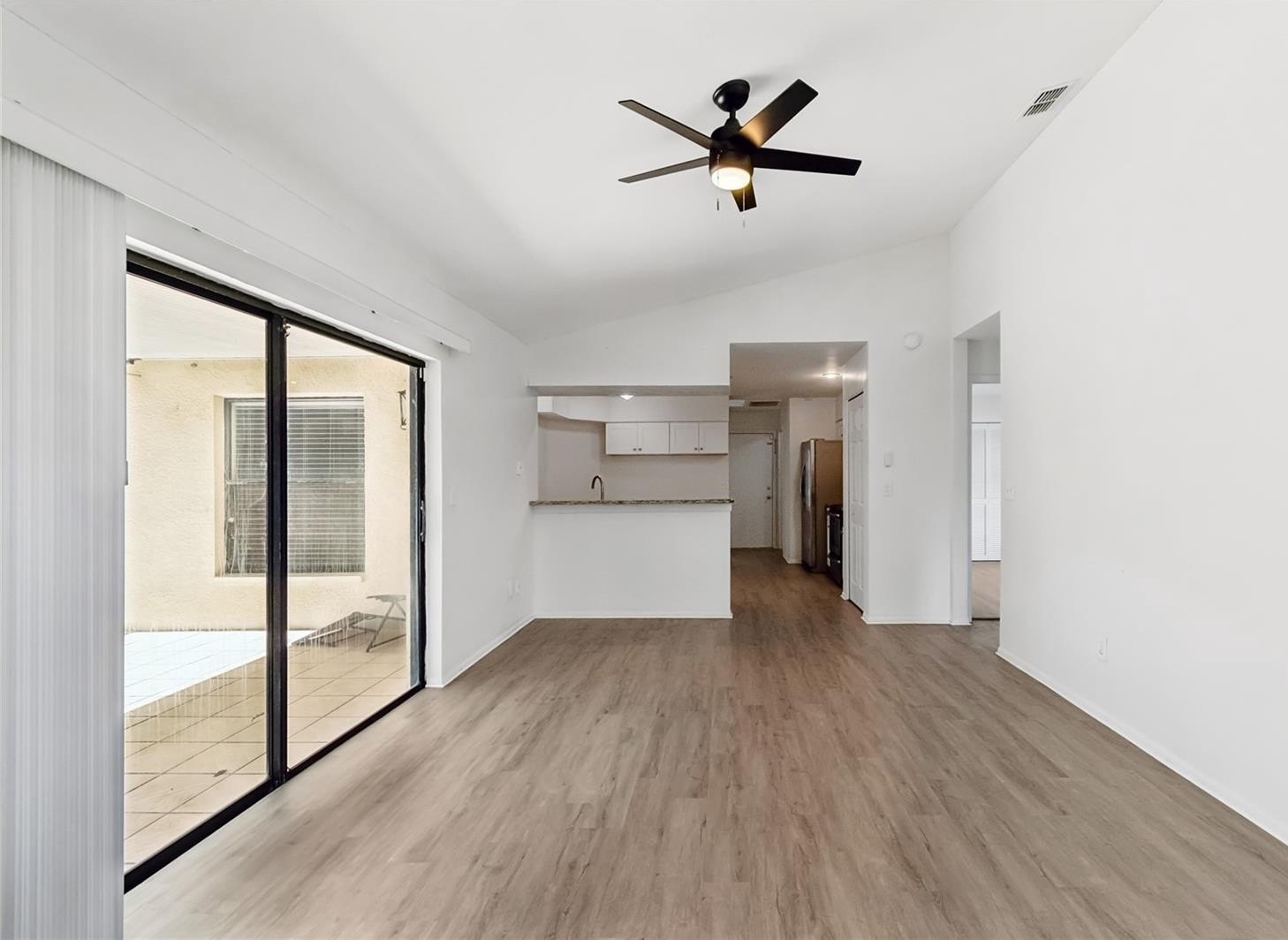 Inside, enjoy an open floor plan with vaulted ceilings, generous natural light, and new laminate flooring throughout the main living areas—perfect for everyday living and entertaining. The family room is centered around a wood-burning fireplace, creating a warm and inviting gathering space and open to the open space for outdoor dining.