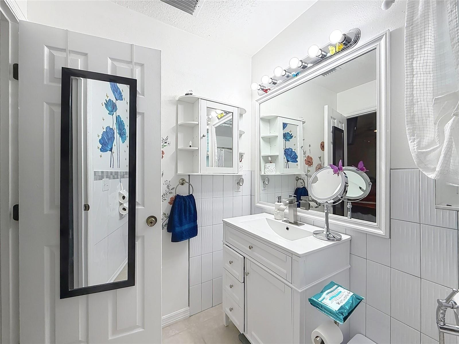 The primary bedroom includes a walk-in closet and a sliding glass door leading directly to the patio. The primary bathroom features a handicap accessible walk-in shower designed for wheelchair use. Both bathrooms are bright and spacious, and ceiling fans are installed in every bedroom as well as the living room for added comfort.